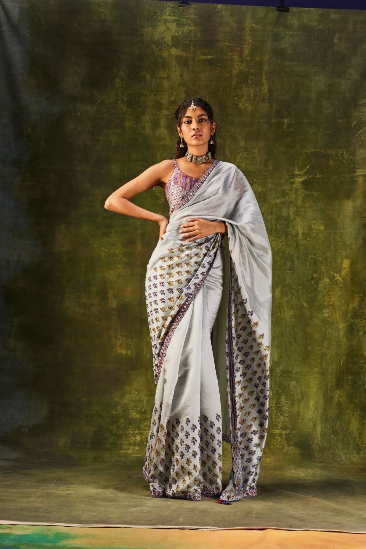 Grey Block Printed Organza Silk Saree Embroidered With Mirror And Resham Paired With Resham Work Strappy Blouse