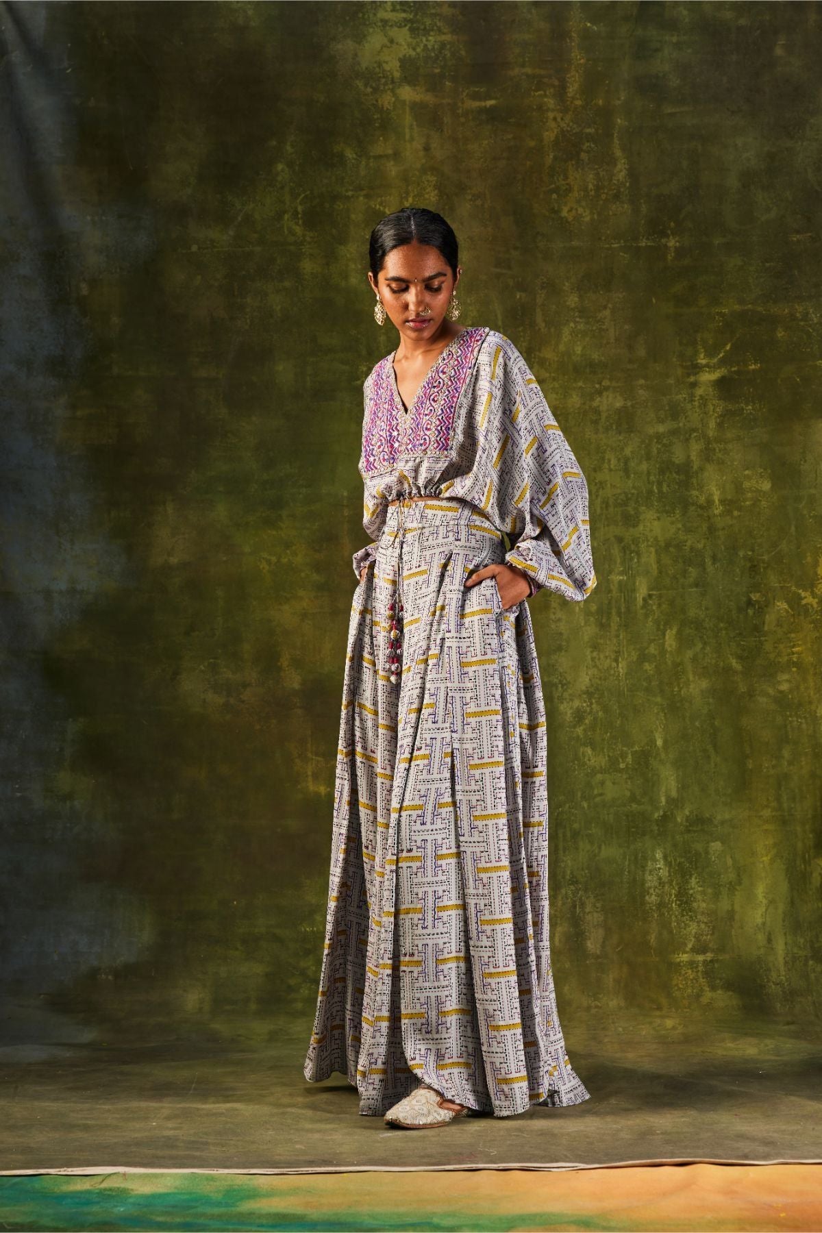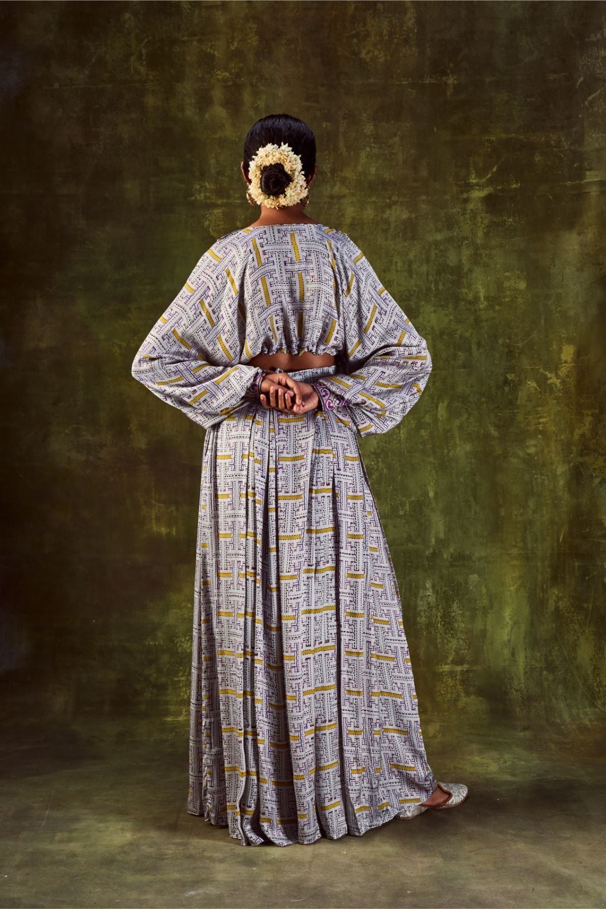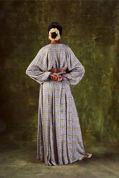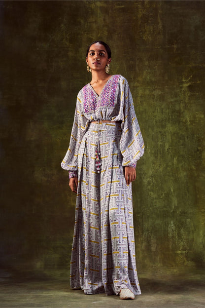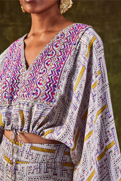 Grey Printed Wide Leg Pants and Crop Top With Mirror And Resham Work On The Neck And Cuff