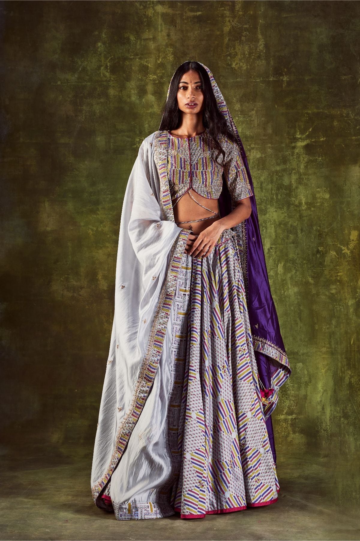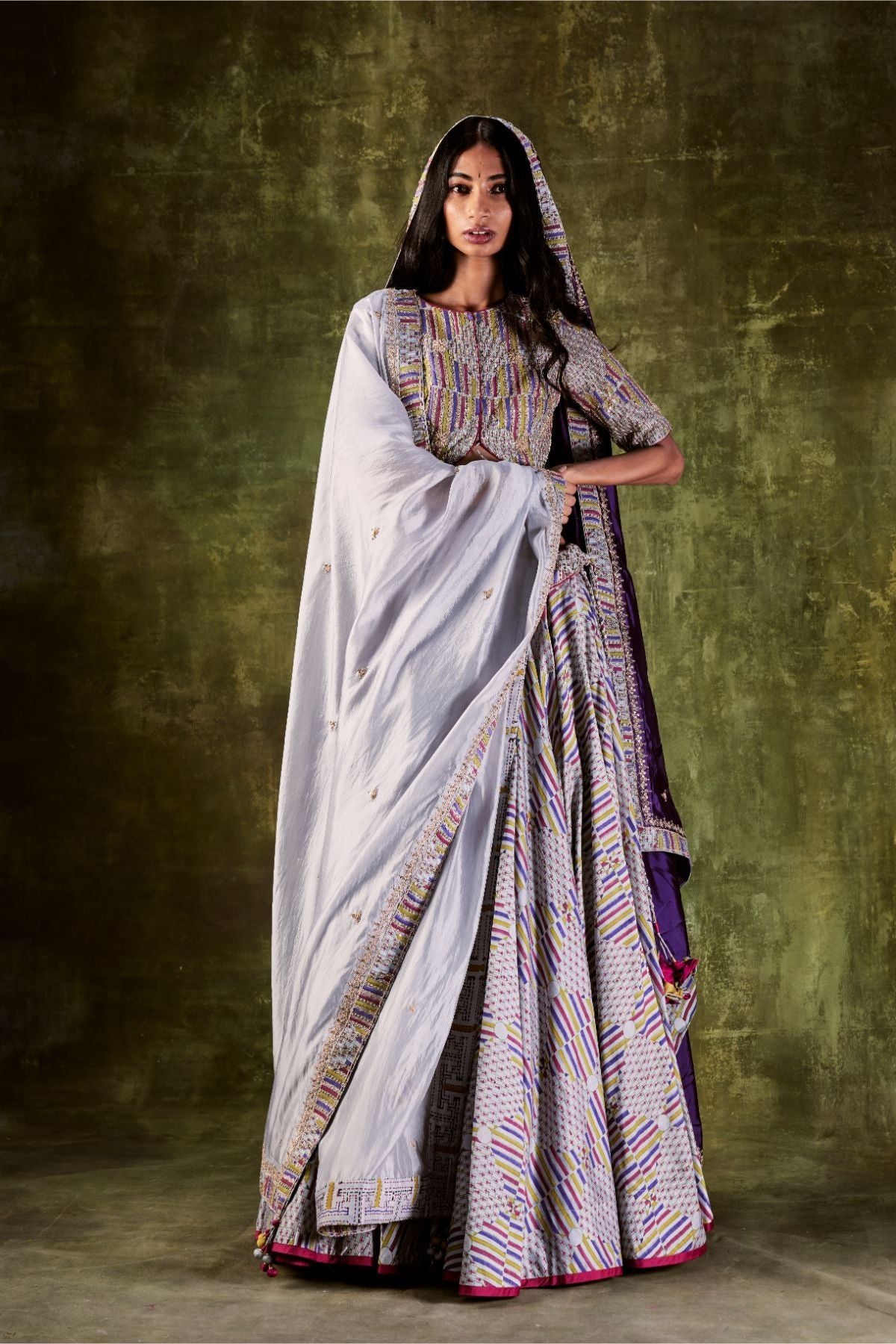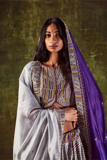 Grey Hand Block Printed Lehenga Paired With Printed Handwork Front Tie Up Blouse And Organza Silk Dupatta