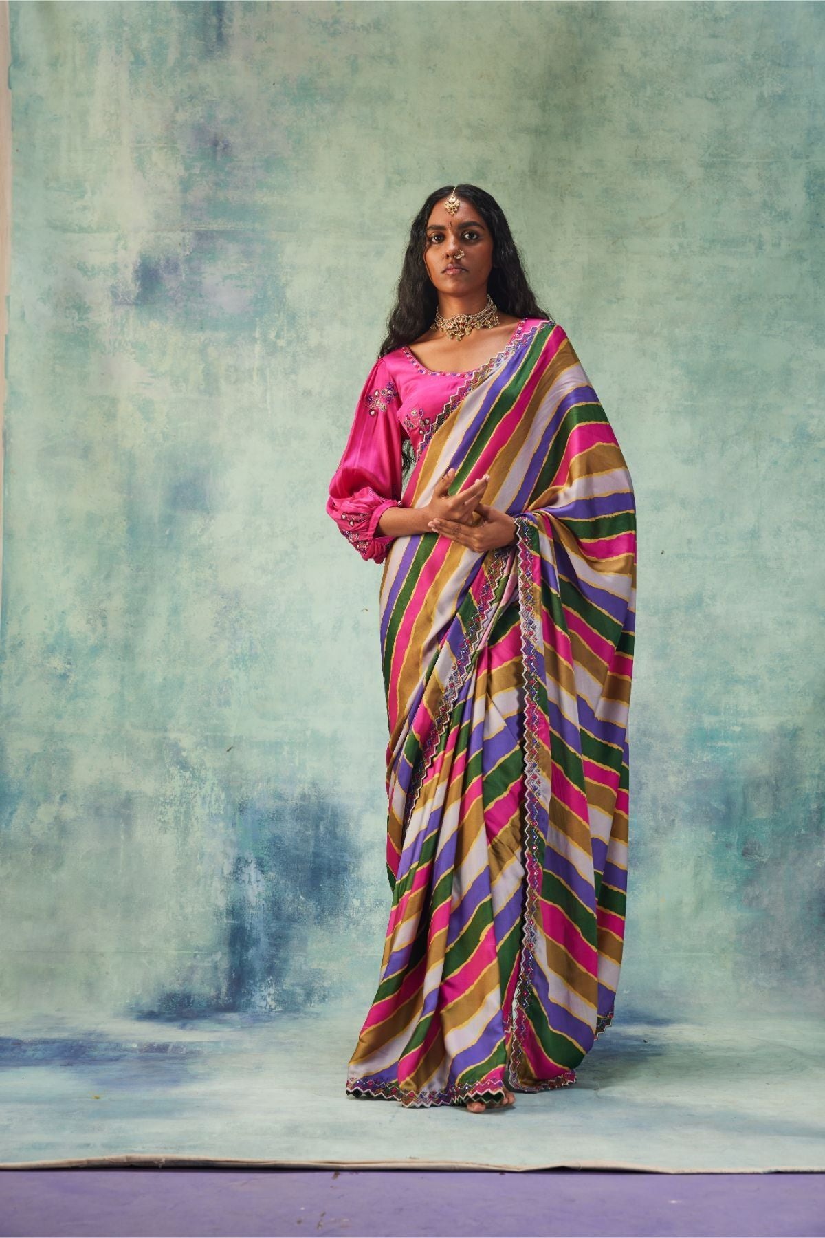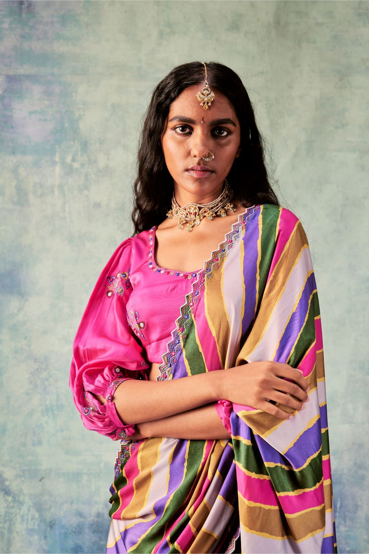 Pink And Grey Stripes Printed Saree Paired With Pink Satin Silk Blouse