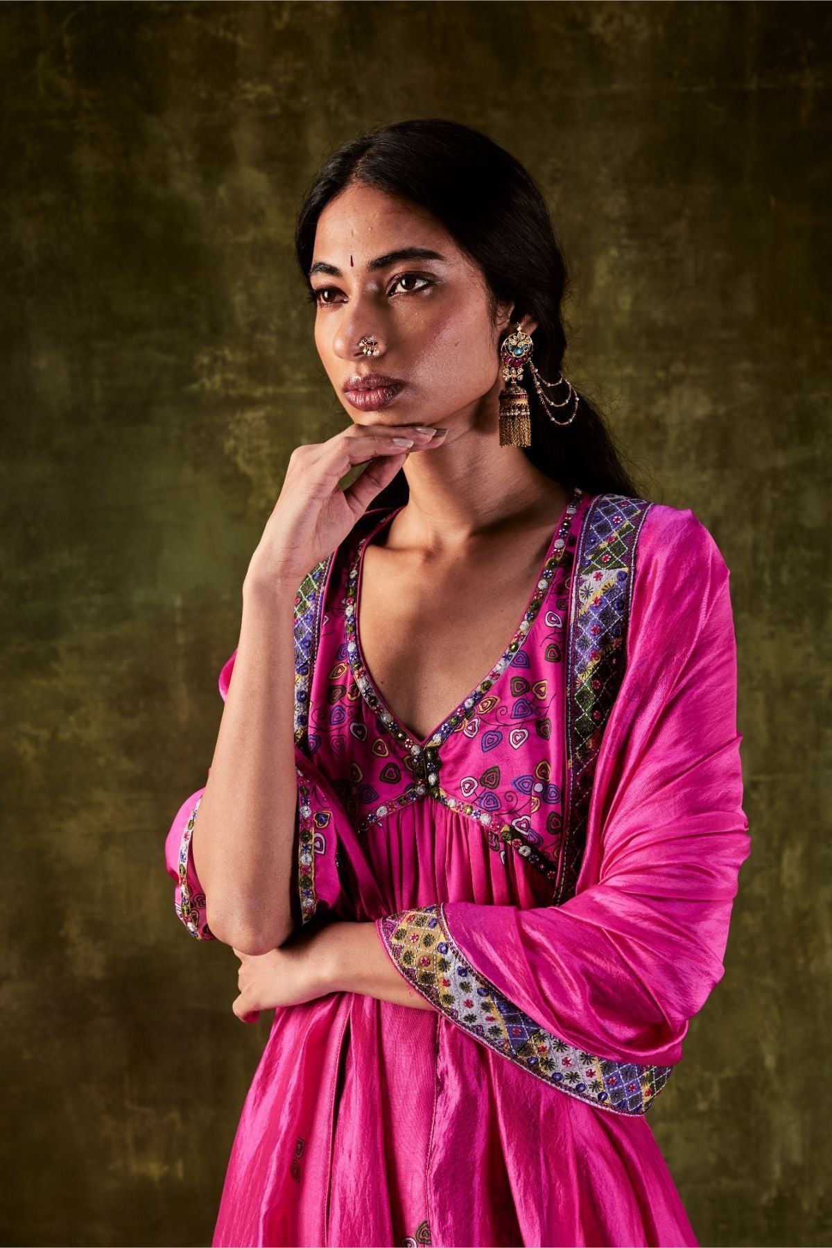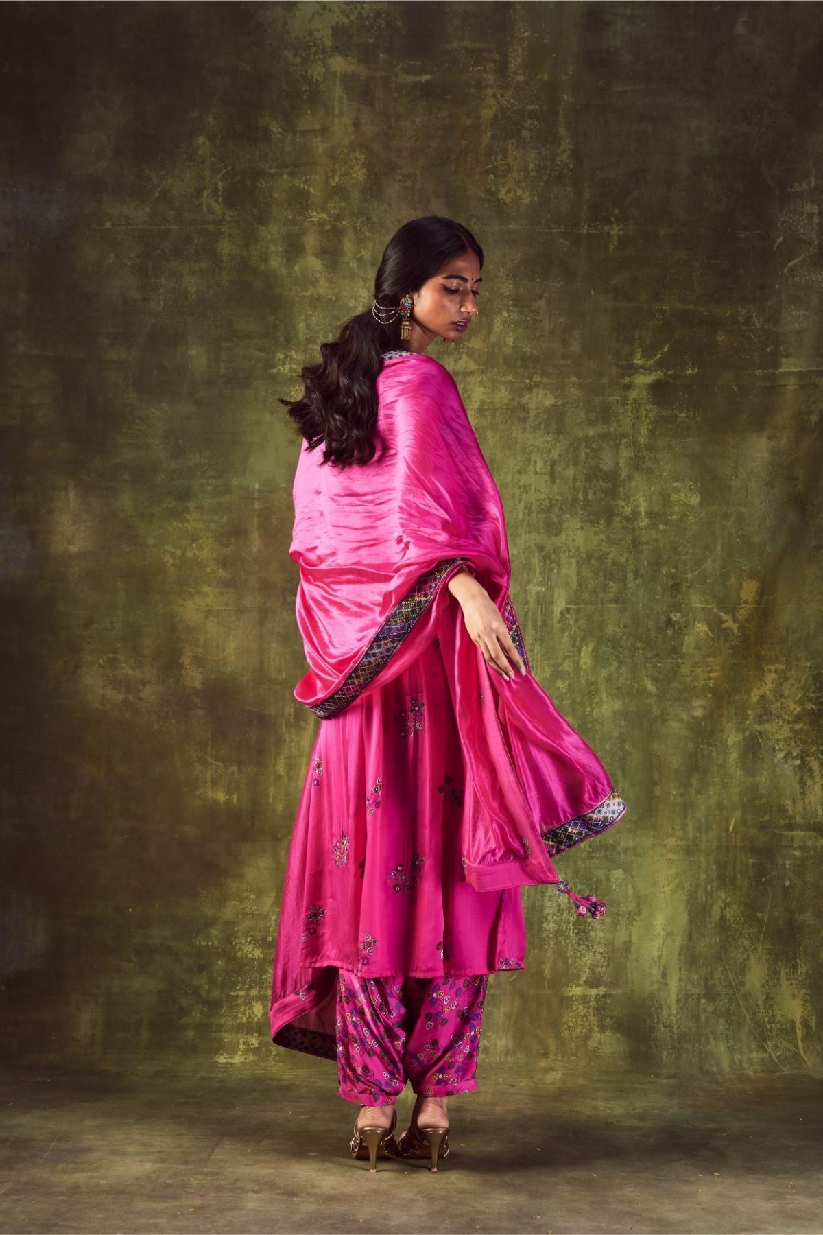 Pink Printed Satin Silk Printed Anarkali Set With Dupatta & Cowl Pants