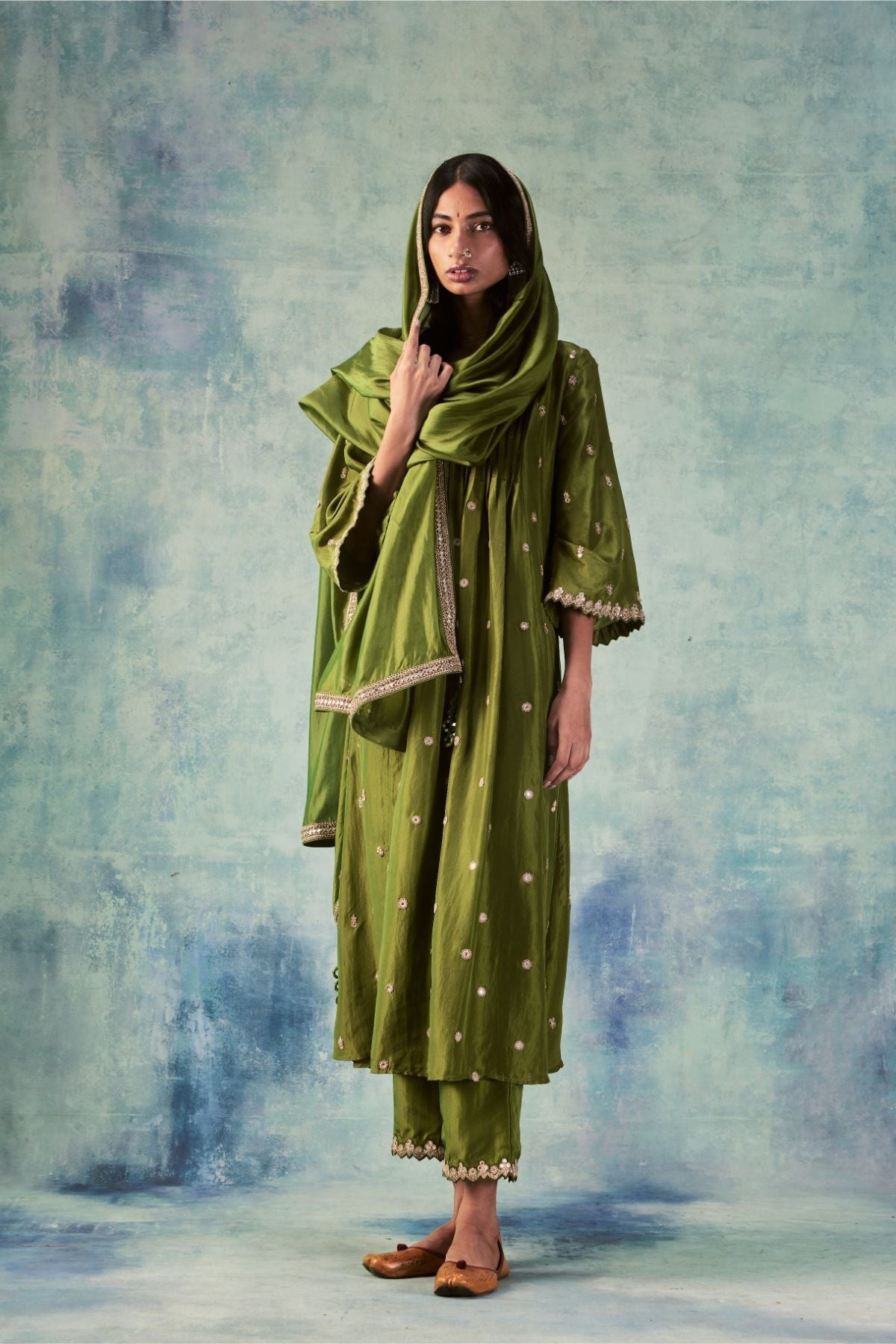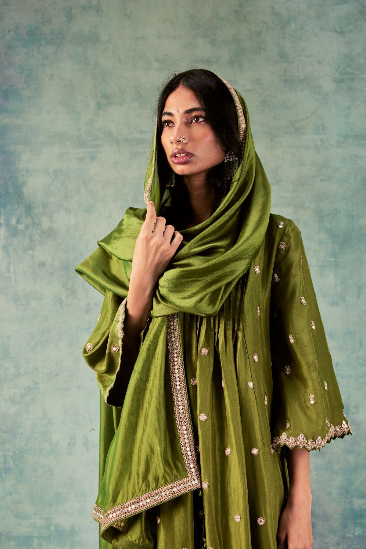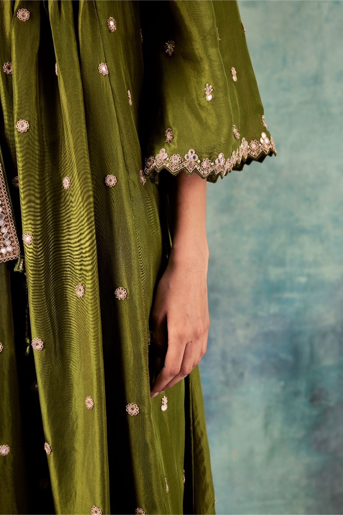 Olive Green Anarkali Set Embroidered With Dori & Mirror Work Paired With Organza Silk Dupatta & Pants