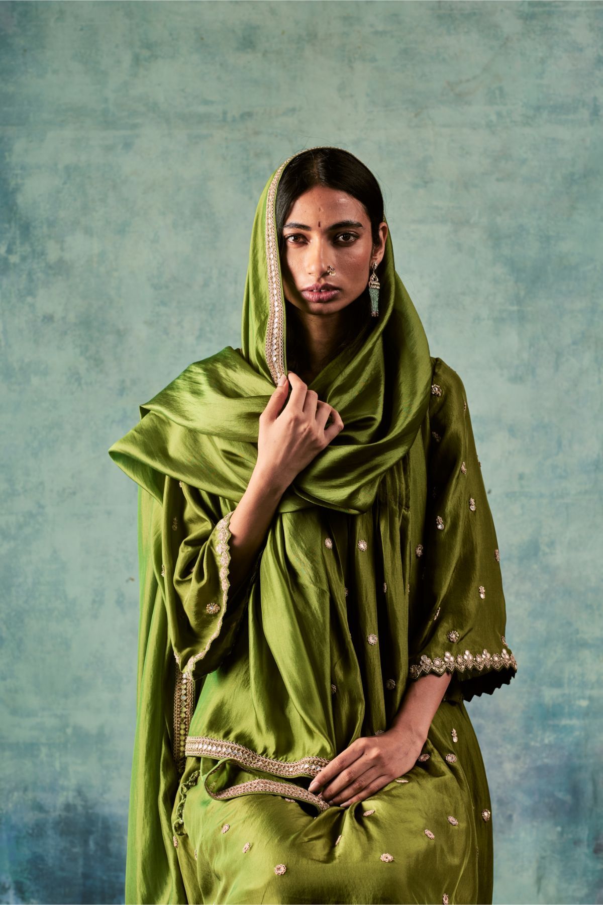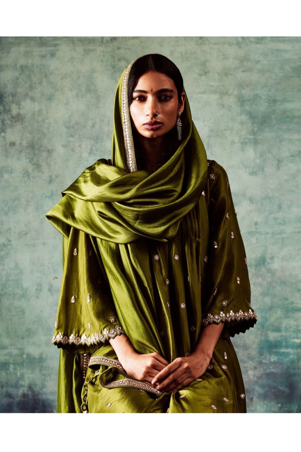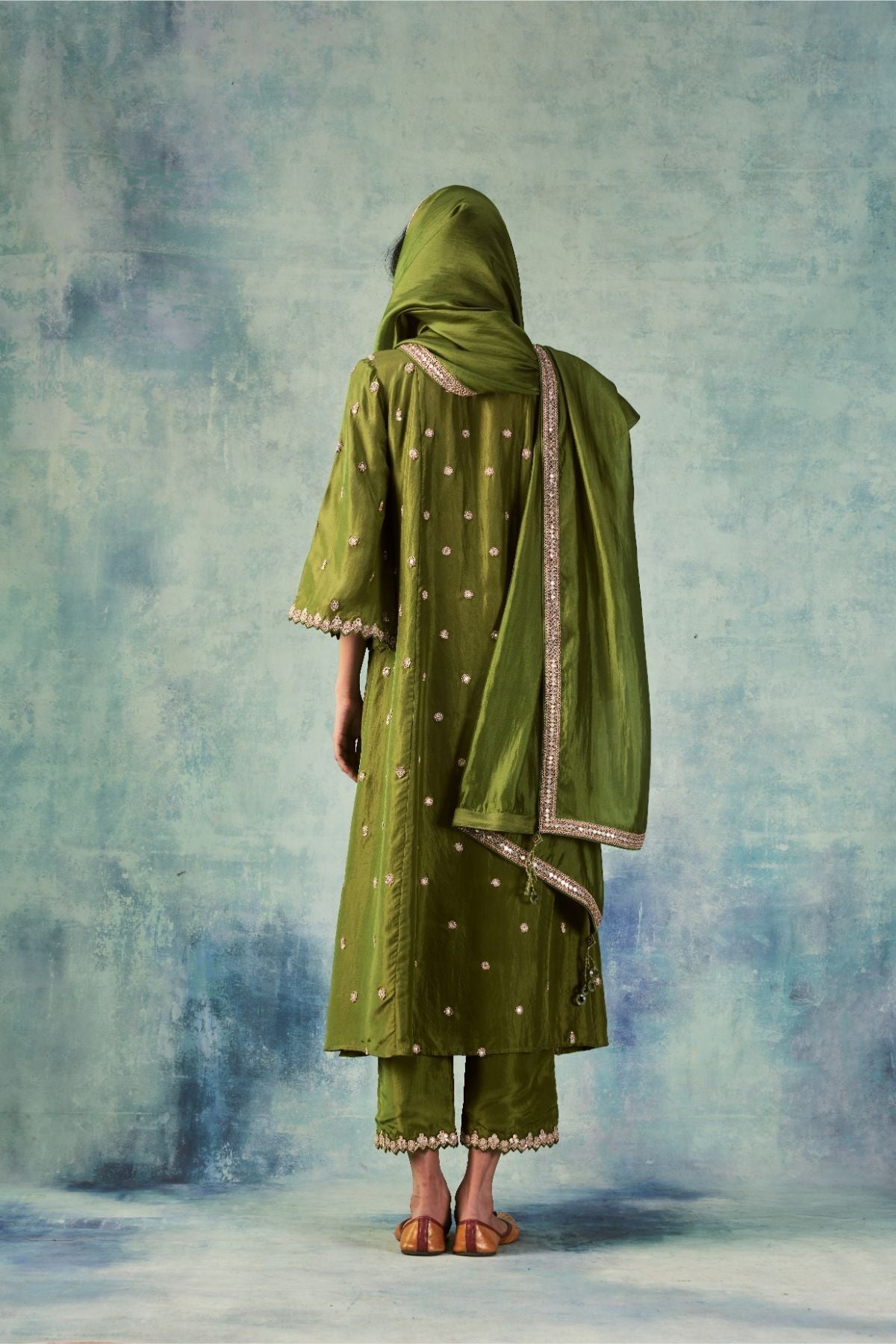 Olive Green Anarkali Set Embroidered With Dori & Mirror Work Paired With Organza Silk Dupatta & Pants