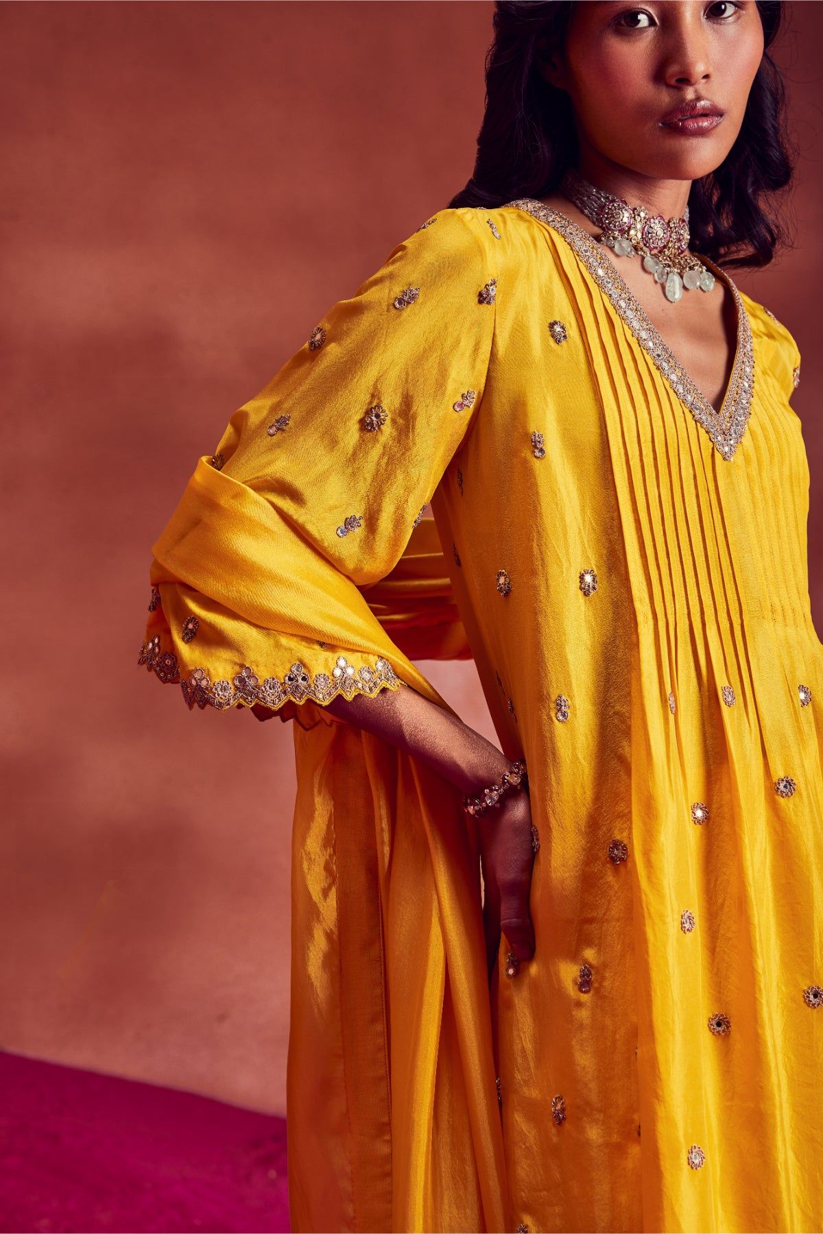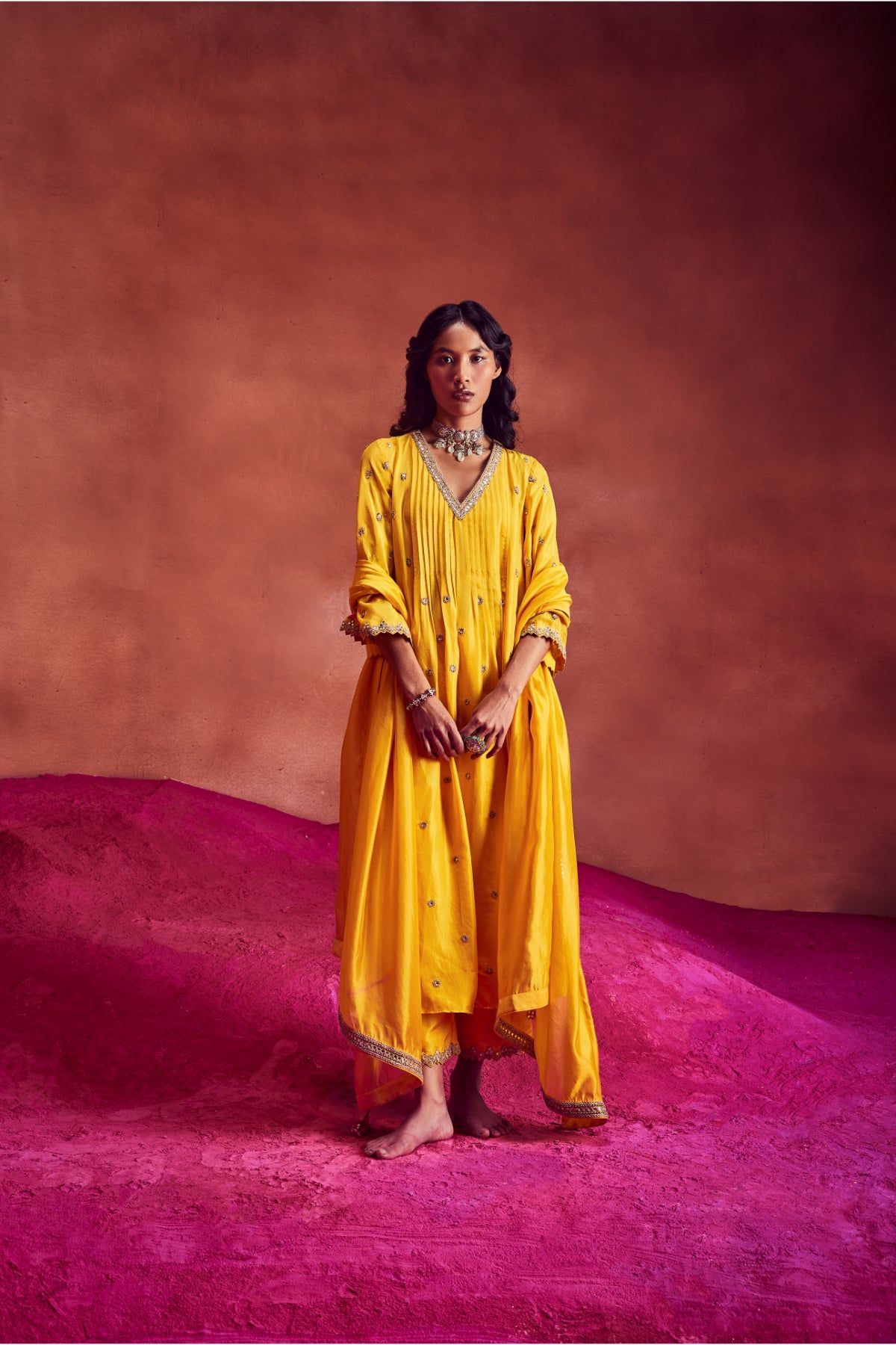 Yellow Anarkali Highlighted With Marodi & Zardozi Work Paired With Dupatta & Pants