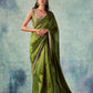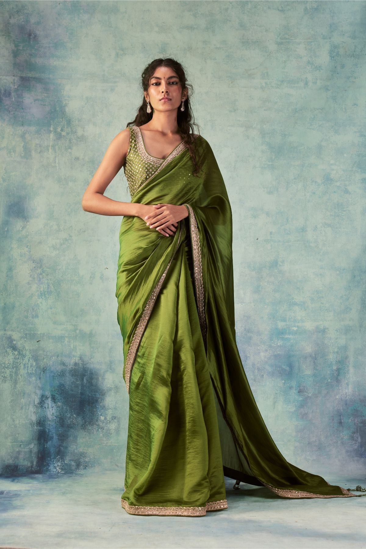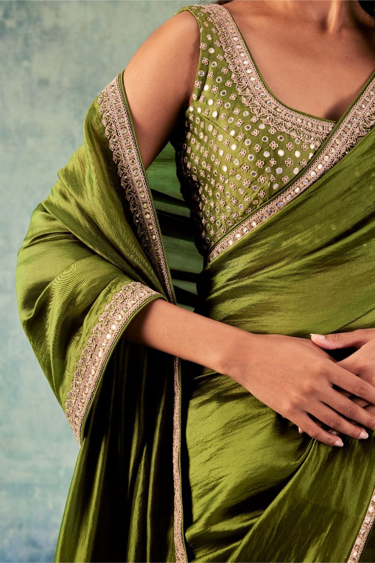 Olive Green Organza Silk Saree Set With Dori & Mirror Work Embroidered Blouse