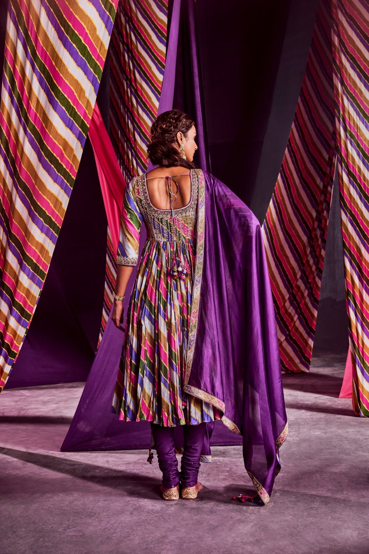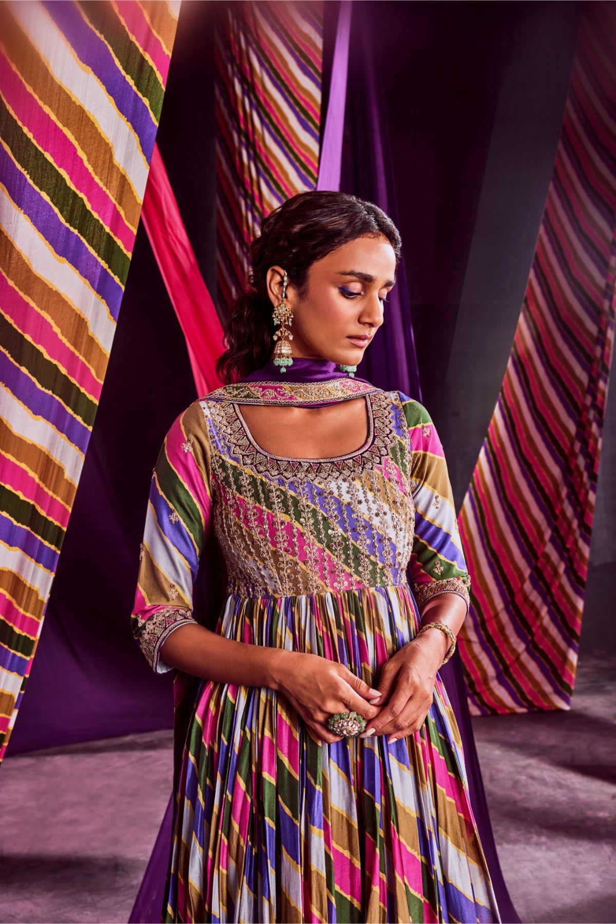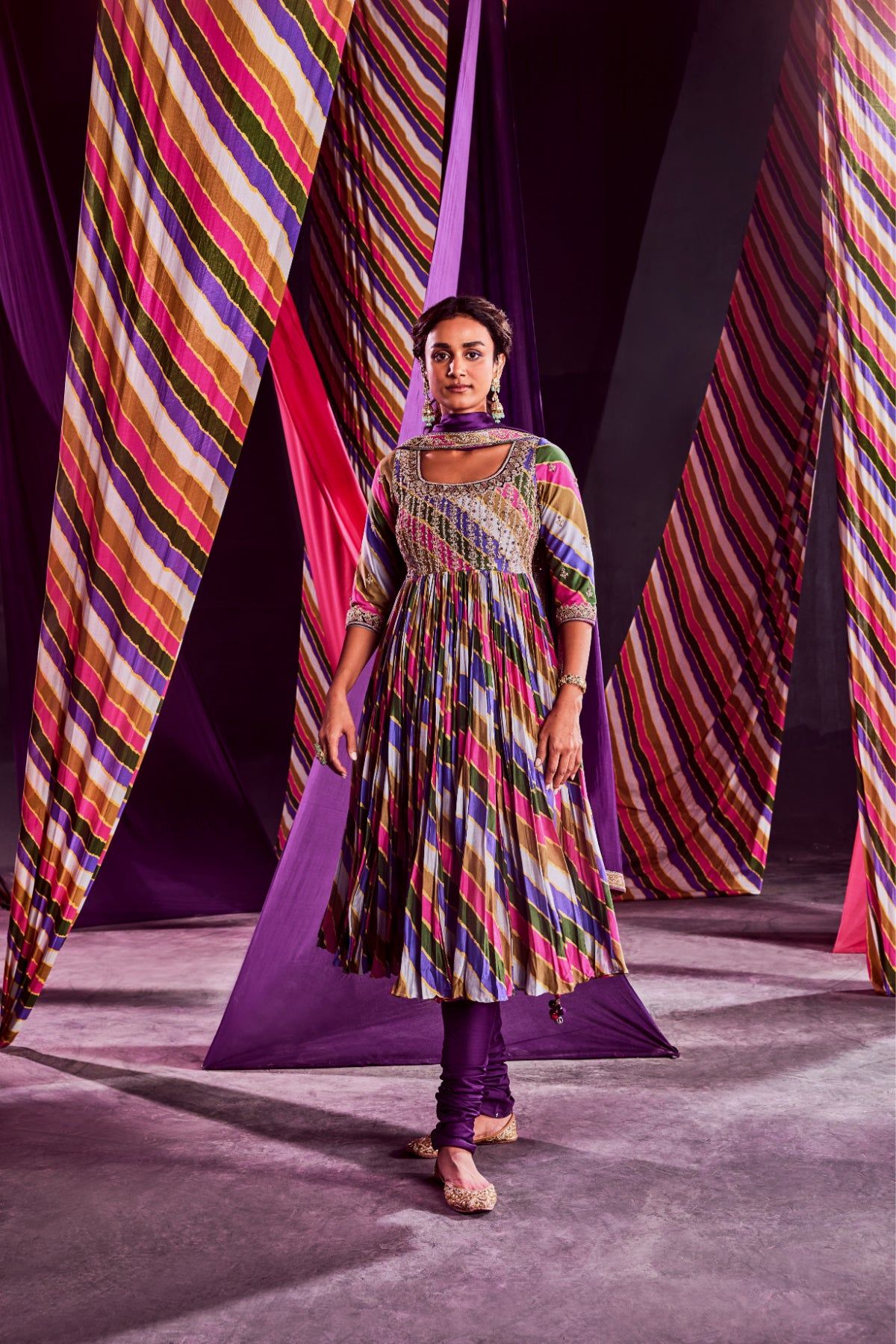 Stripes Printed Anarkali With Heavy Marodi & Zardozi Work Yoke Paired With Dupatta & Churidar