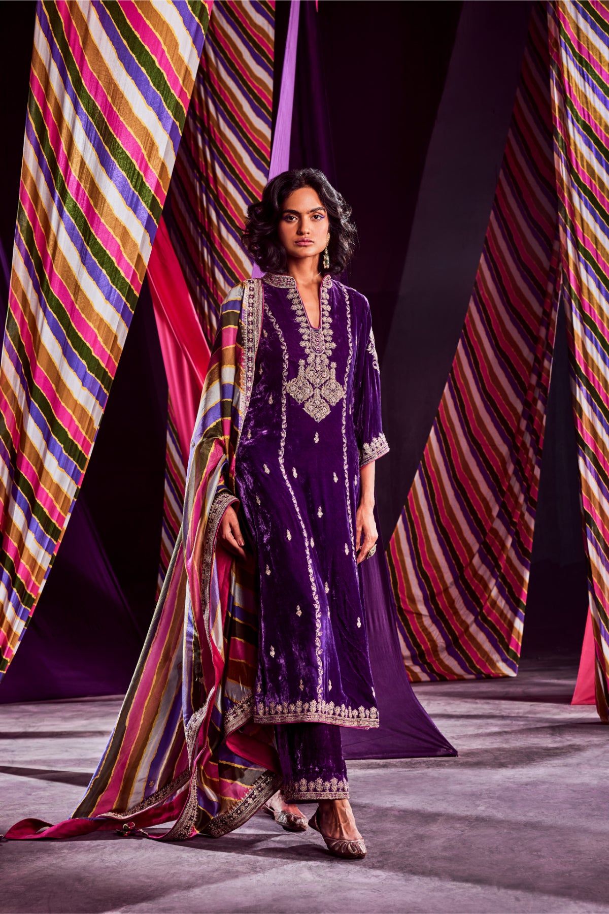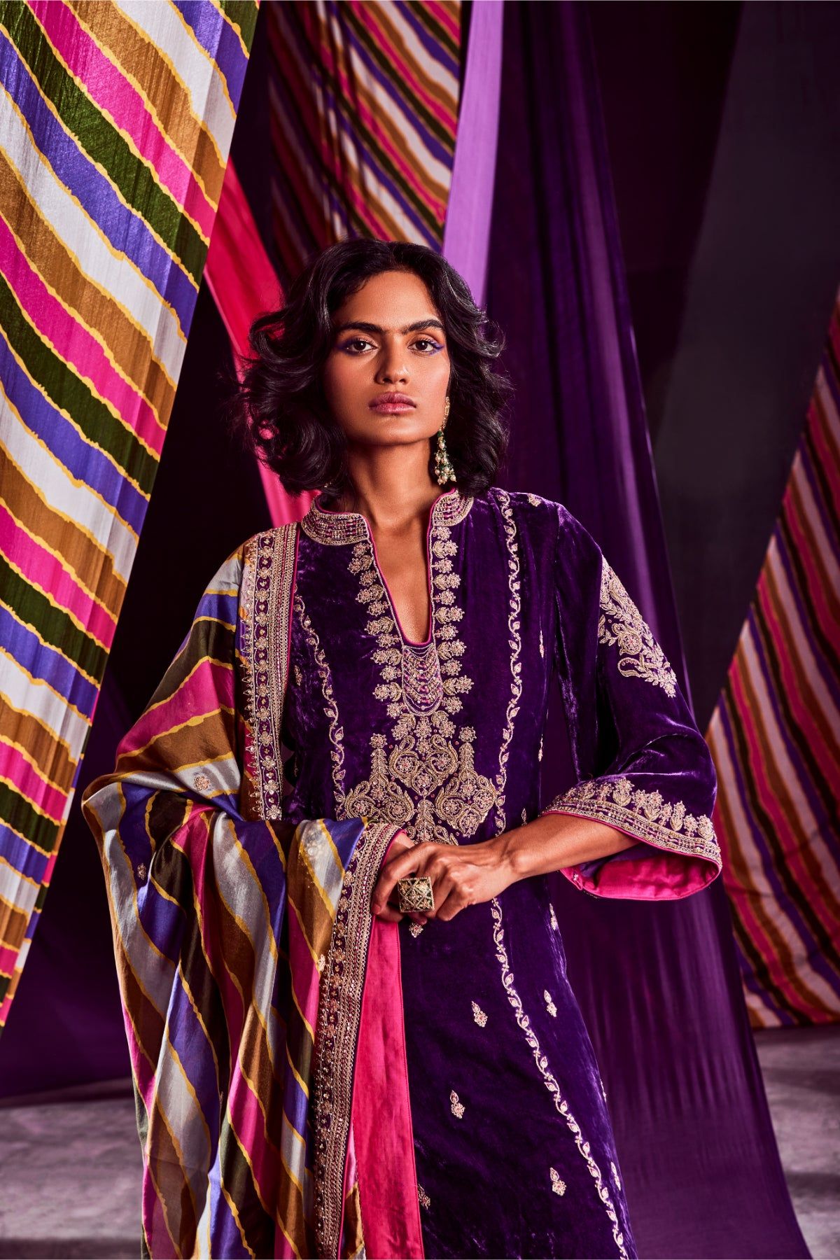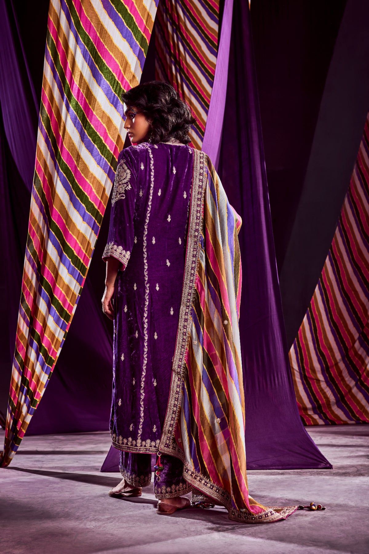 Velvet Kurta With heavy Zardozi Work Details All Over Paired With Stripes Dupatta & Pants