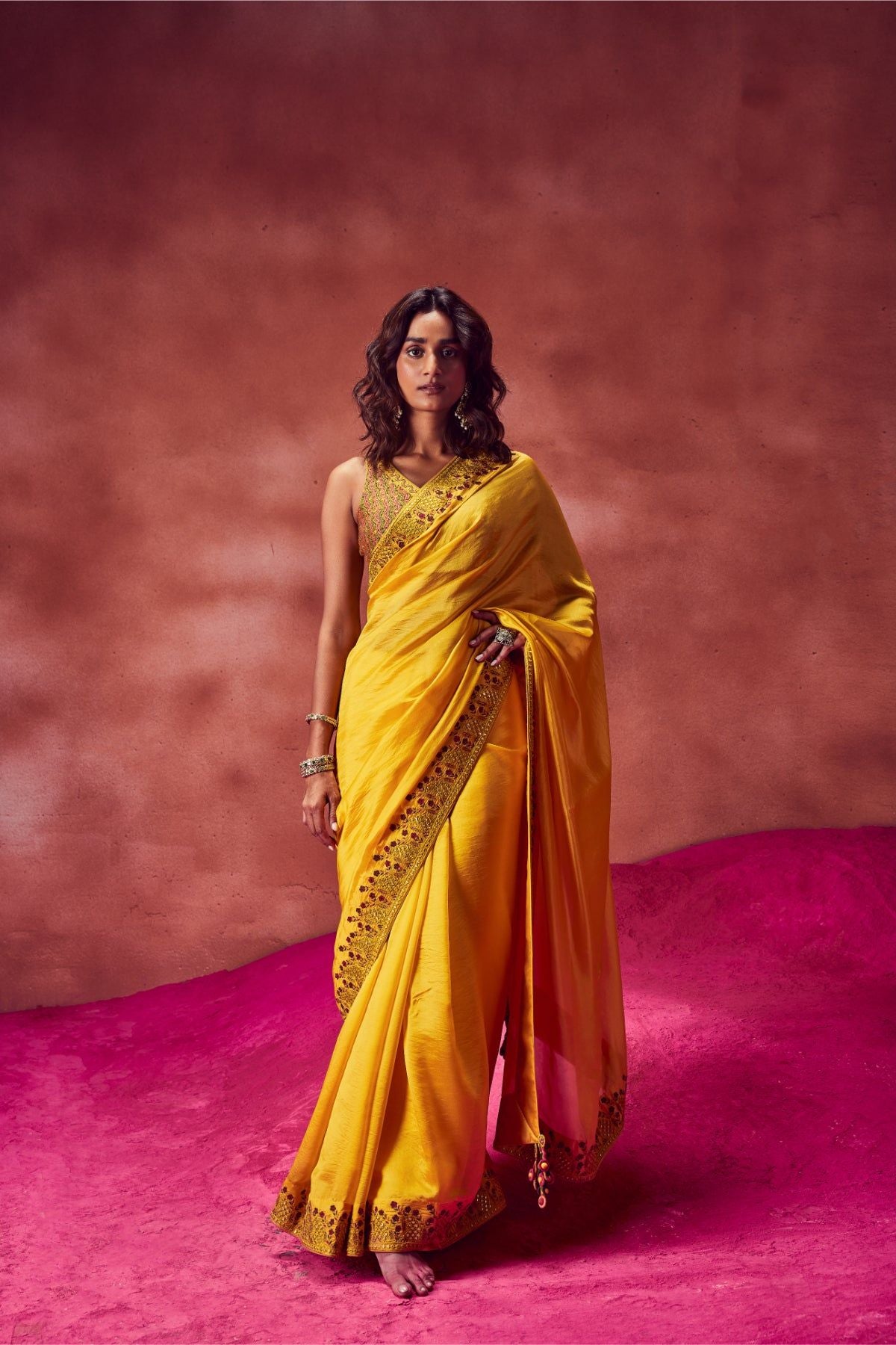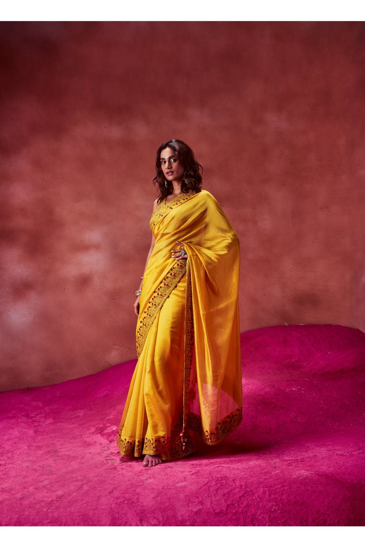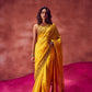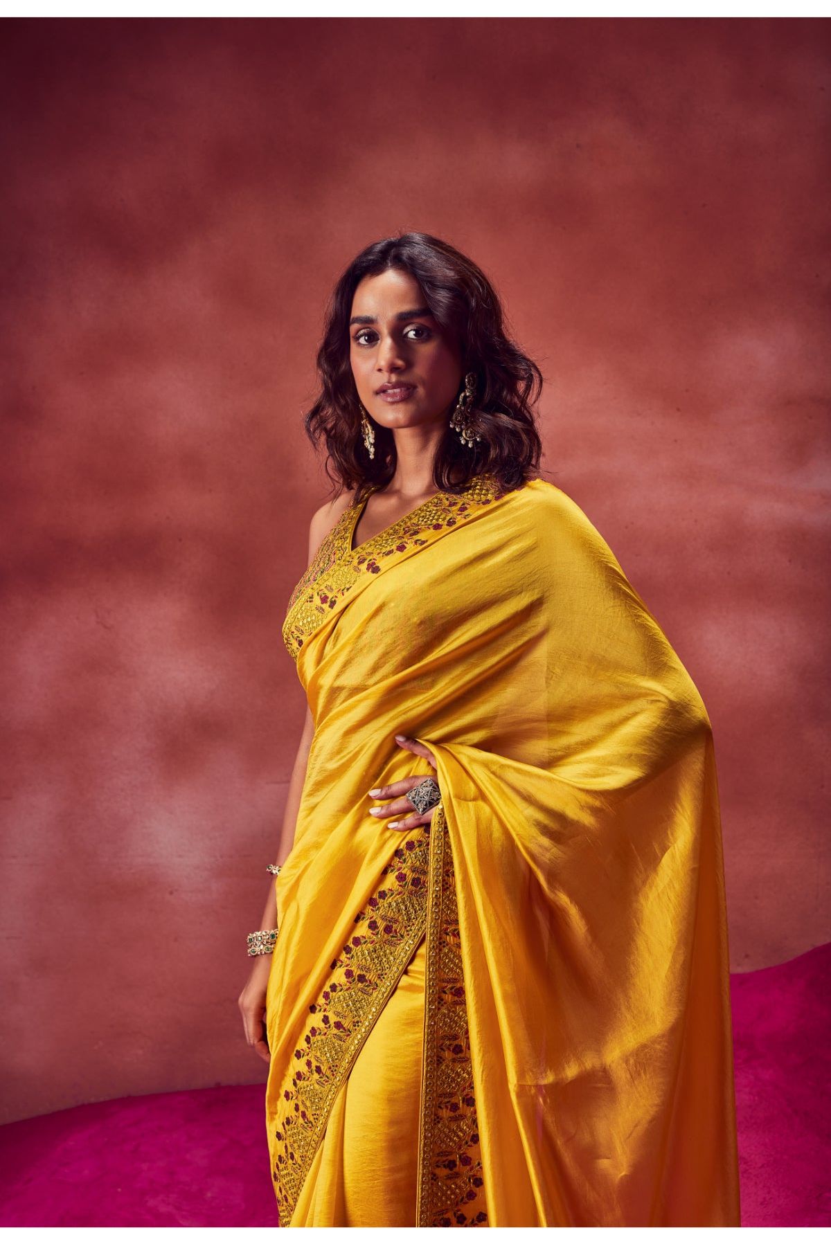 Yellow Saree With Heavy Resham & Patra Work Border Paired With Heavy Work Blouse