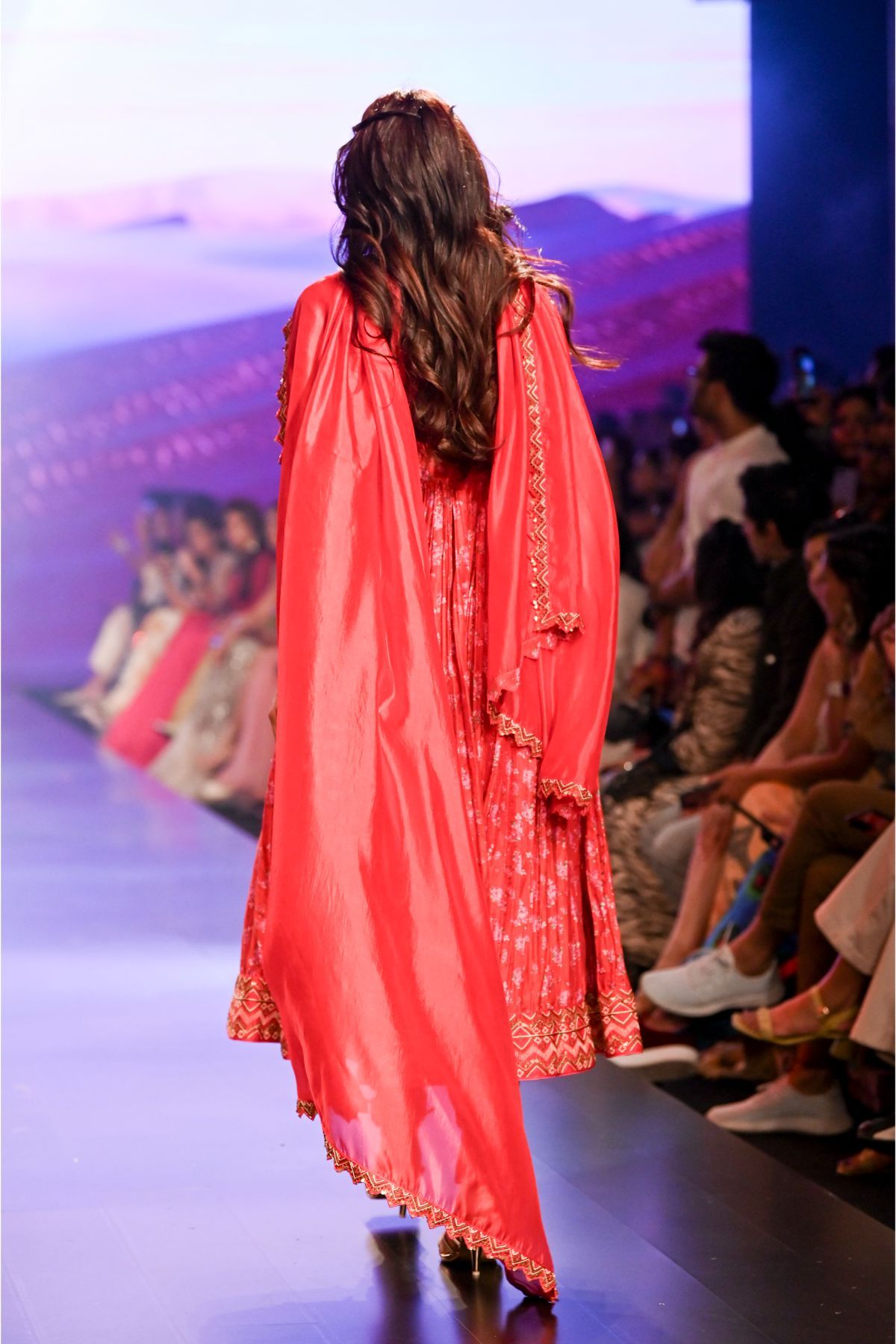 Surkh laal Floral Printed Angrakha Embroidered With Resham & Coin Work Paired With Cutwork laal Dupatta & Churidar