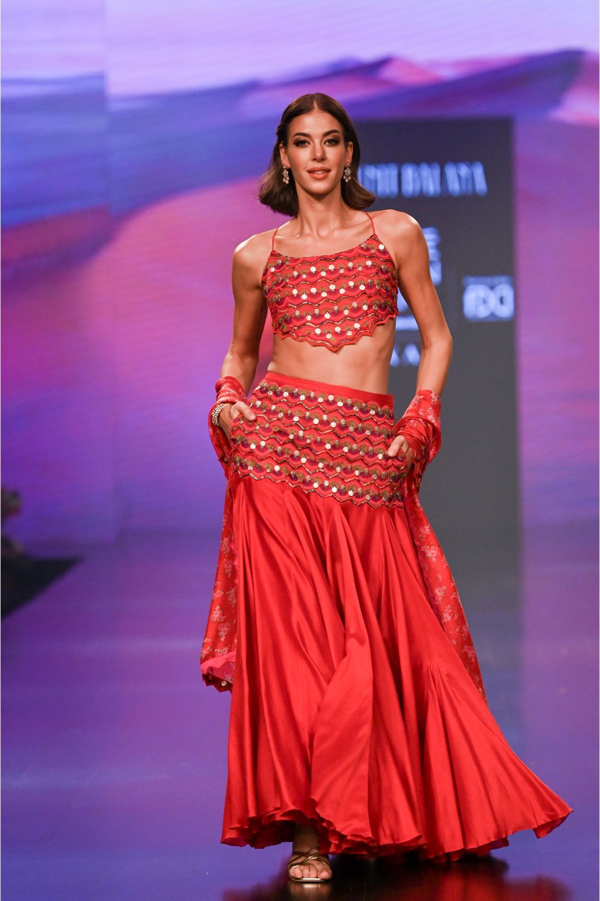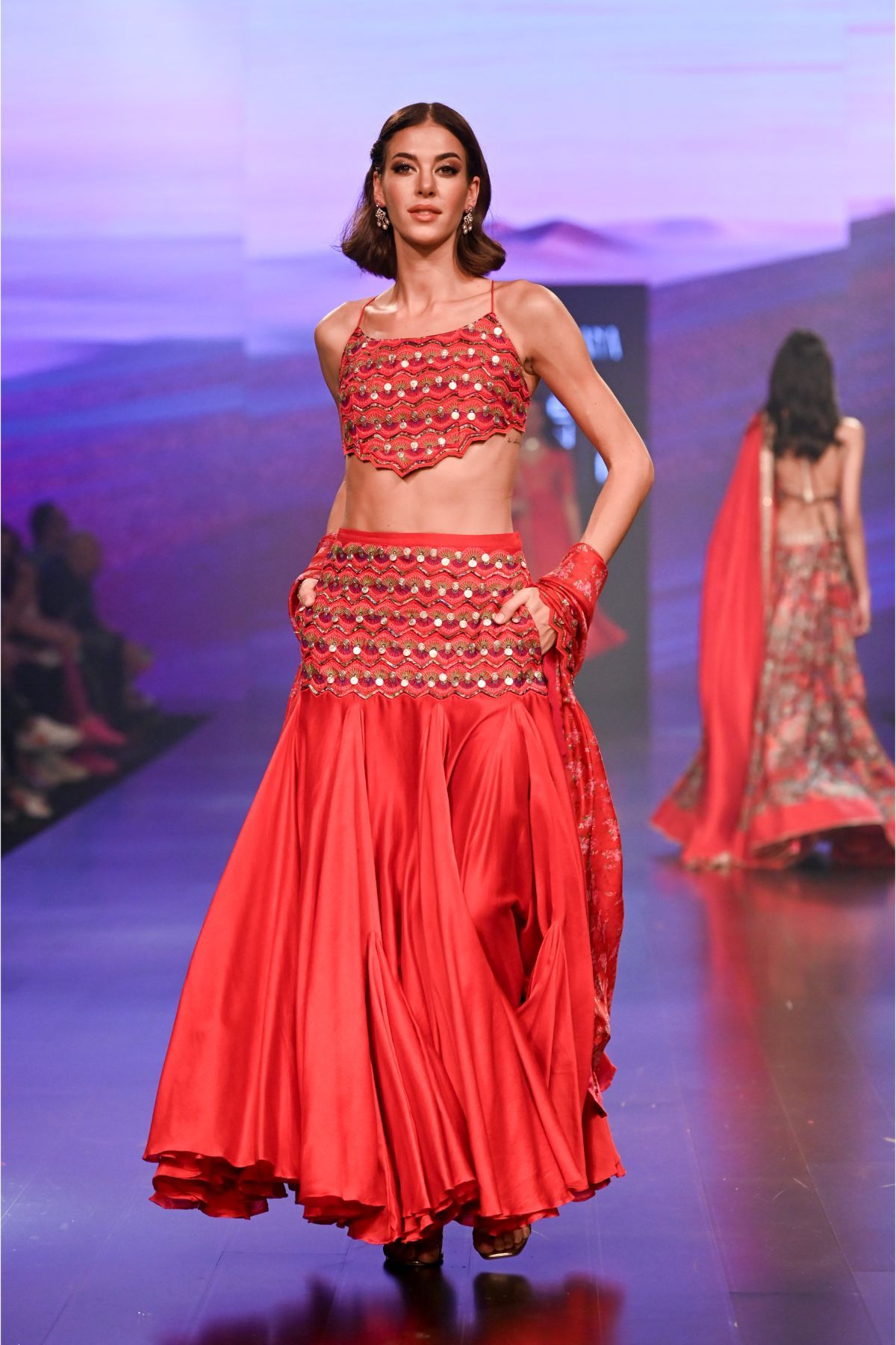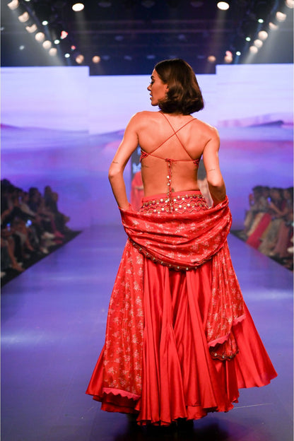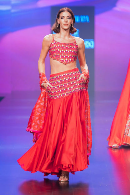 Surkh Laal Skirt Embroidered With Dori & Coin Paired With Heavy Embroidered Asymmetric Blouse & Cutwork Floral Printed Dupatta
