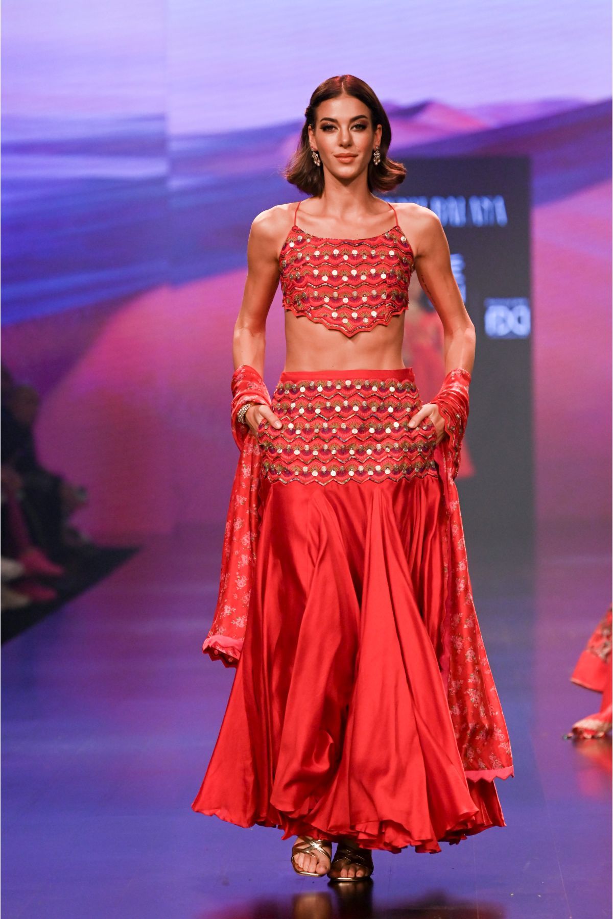 Surkh Laal Embroidered Skirt Paired With Asymmetric Blouse & Dupatta