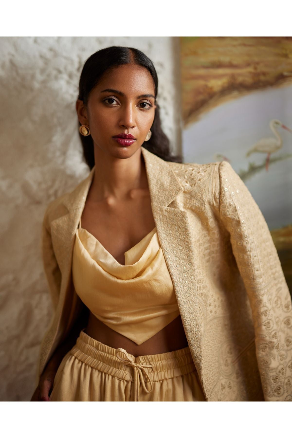 Buttercup Cowl Top Paired With Jacket & Pants. Collection Name - Chaap
