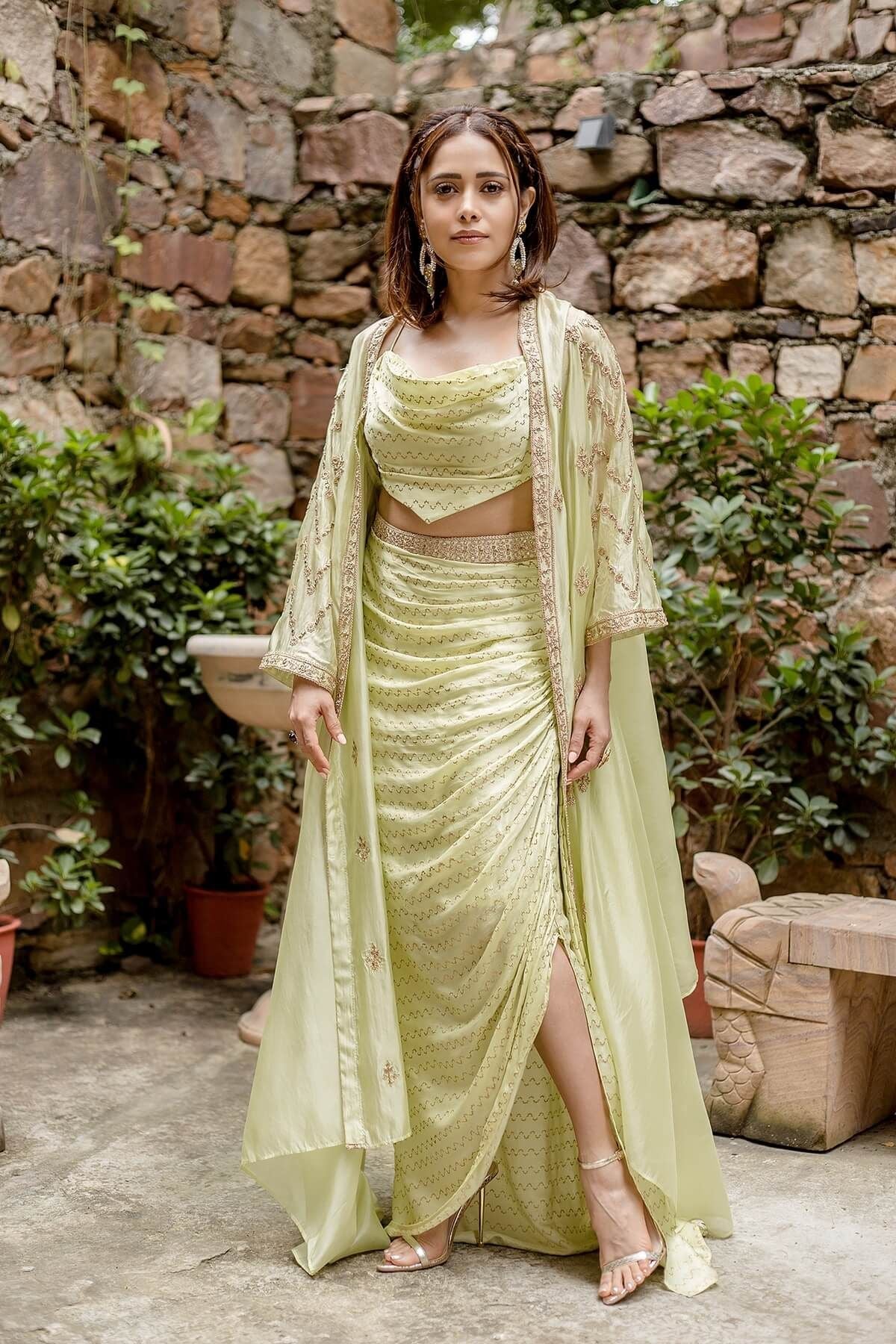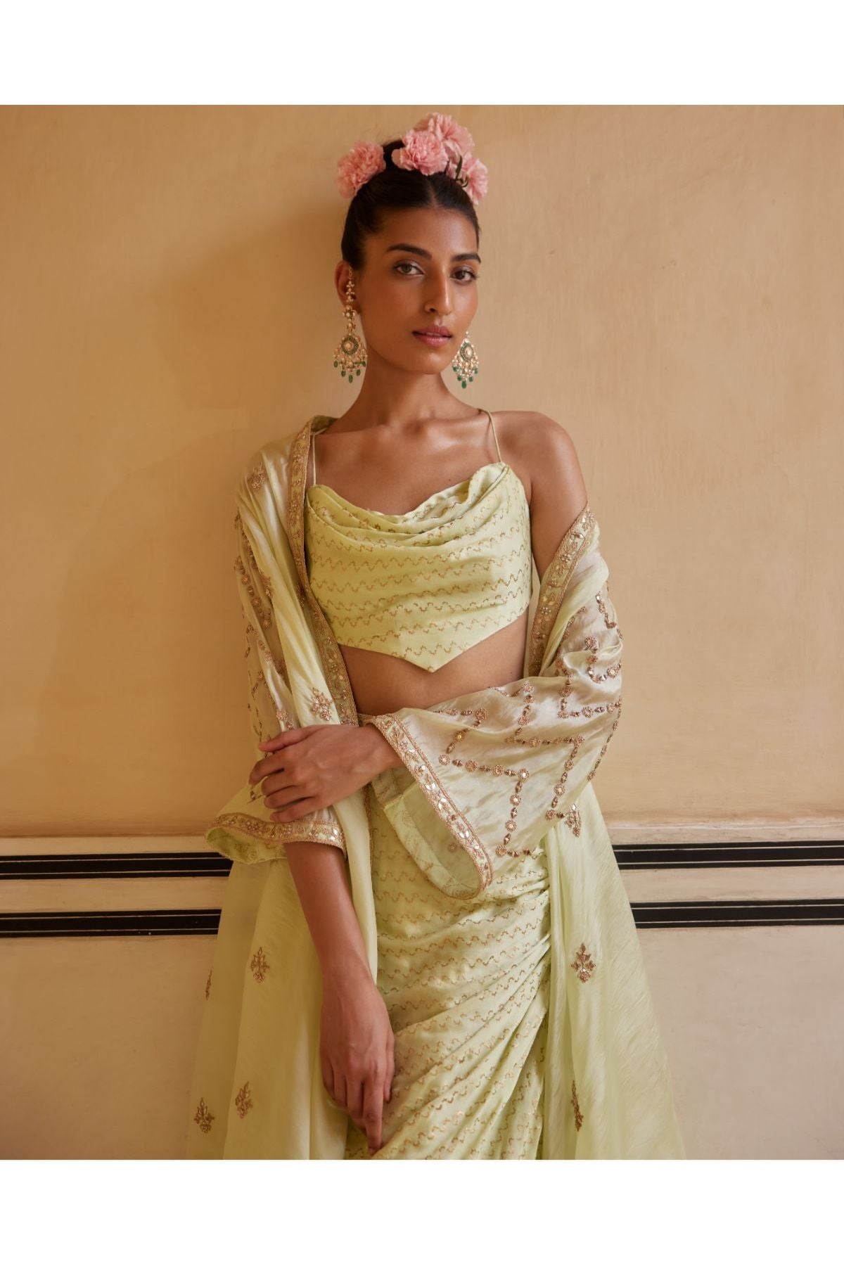 Mint Drape Skirt Paired With cowl Top & Cape.