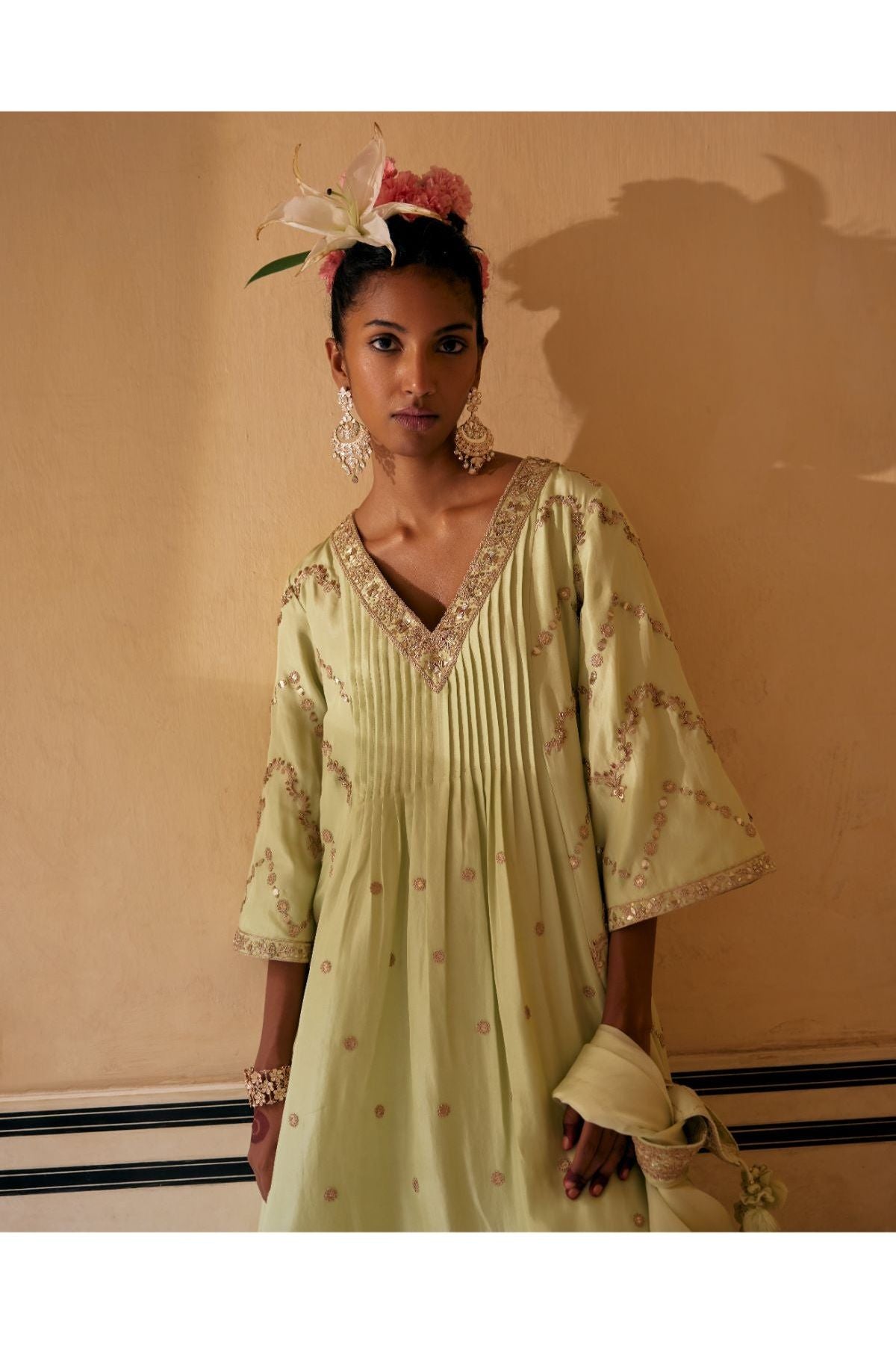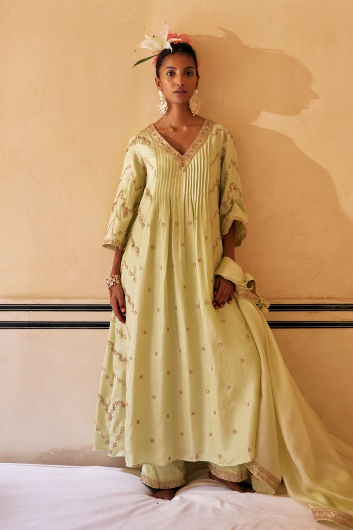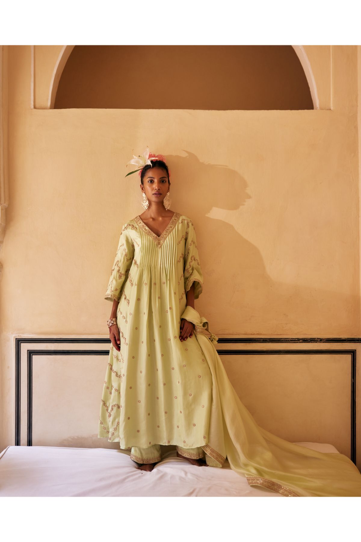 Mint Silk Anarkali Paired With Pants & Dupatta.