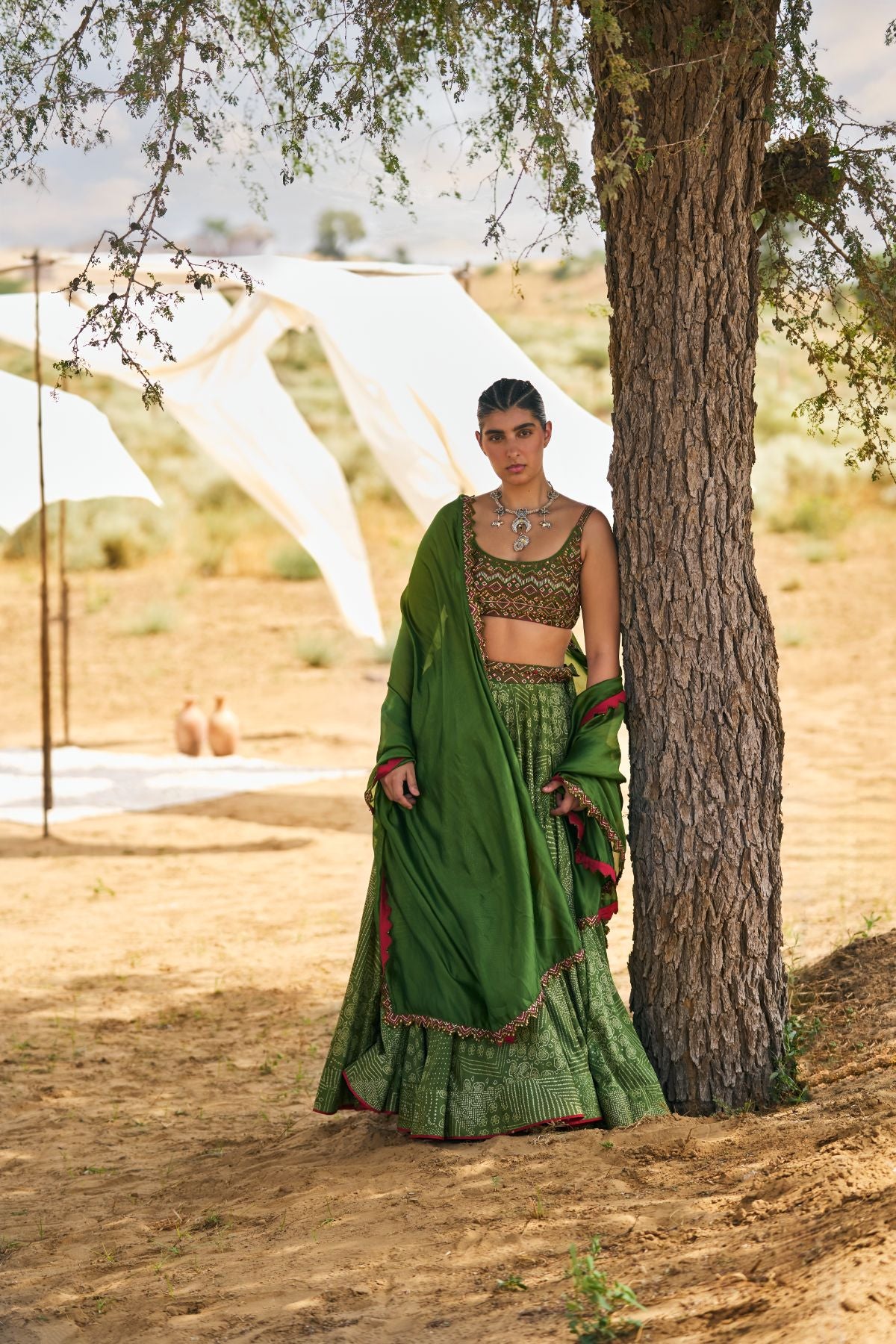 Embrace The Artistry Of Rajasthani Heritage With Our Kaccha Aam Lehenga Which Has Eight Distinct Bandhani Patterns Intertwined Seamlessly, Creating A Tapestry Of Folksy Crafts With A Modern Twist. Adorned With PB Logo Antique Coin And Resham Work, The Ensemble Evokes The Timeless Charm Of An Era Gone By, While Our Signature Tassels Add A Touch Of Whimsy.