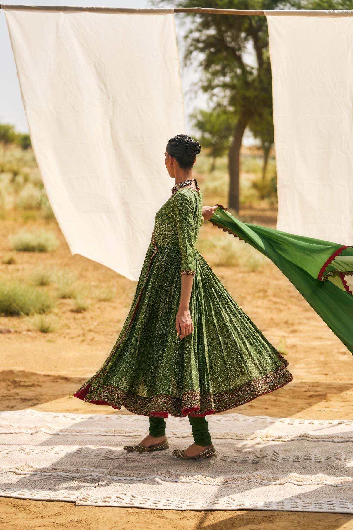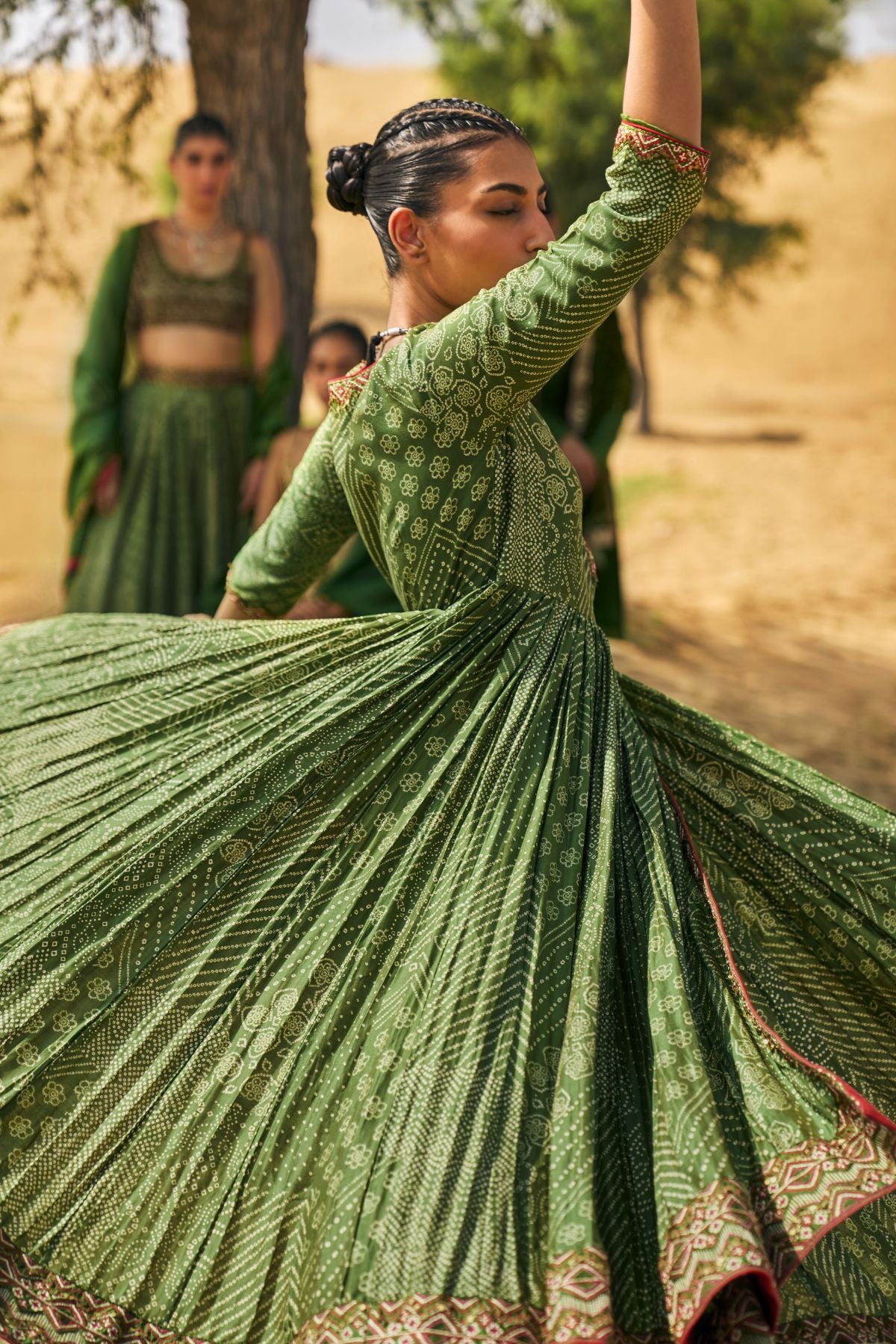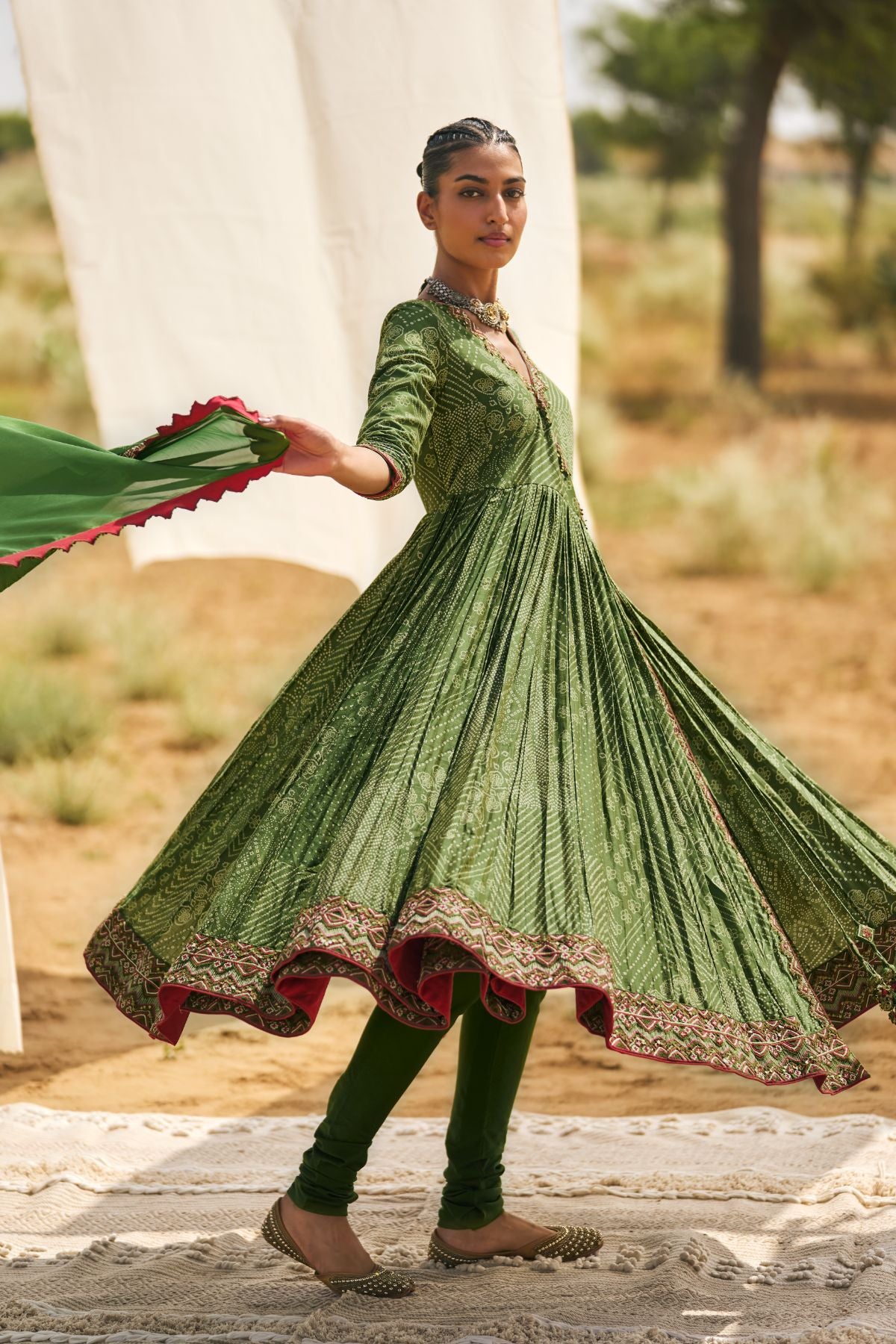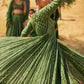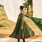 Introducing The Chausat-Kali Angarakha In The Season's Kaccha Aam Hue. Inspired By The Iconic Pakeezah Song 'Thaare Rahiyo', This Beauty Is Crafted With 64 Kalis To Give It Voluminous Flare And Yesteryear Charm. First Introduced In 2018, The Silhouette's Unique Tie Detailing Ensures A Snug Yet Comfortable Fit That Is Meant To Accentuate Your Form. With Antique Logo Coin Embroidery And Laal Thread Accents, It's A Classic Reimagined.