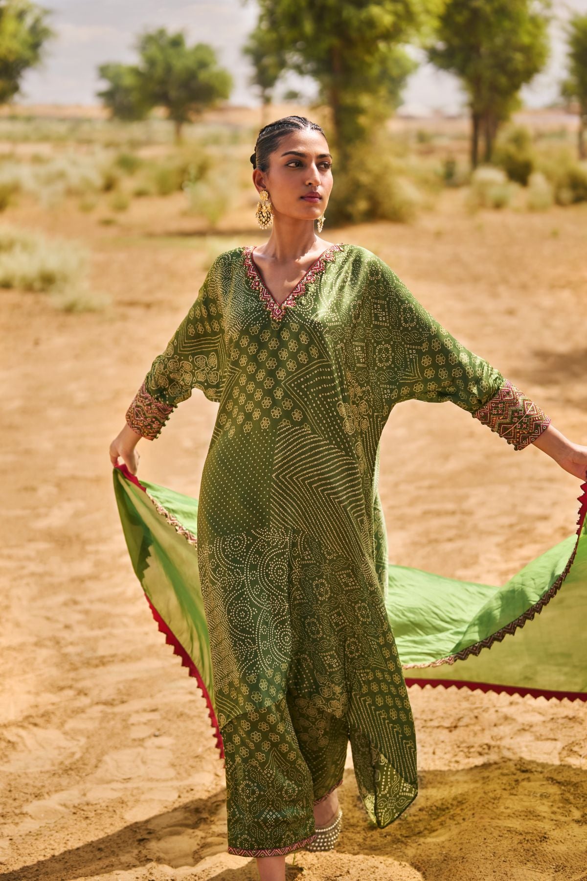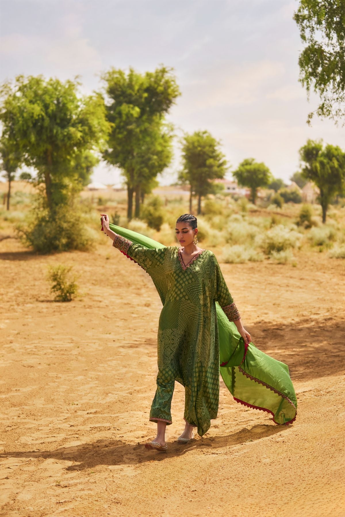 Combining The Elegance Of A Kurta With The Versatility Of A Kaftan, We Introduce Our New Kaftan Kurta Set, Designed To Flatter All Body Types. Paired With Pants & Dupatta, The Resham And Coin Embroidery On The Neckline And Cuff Adds The Right Amount Of Drama To The Bandhani Print Making It The Perfect Pick For The Festive Season Ahead.