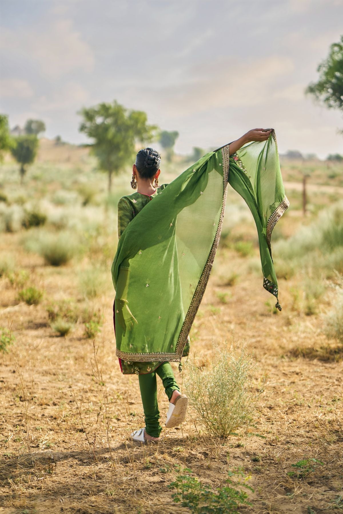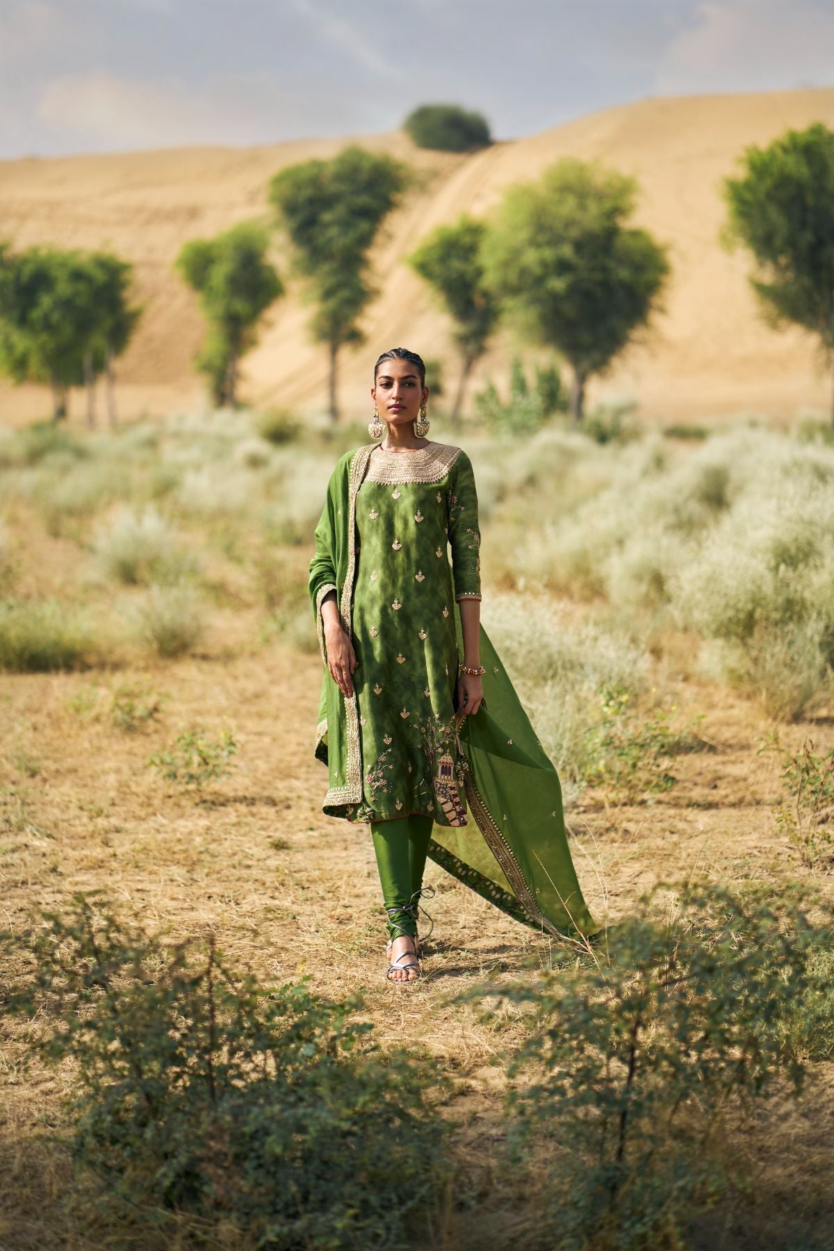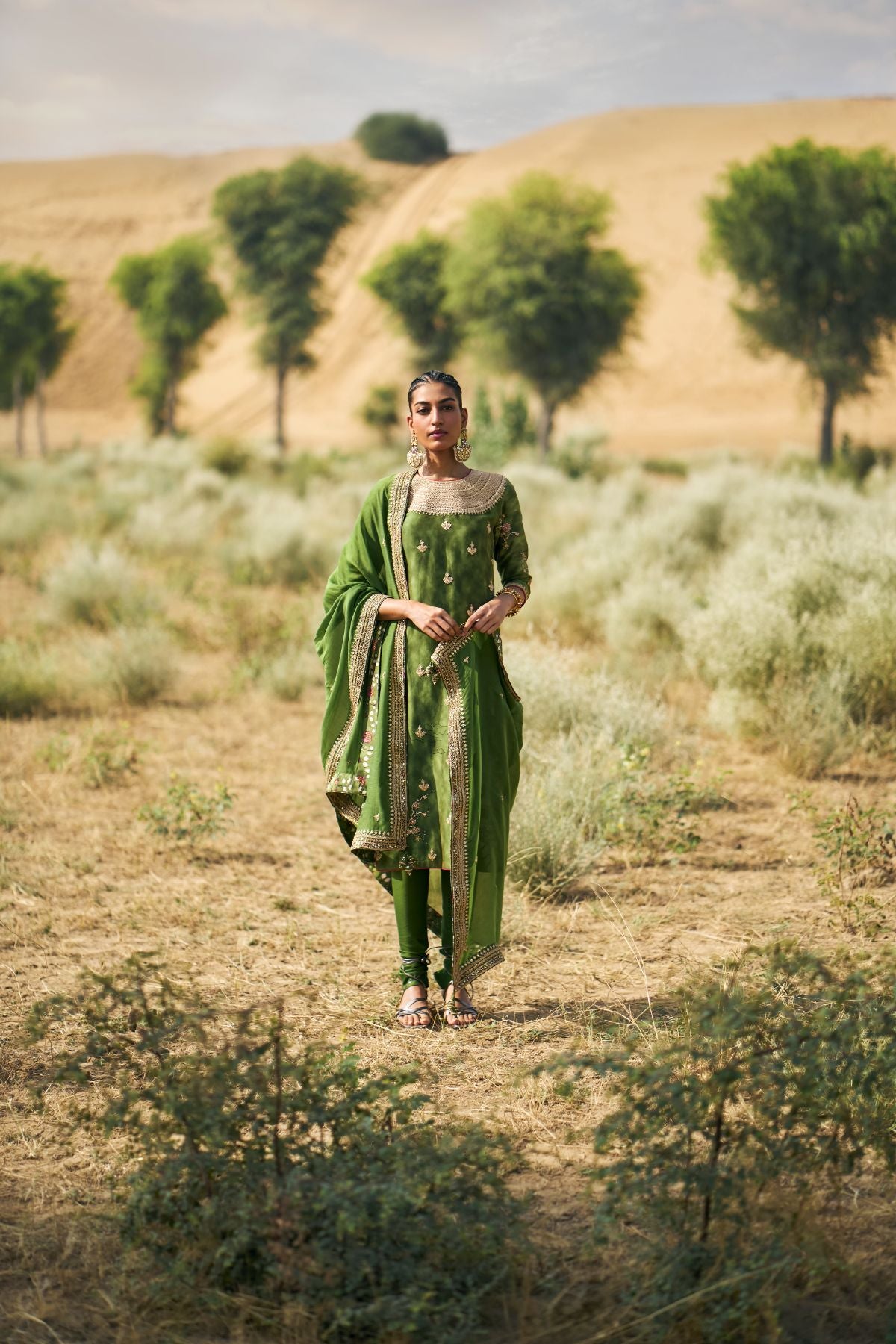 Elegance In Every Thread, Our Forest Inspired Ranthambhore Print Kurta, Adorned With Our Classic Rani Haar Neckline Marodi Work Embroidery And Resham Detailing, Is A Tribute To Artisanal Legacy Of Rajasthan. Paired With Churidar Pants And A Organza Silk Handwork Work Dupatta, This Is A Silhouette For All Seasons And Reasons, A Cult Classic.