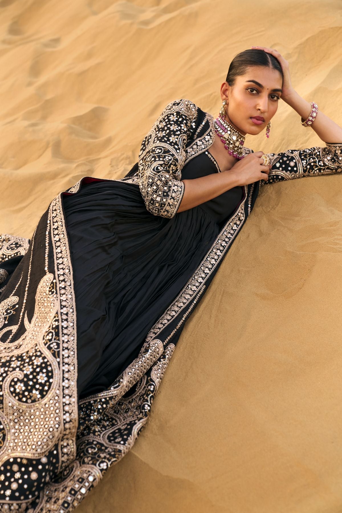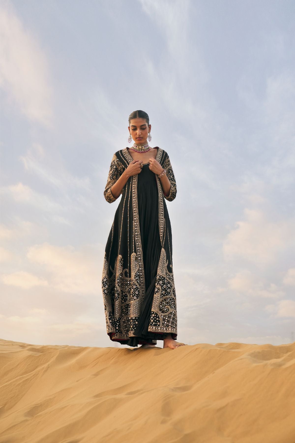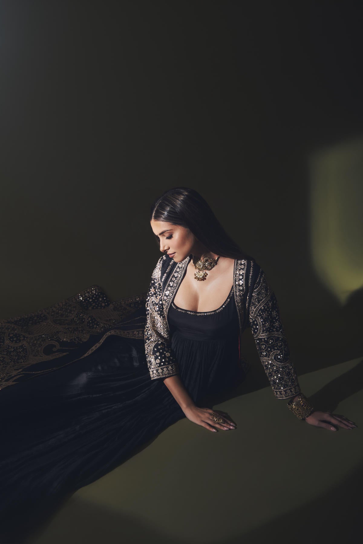 True To Its Name, The Rani Sa Anarkali From Our First-Ever Couture Capsule Is Meant To Make You Feel Like Royalty. The Silk Kalidar And Jacket Set Is Enriched With Gold Kaanch Ka Kaam And Salma Accents, Exuding Unmatched Regal Opulence. The Entire Set Is A Blend Of Grandeur With Comfort By Using Lightweight Materials And Exquisite Embellishments.