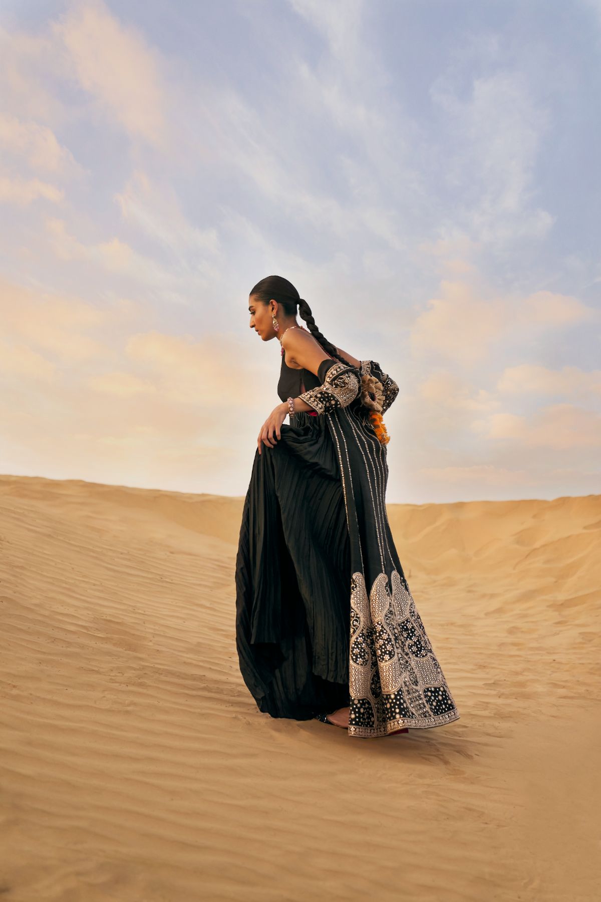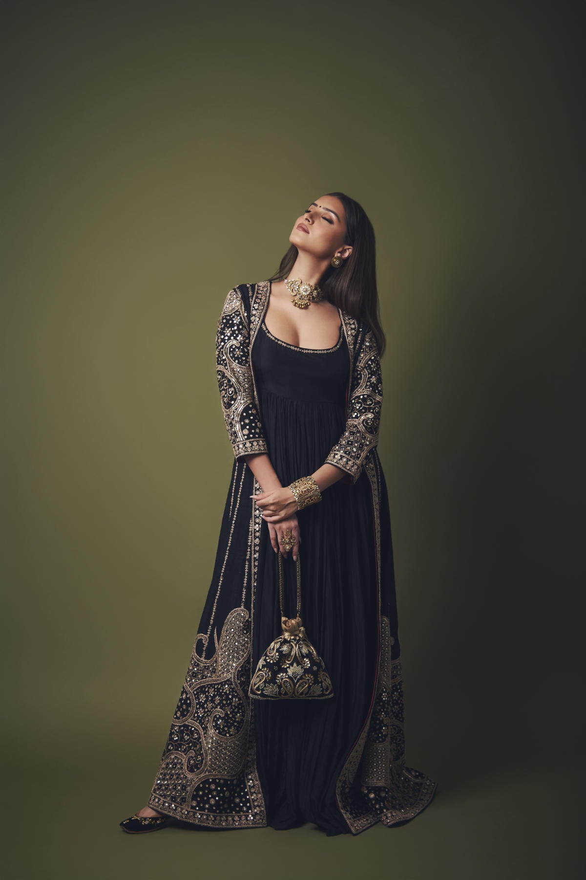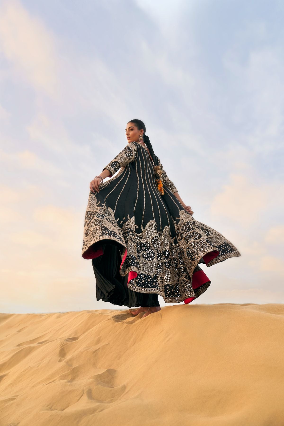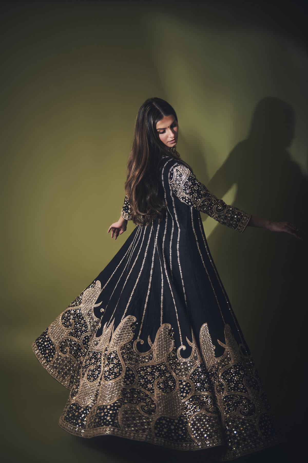 True To Its Name, The Rani Sa Anarkali From Our First-Ever Couture Capsule Is Meant To Make You Feel Like Royalty. The Silk Kalidar And Jacket Set Is Enriched With Gold Kaanch Ka Kaam And Salma Accents, Exuding Unmatched Regal Opulence. The Entire Set Is A Blend Of Grandeur With Comfort By Using Lightweight Materials And Exquisite Embellishments.