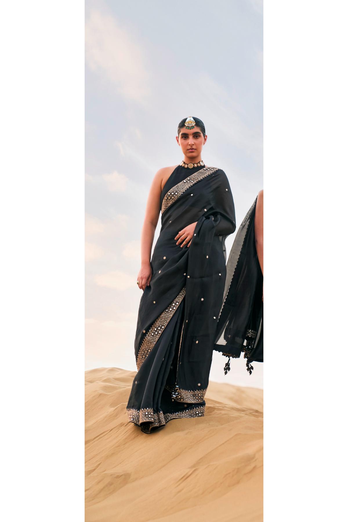 The Rani Sa Sari From Our First-Ever Couture Capsule Is Meant To Make You Feel Like Rajasthan's Royalty. The Silk Sari Is Enriched With Gold Kaanch Ka Kaam And Salma Accents, Exuding Unmatched Regal Opulence. The Entire Set Is A Blend Of Grandeur With Comfort By Using Lightweight Materials And Exquisite Embellishments.