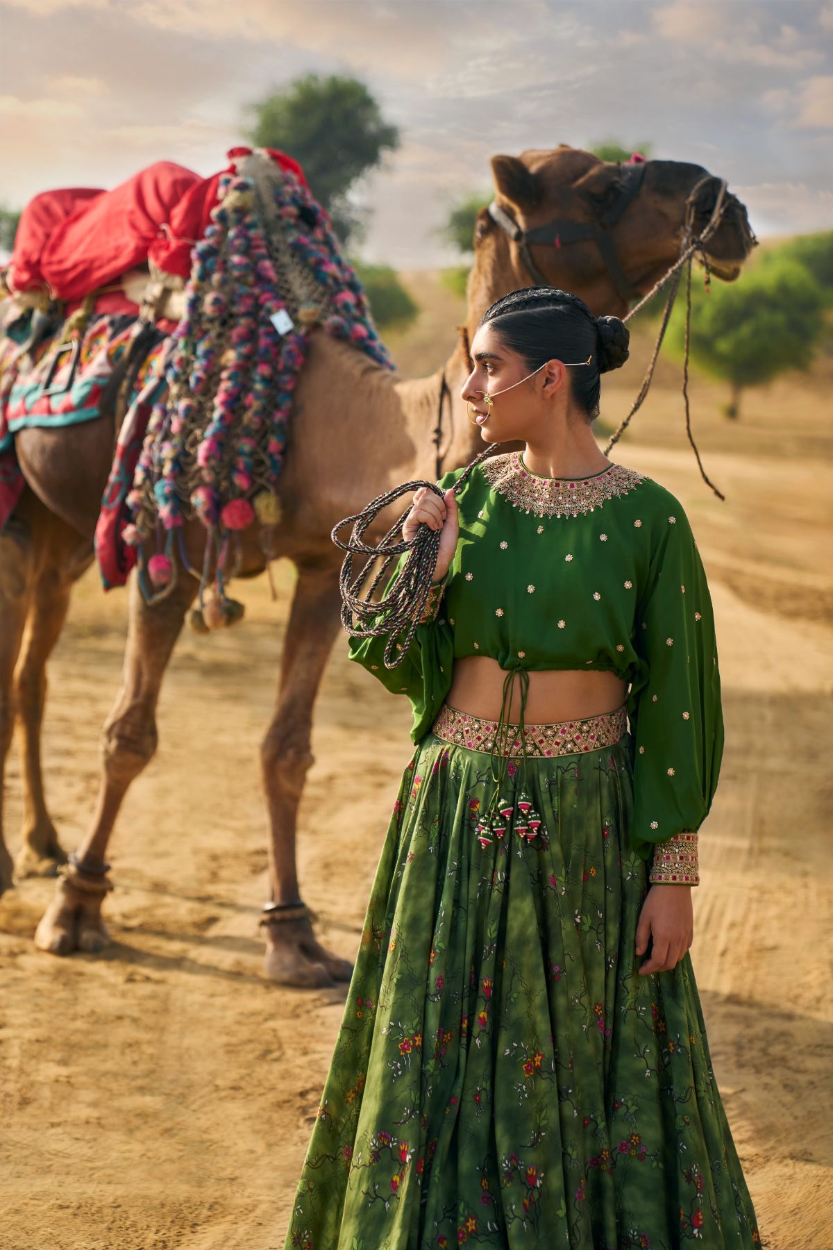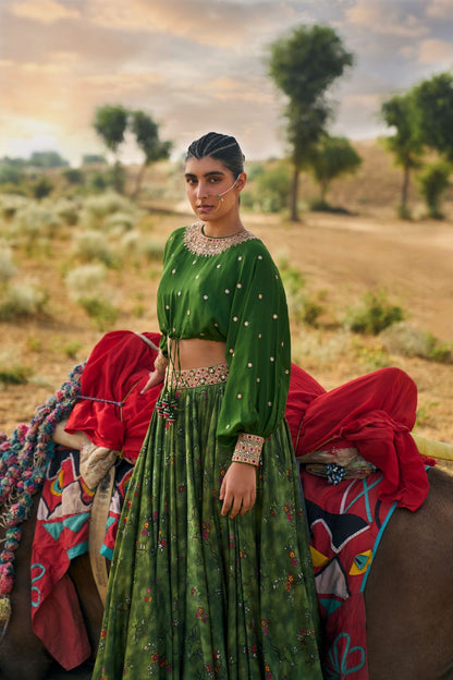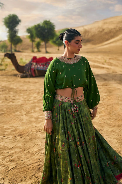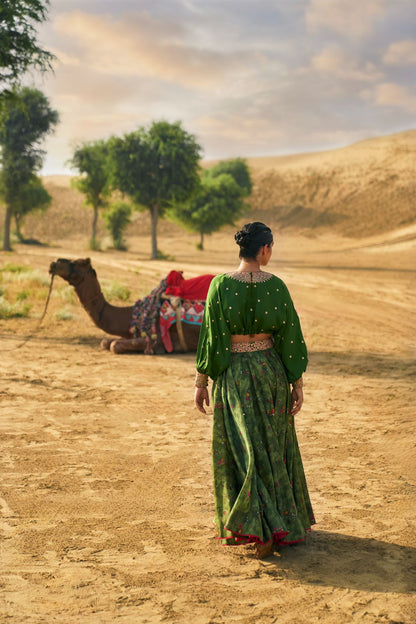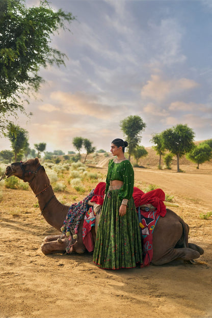 Much Like Its Name, Our Signature Kumari Lehenga Set Is A Modern, Refreshing Spin On The Flared Lehenga, Made With Our Young Muses In Mind. A Roomy Crop Top Is Teamed With A Fuss-Free Skirt (it comes with pockets too!) That Lets You Dance The Night Away. This Season, We Step Into The Wilderness With This Kacha Aam Version Featuring Our New Ranthambore Print. This Forest-Inspired Ensemble With Playful Parrots Is Pure Exotic Charm. The Gota , Marodi, Dori, And Multi-Colored Patchwork Embroidery In Our Rani Haar Neckline Style Is A Regal Finishing Touch.