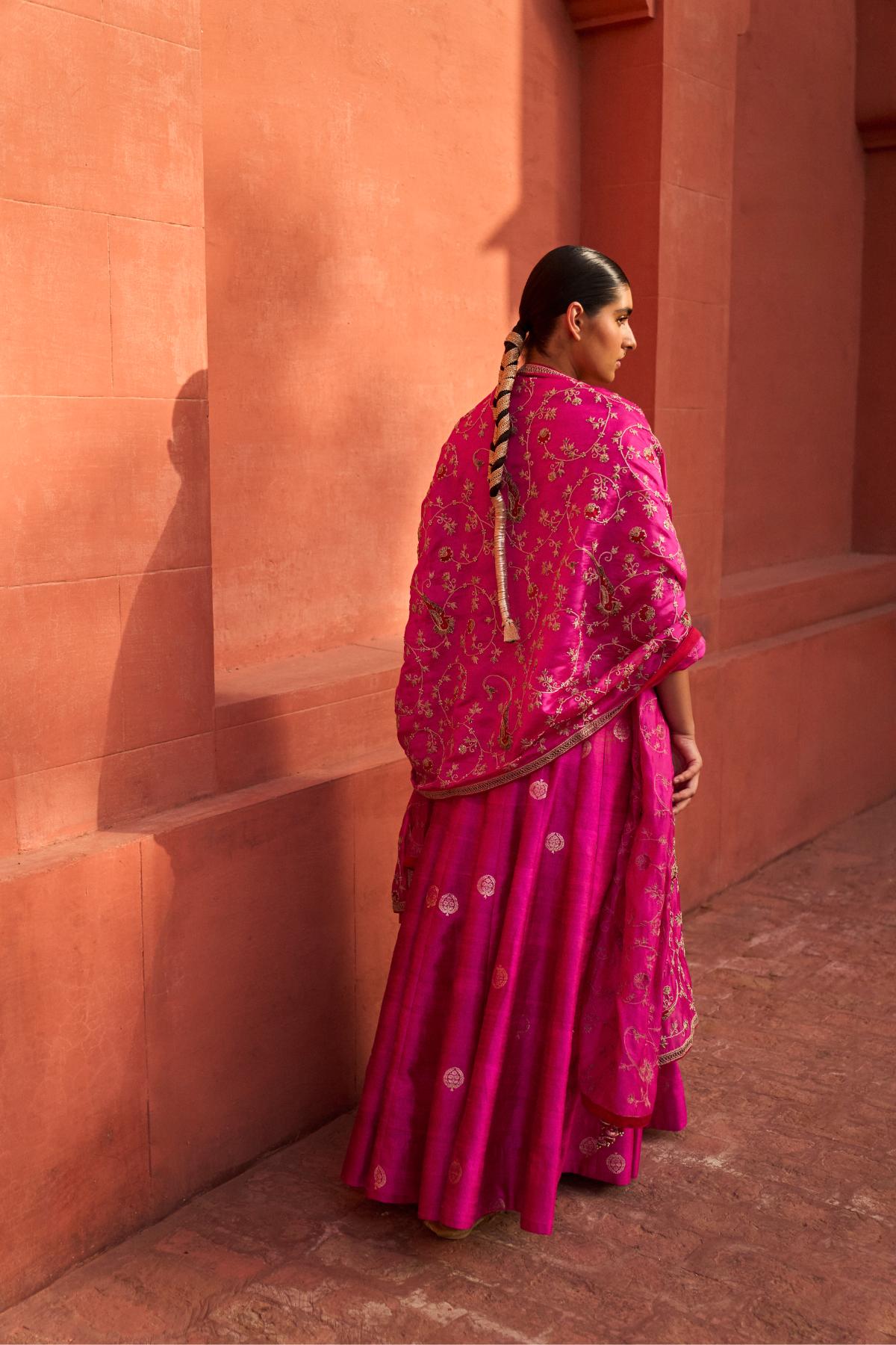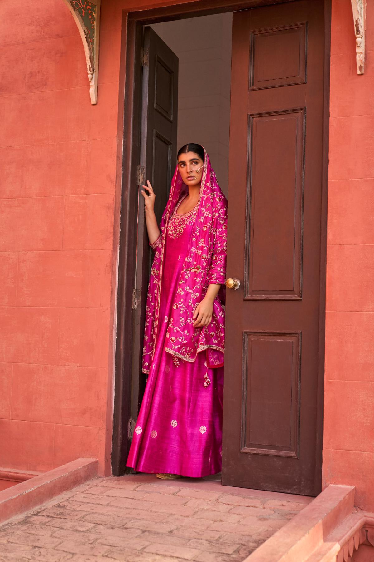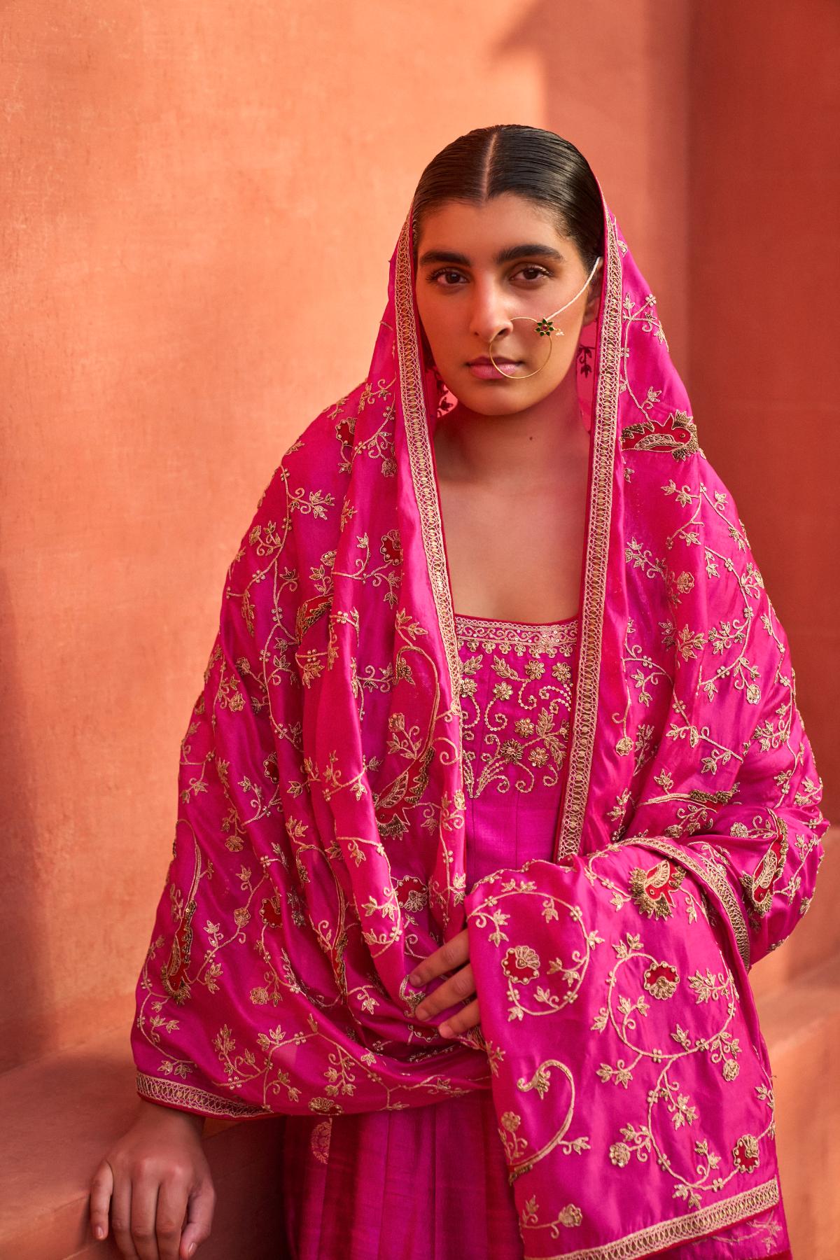 Gulabi Gulaal Banarasi Raw Silk anarkali With Classic Marodi Work Neckline Paired With Heavy Jaal Work Dupatta