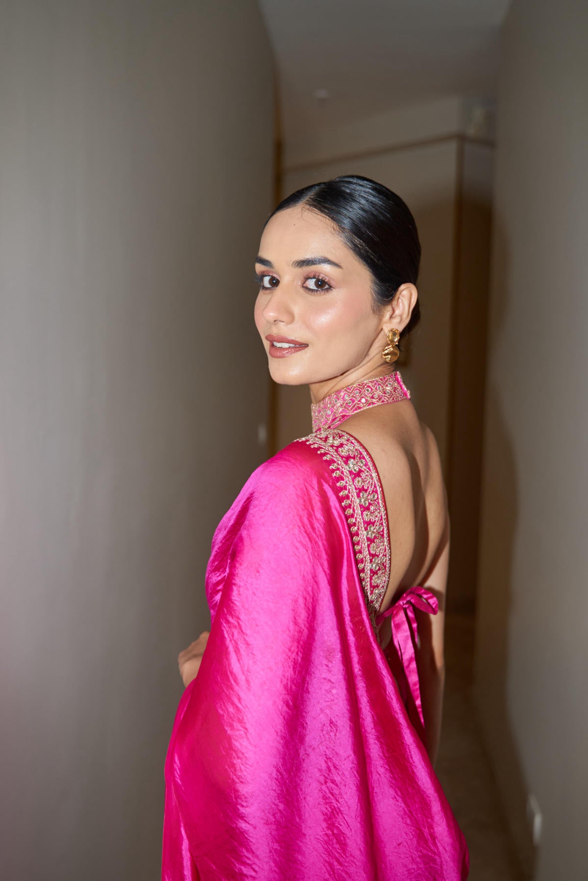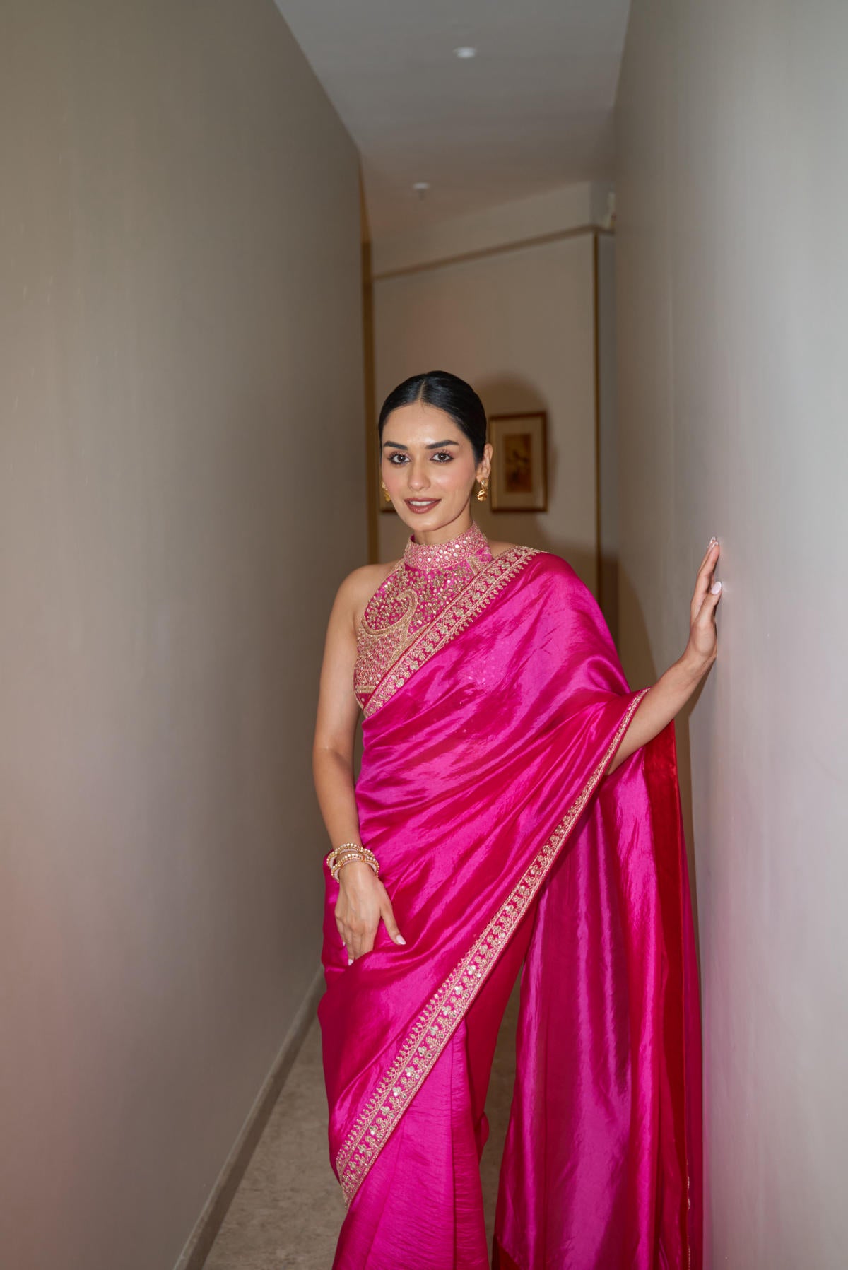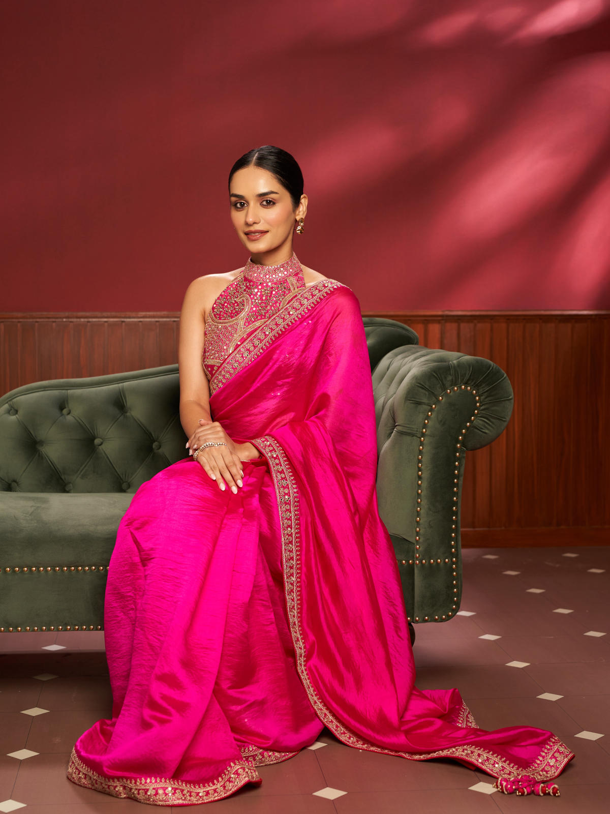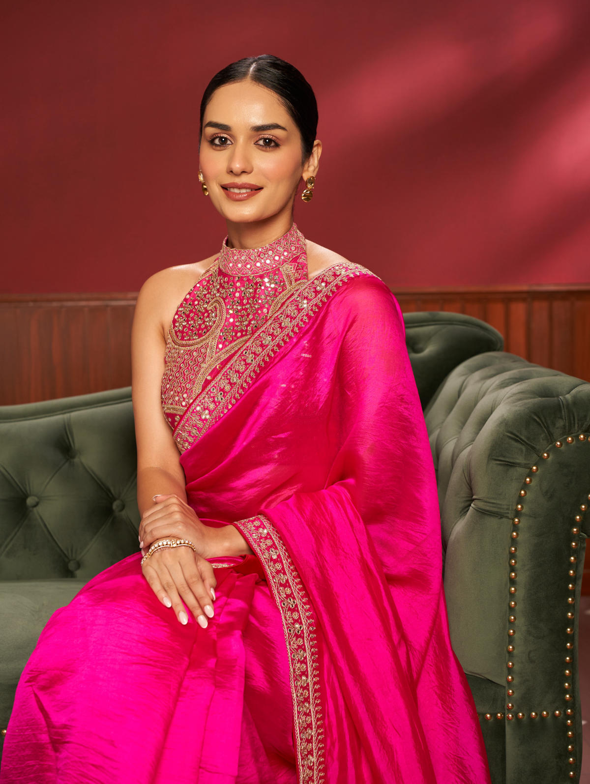 Classic Gulabi Gulaal Saree With Marodi & Mirror Work Border Paired With Halter Neck Fully Embroidered Blouse