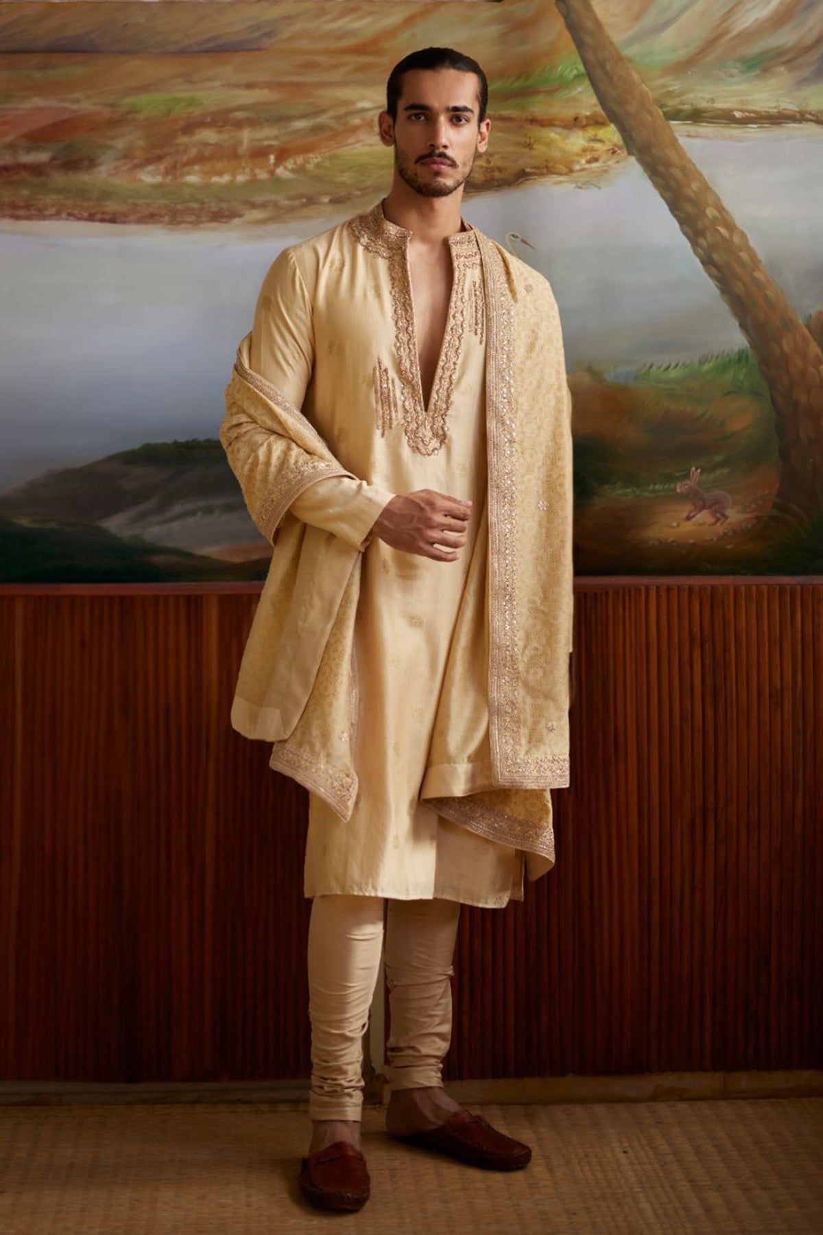 Buttercup Kurta With Hand Embroidered Neckline Paired With Gold Printed Hand Embellished Dupatta & Churidar.
