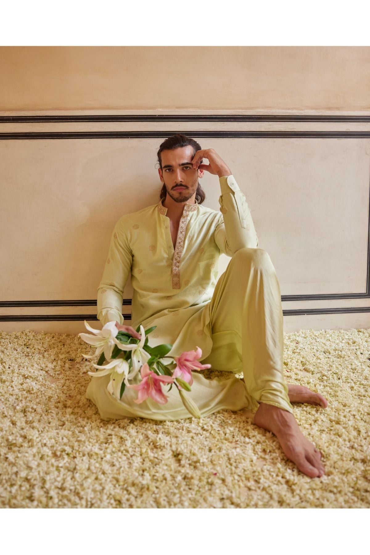 Mint Gold Print Kurta With Handwork Placket And Collar Paired With Pants. Collection Name - Chaap