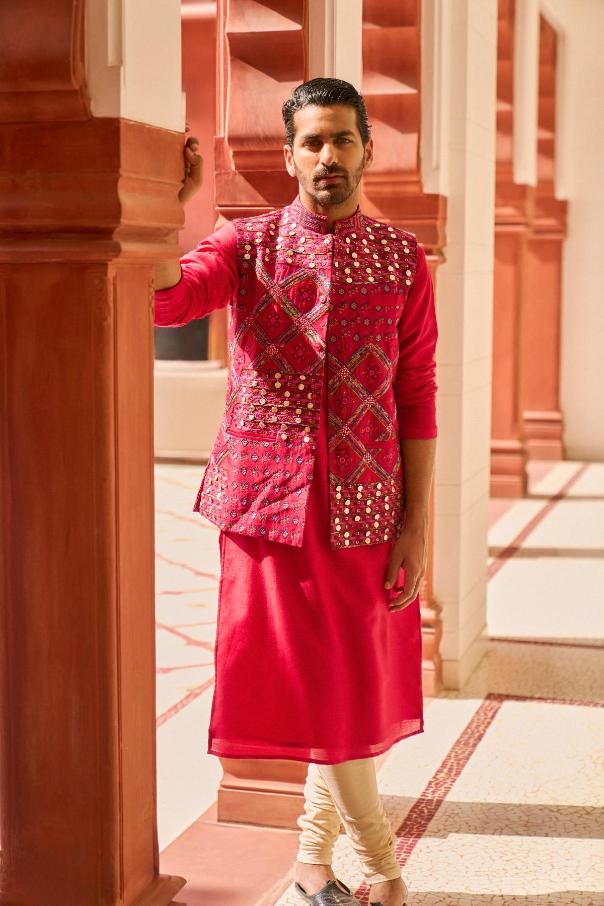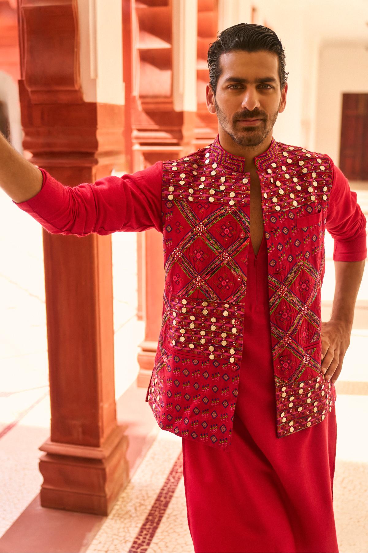 Surkh Laal Kurta With Coin, Resham And Dori Embroidered Bundi Jacket Paired With Ivory Churidar