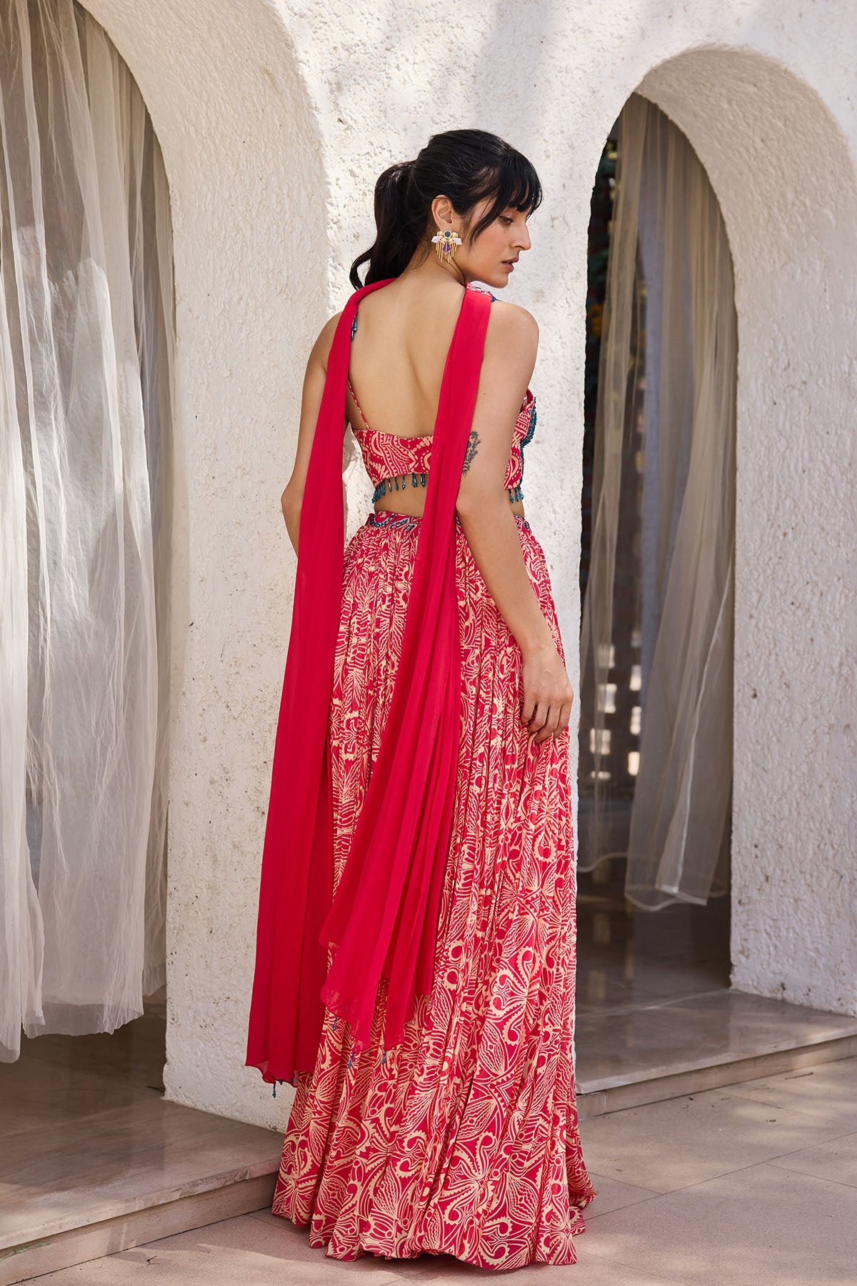 Pink Asymmetric Print And Highlighted Crop Top Paired With Gather Skirt And Choker Dupatta