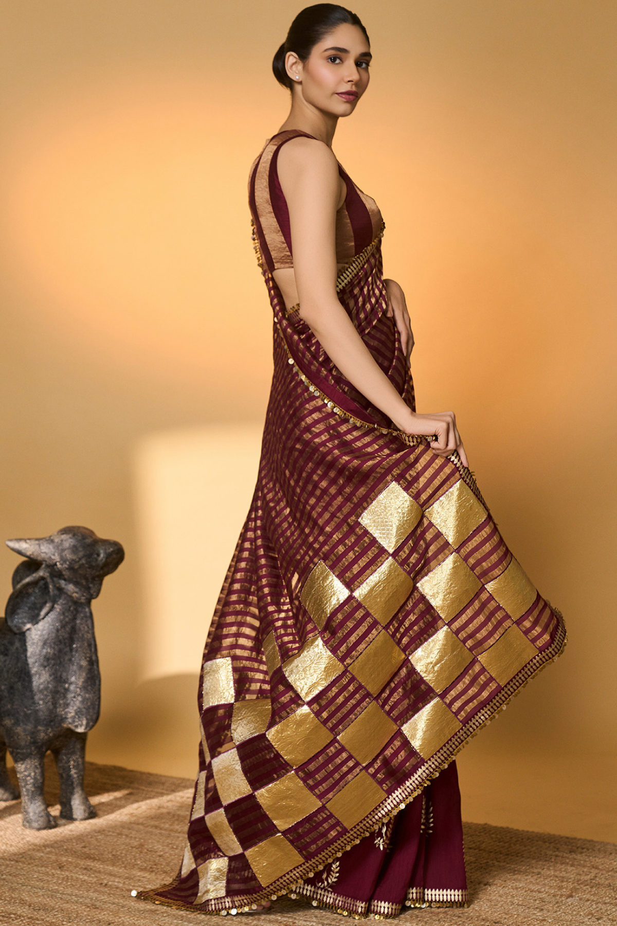 A traditional saree featuring raw silk pleats adorned with foil work all over for a rich textured look. The pallu is crafted in zari stripe tissue, highlighted with lumpi gota embroidered in alternate box patterns. A finely detailed border enhances the elegance of the drape and adds structure to the design. The blouse is designed in a mix of tissue and raw silk, creating a balanced blend of textures. Ideal for festive occasions and celebrations