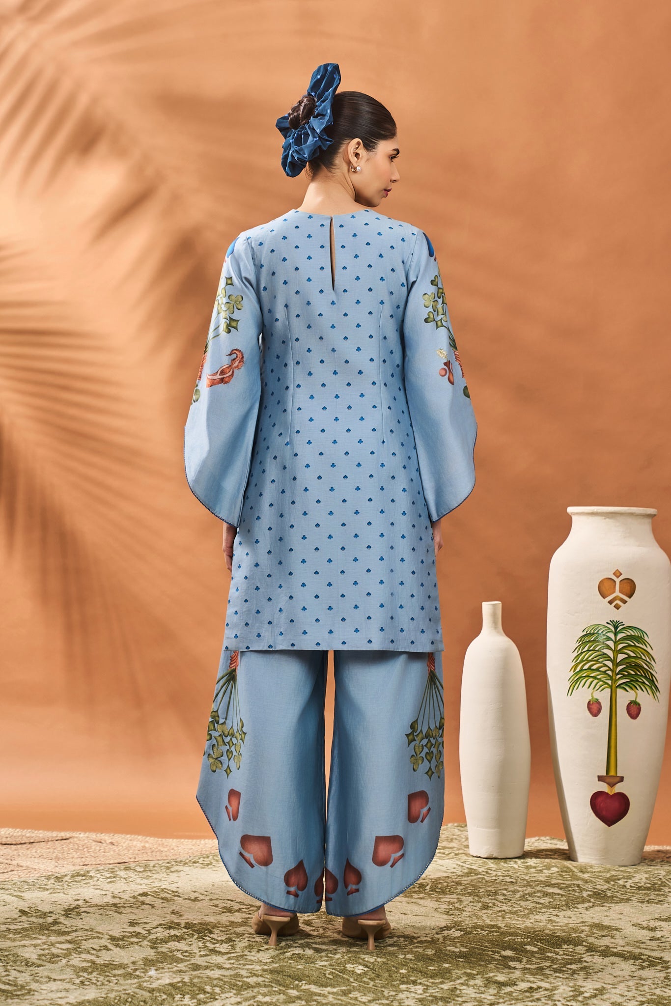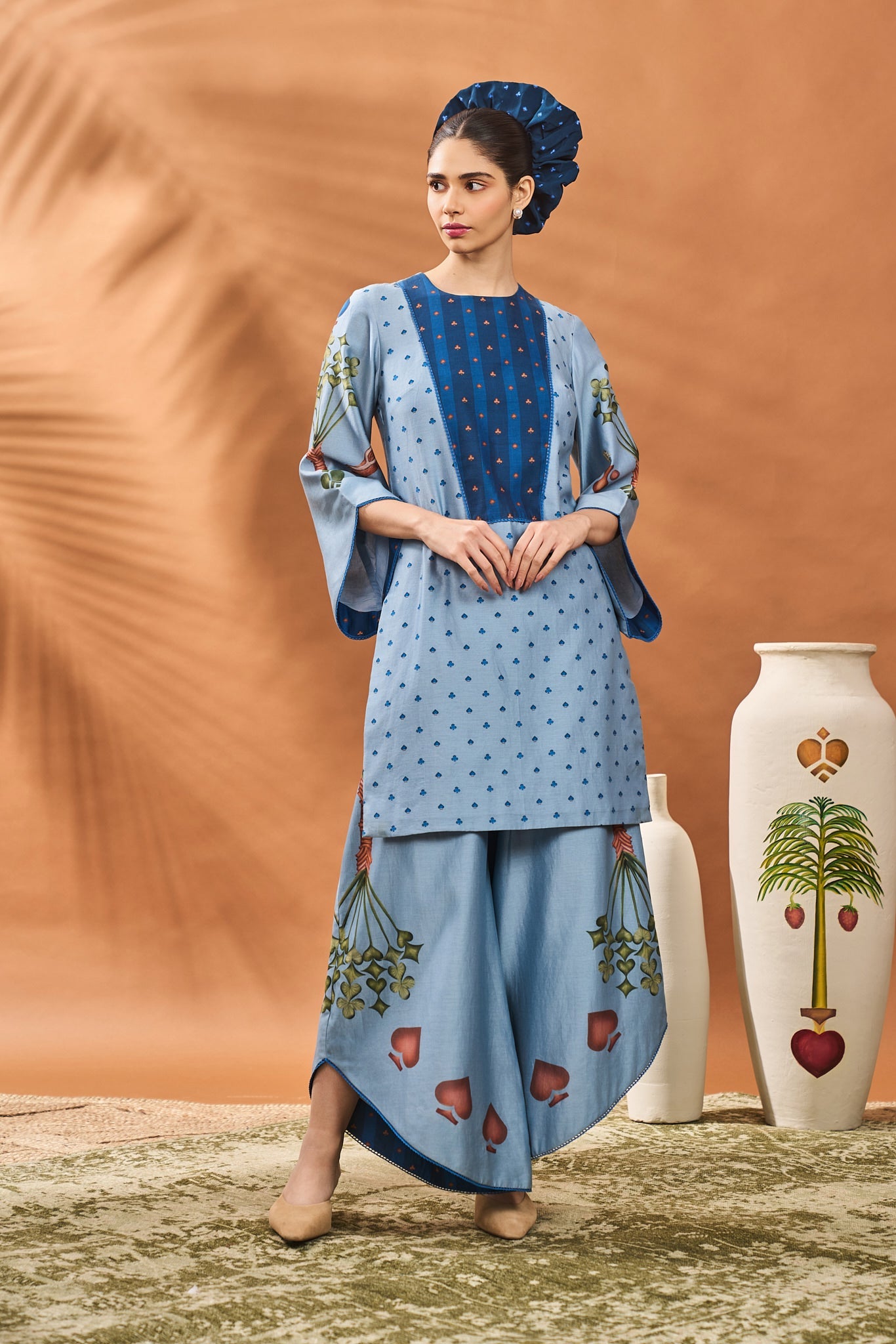 POWDER BLUE SPADE BLOSSOM TUNIC SET.