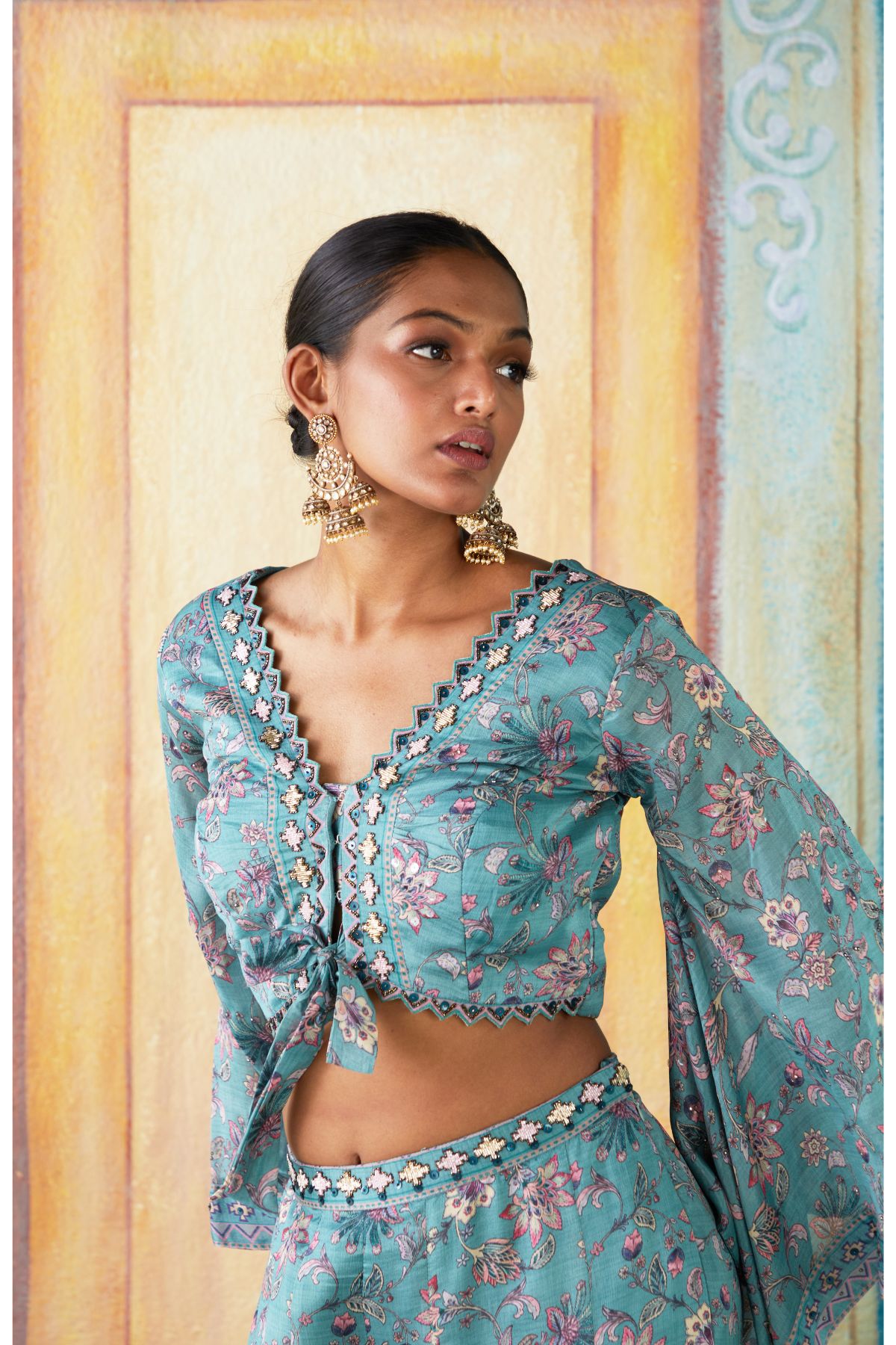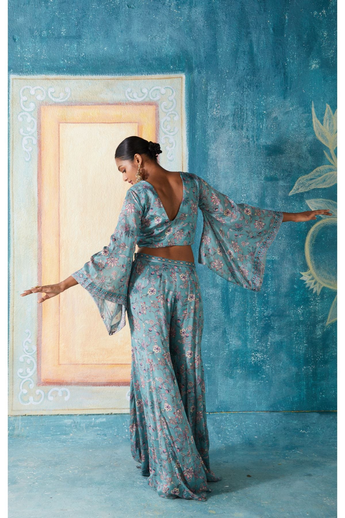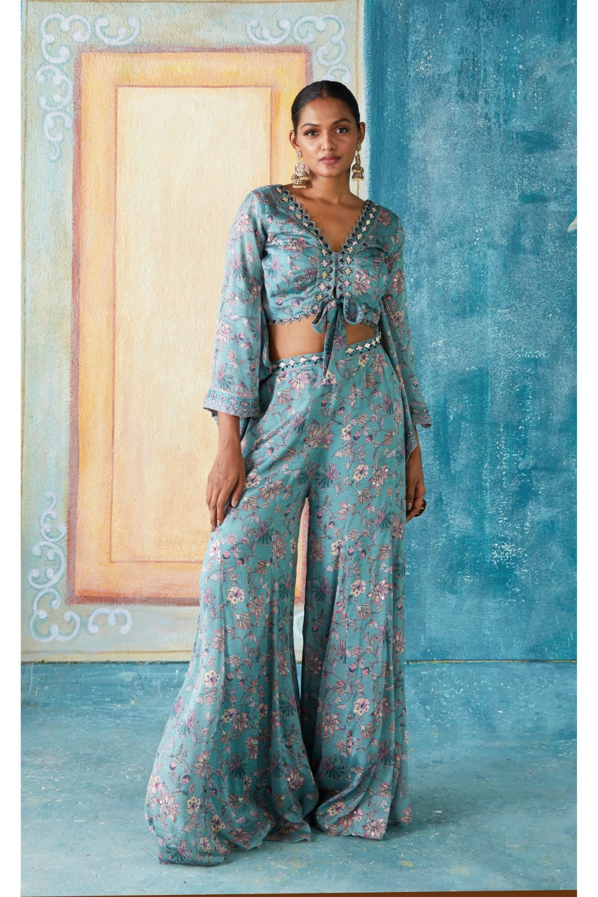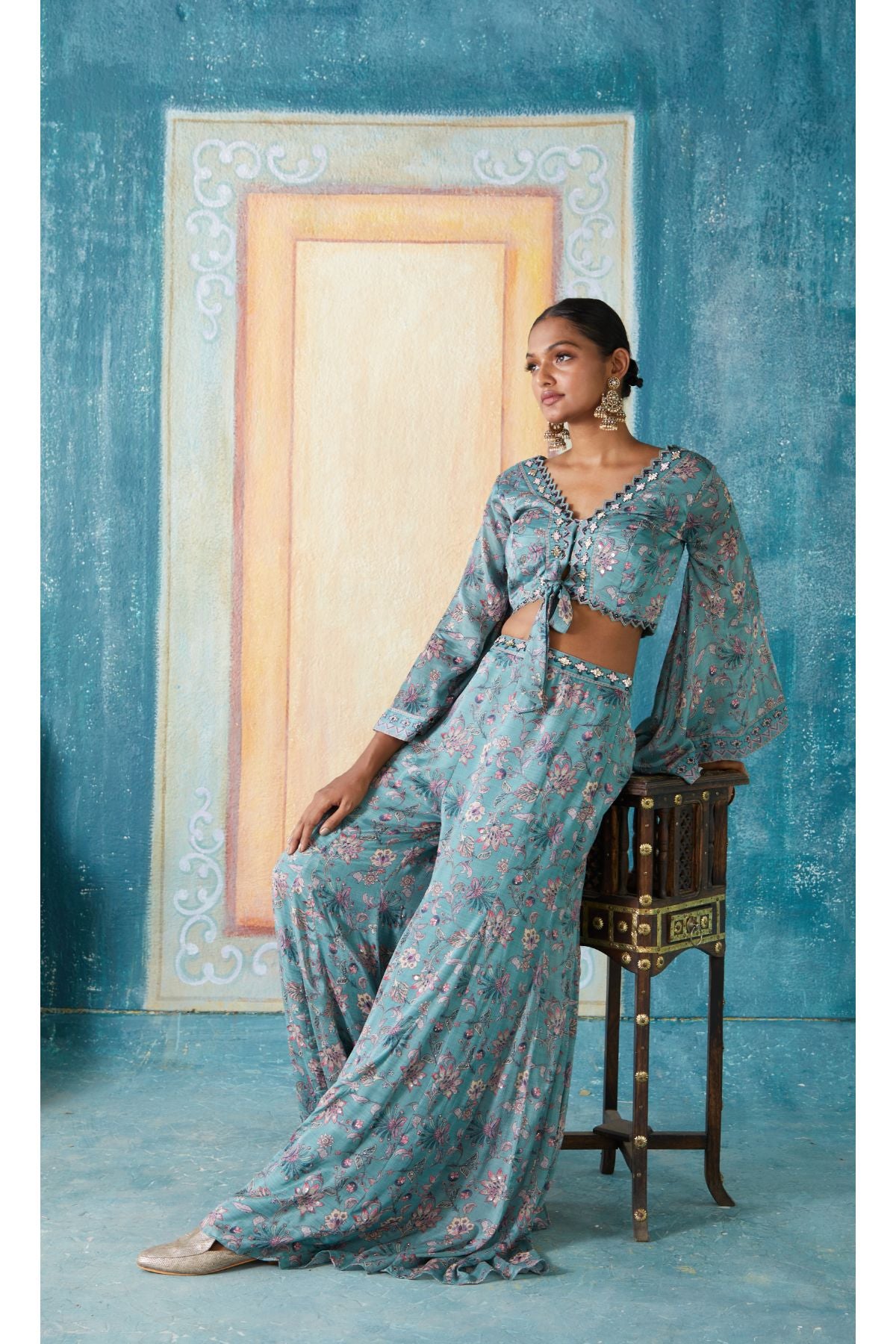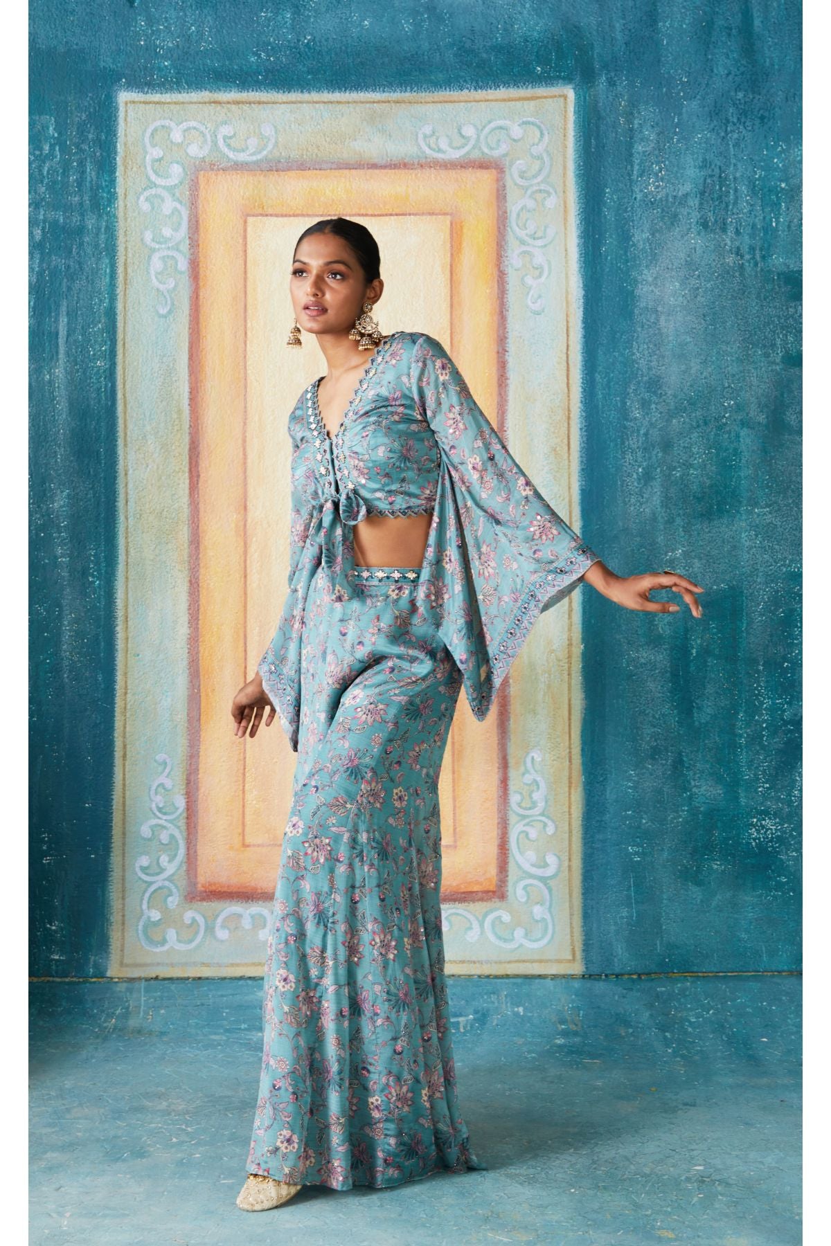 Grey Printed Pant Set With Hand Embroidery V - Neckline, Flared Sleeves And Front Bow Detailing