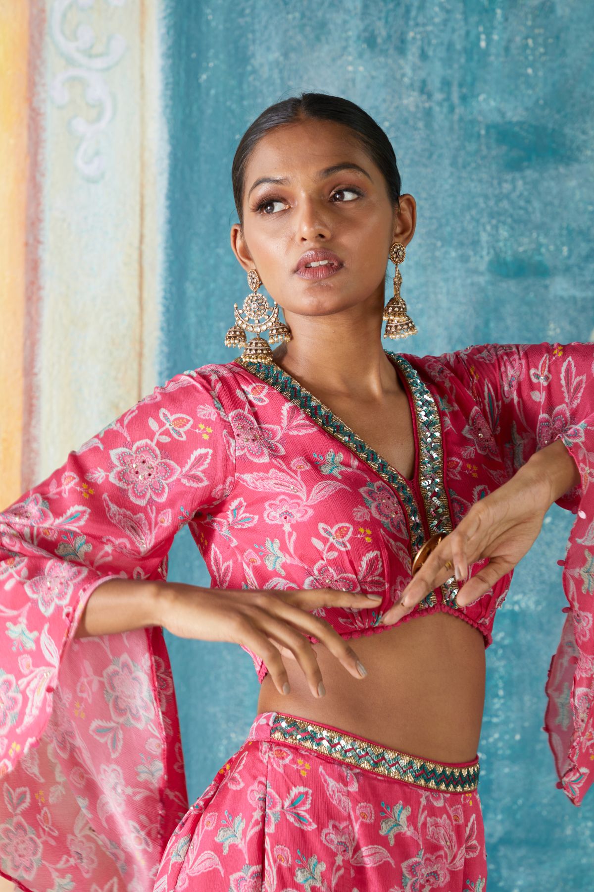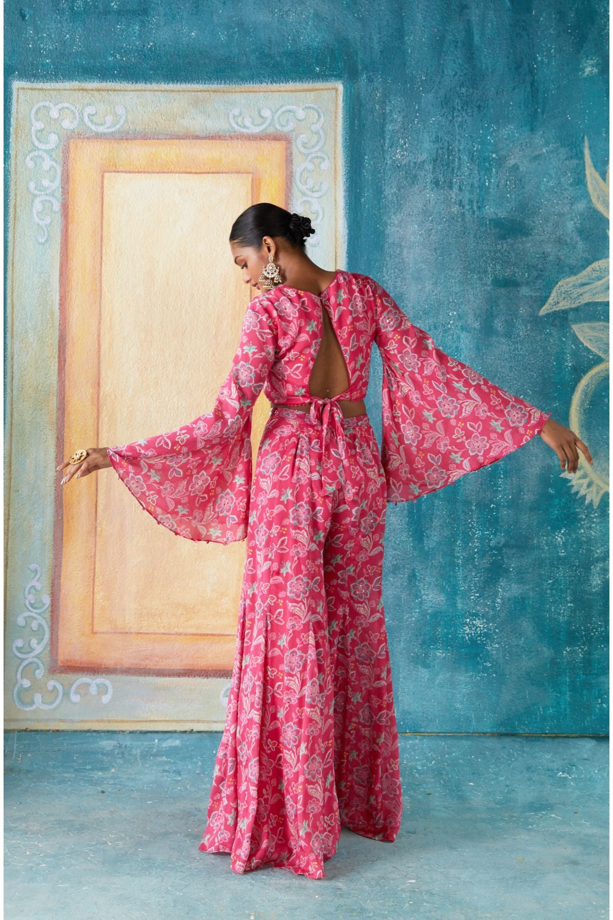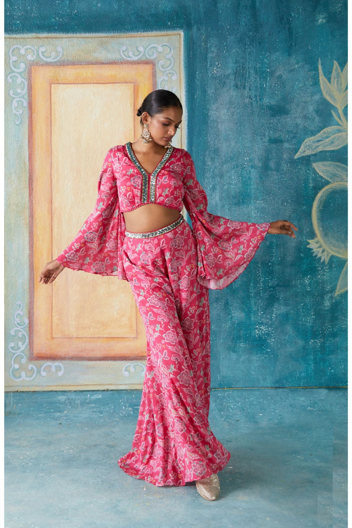 Pink Printed Pant Set With Hand Embroidery V- Neckline, Playful Flared Sleeves And Flowy Pant