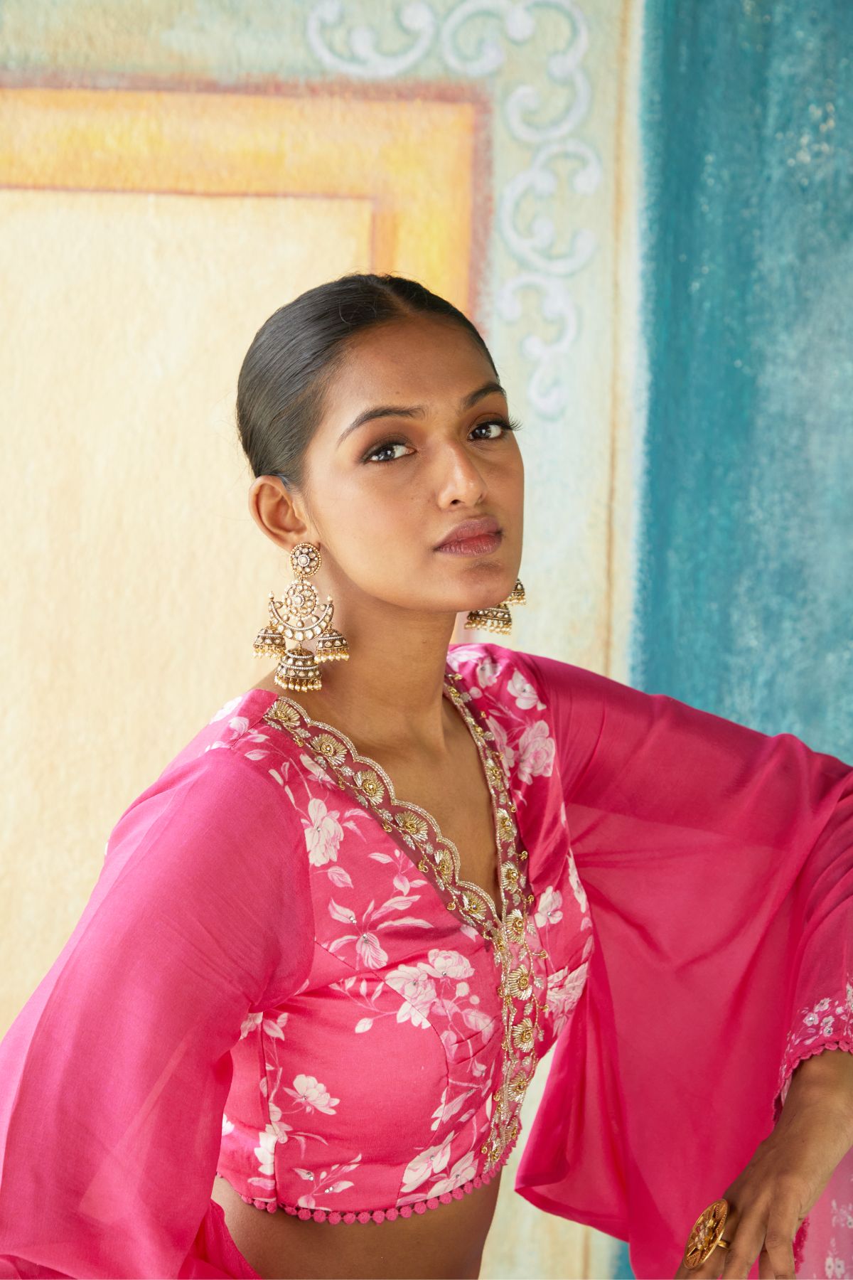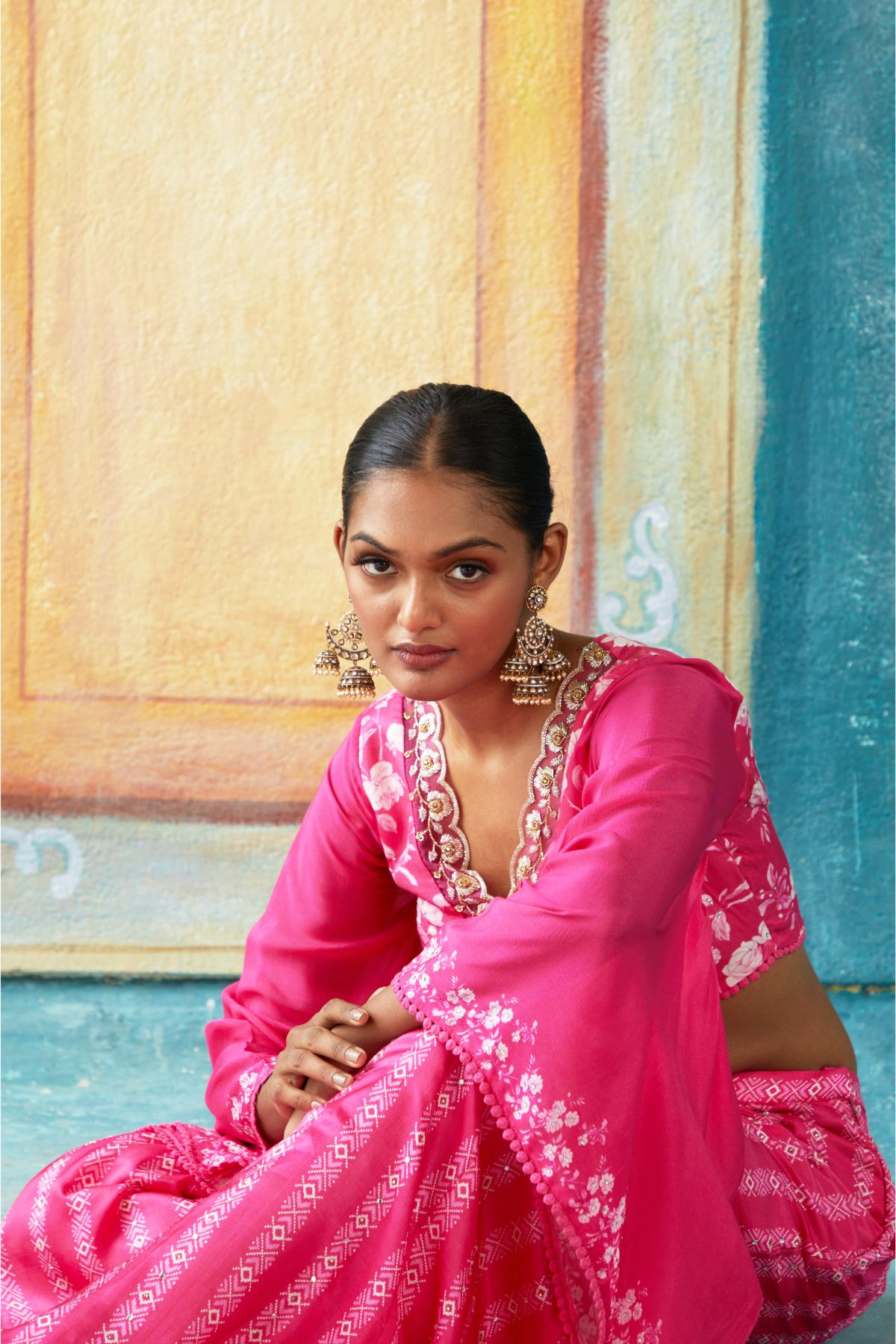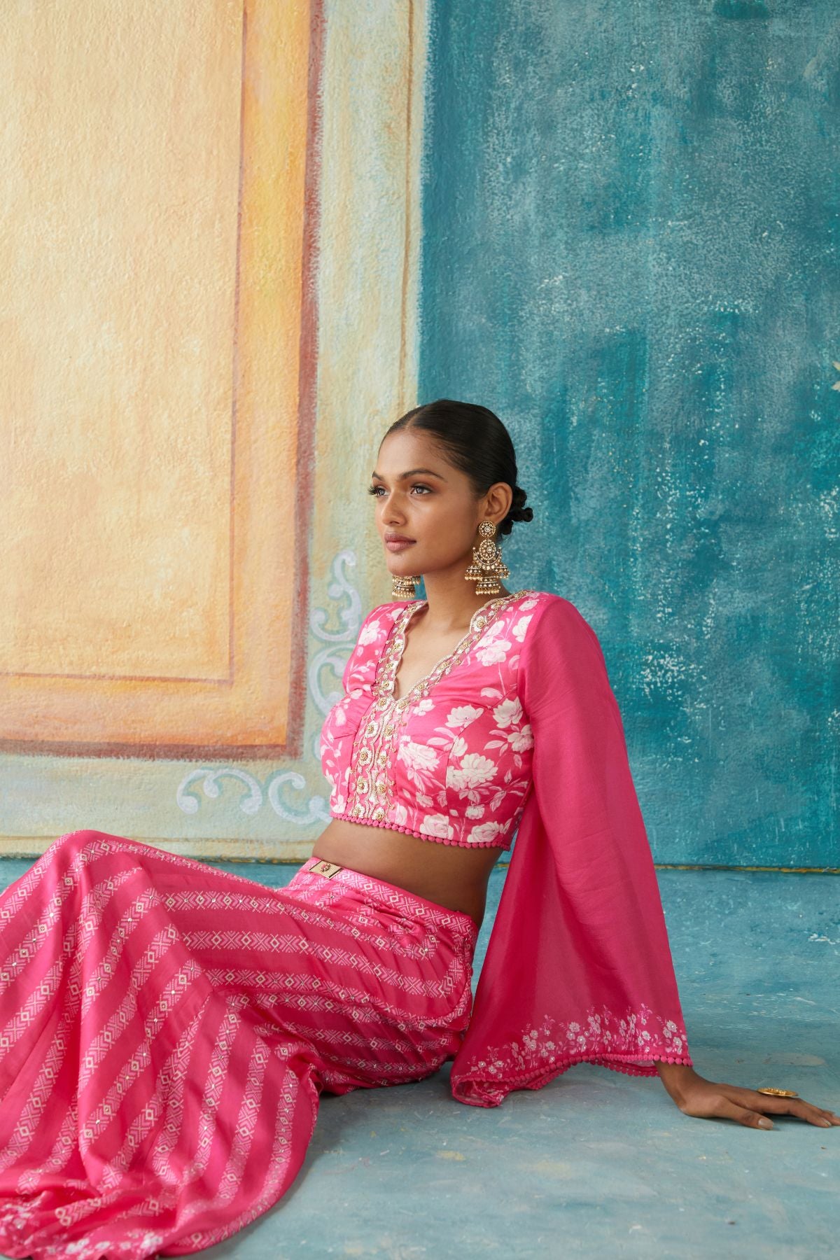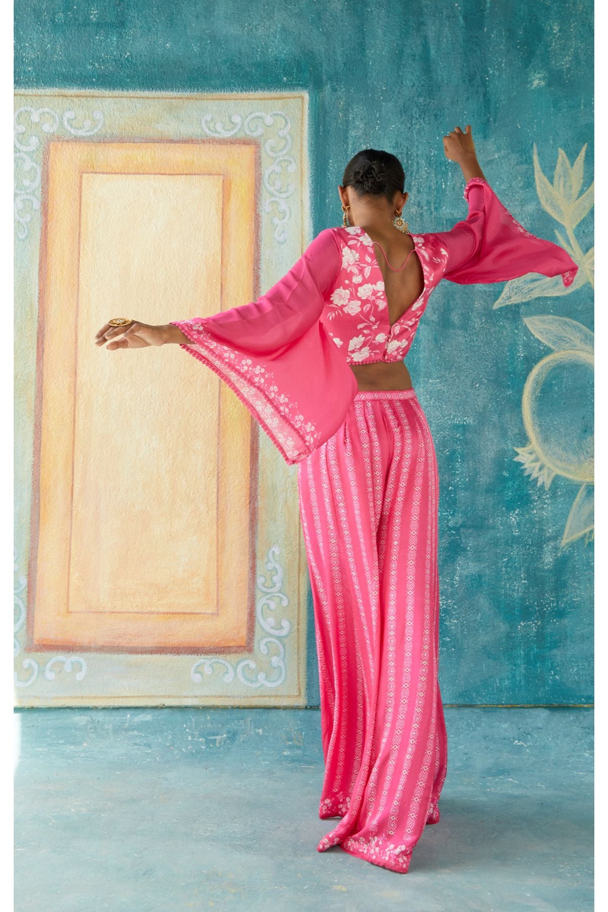 Pink Printed Pant Set With Hand Embroidery Neckline, Playful Flared Sleeves And Flowy Pant