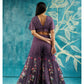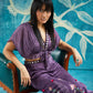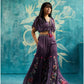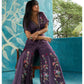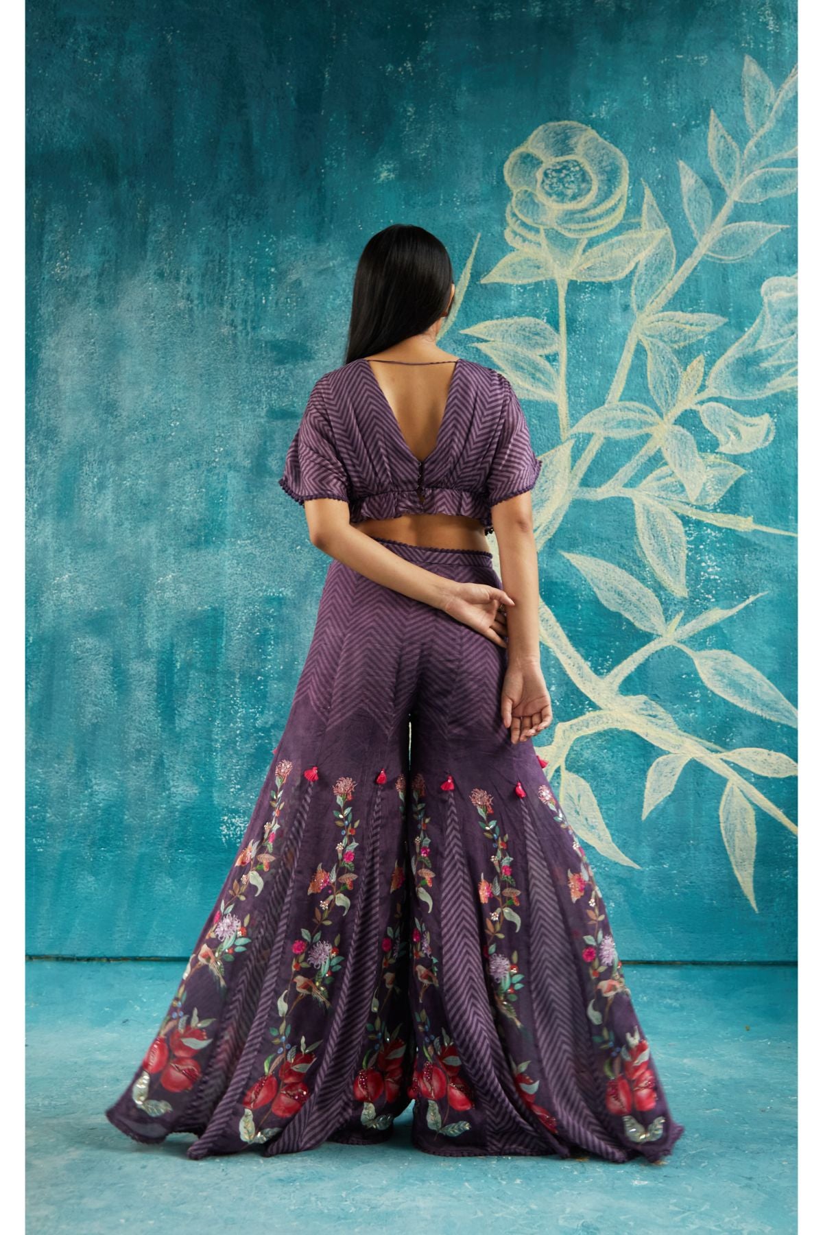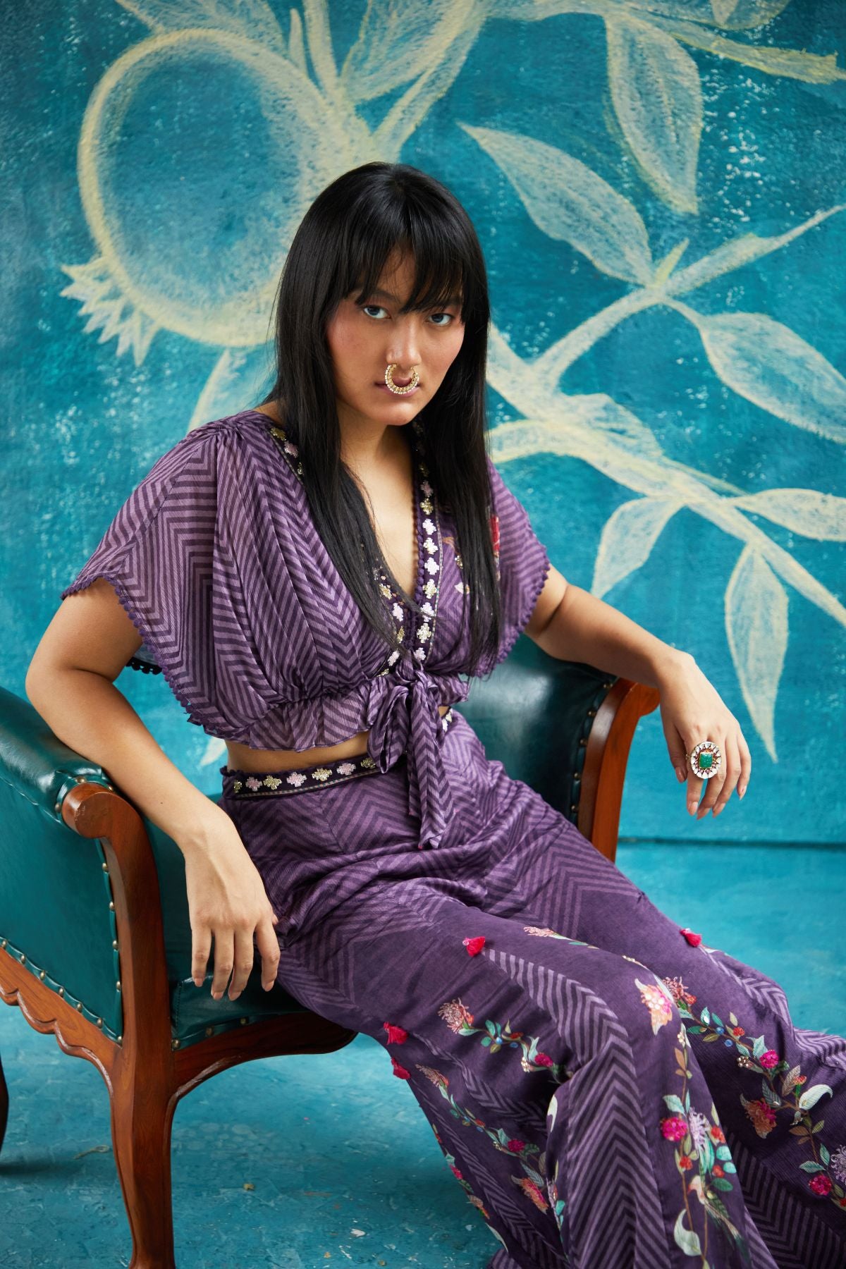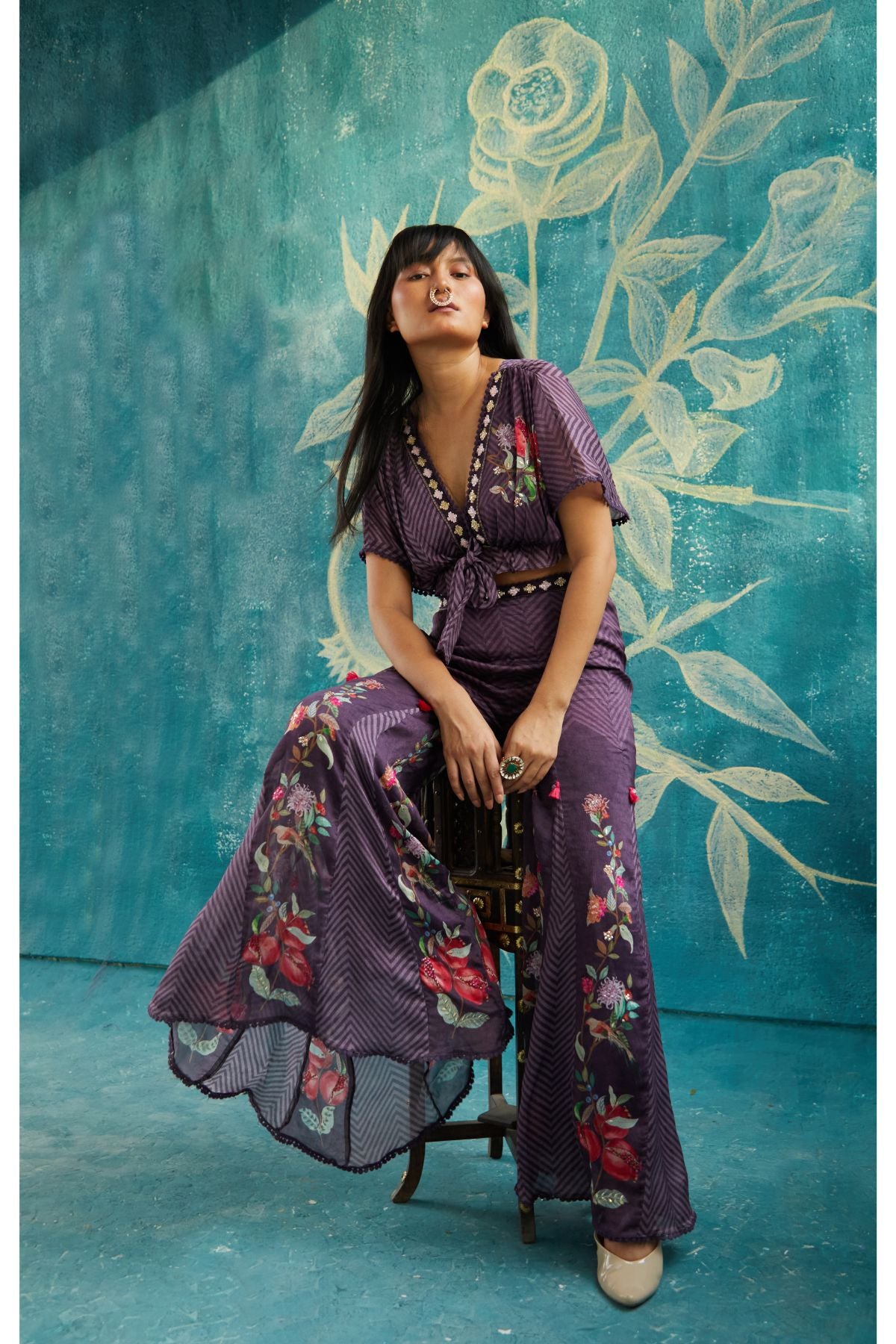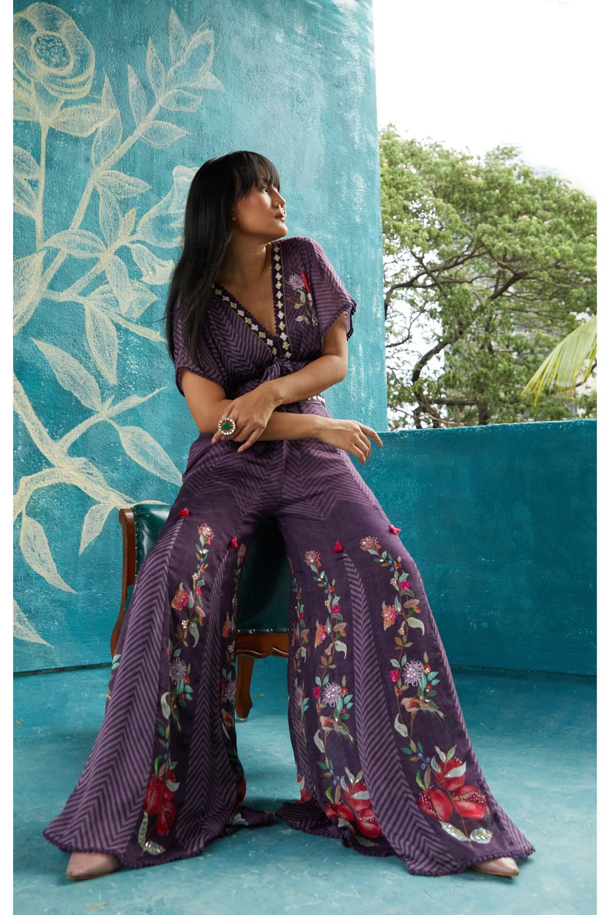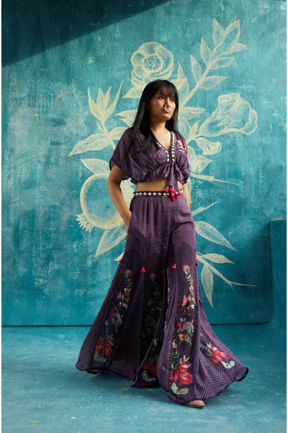 Wine Printed Pant Set With Embroidery V- Neckline, Front Bow Detailing And Easy flowing Pant