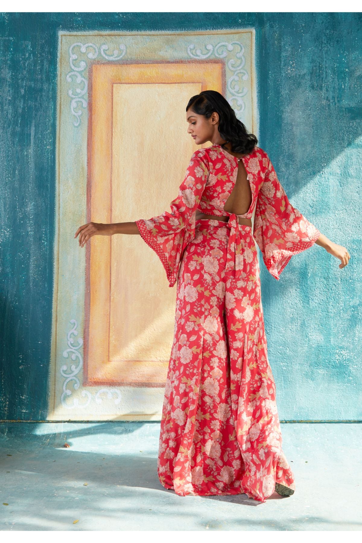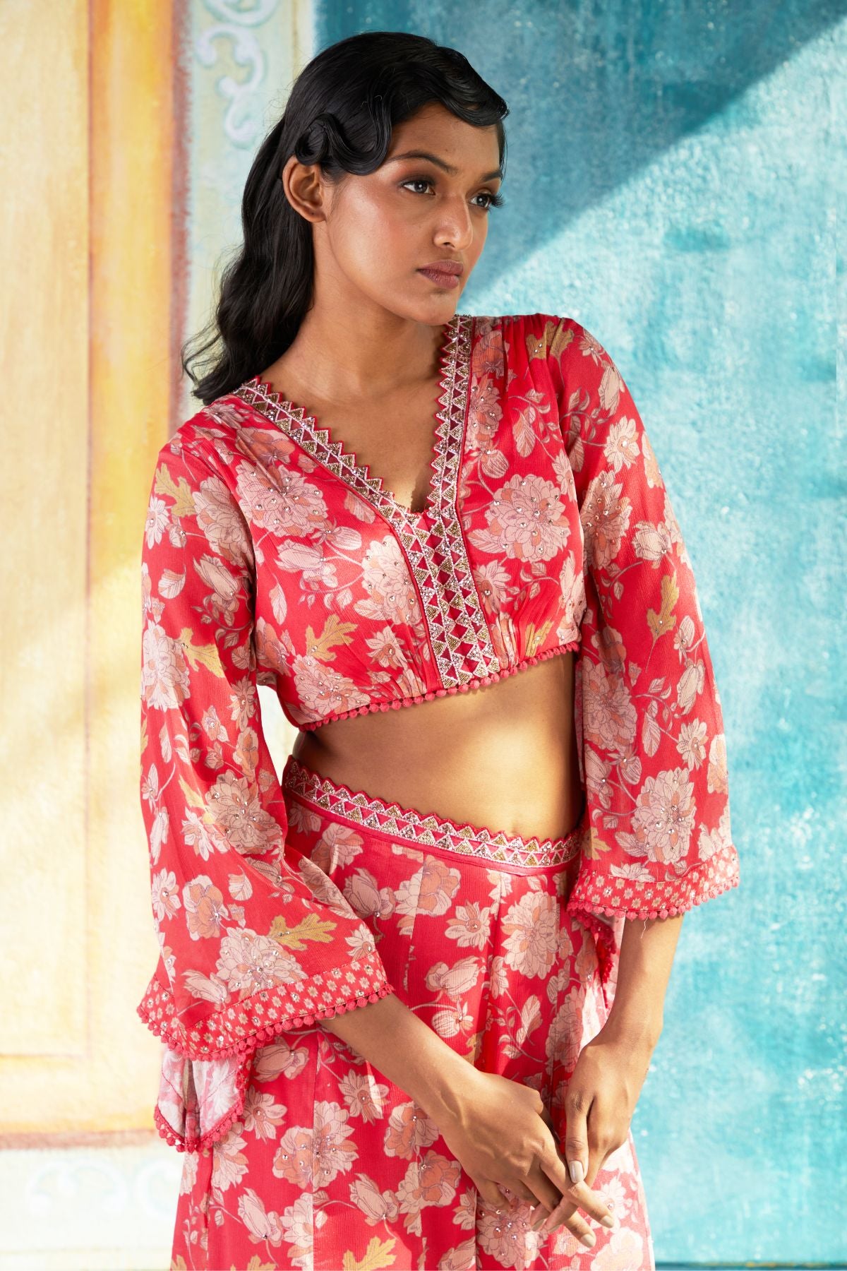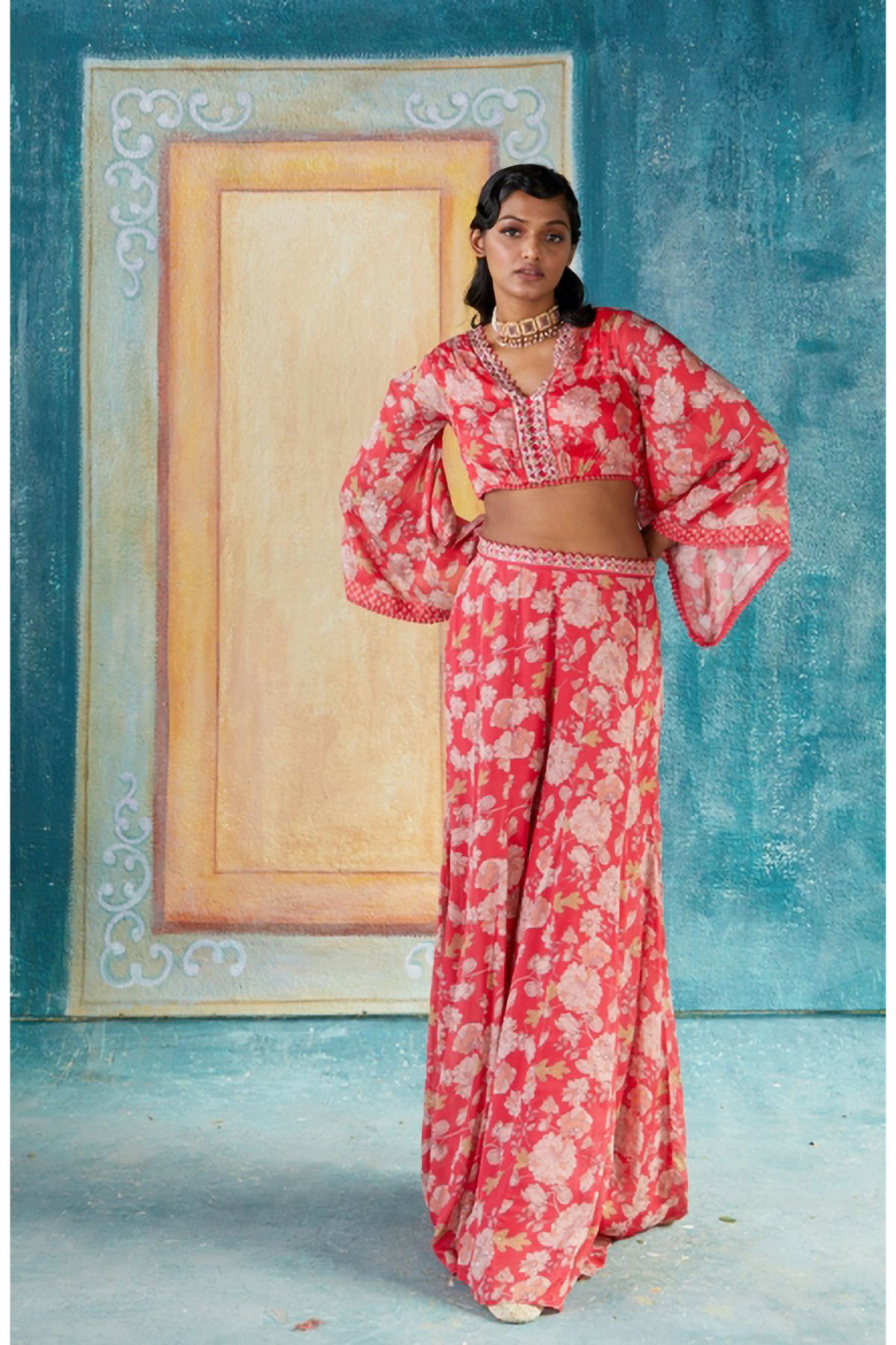 Red Printed Pant Set With Hand Embroidery V- Neckline, Flared Sleeves And Smooth Flowy Pant