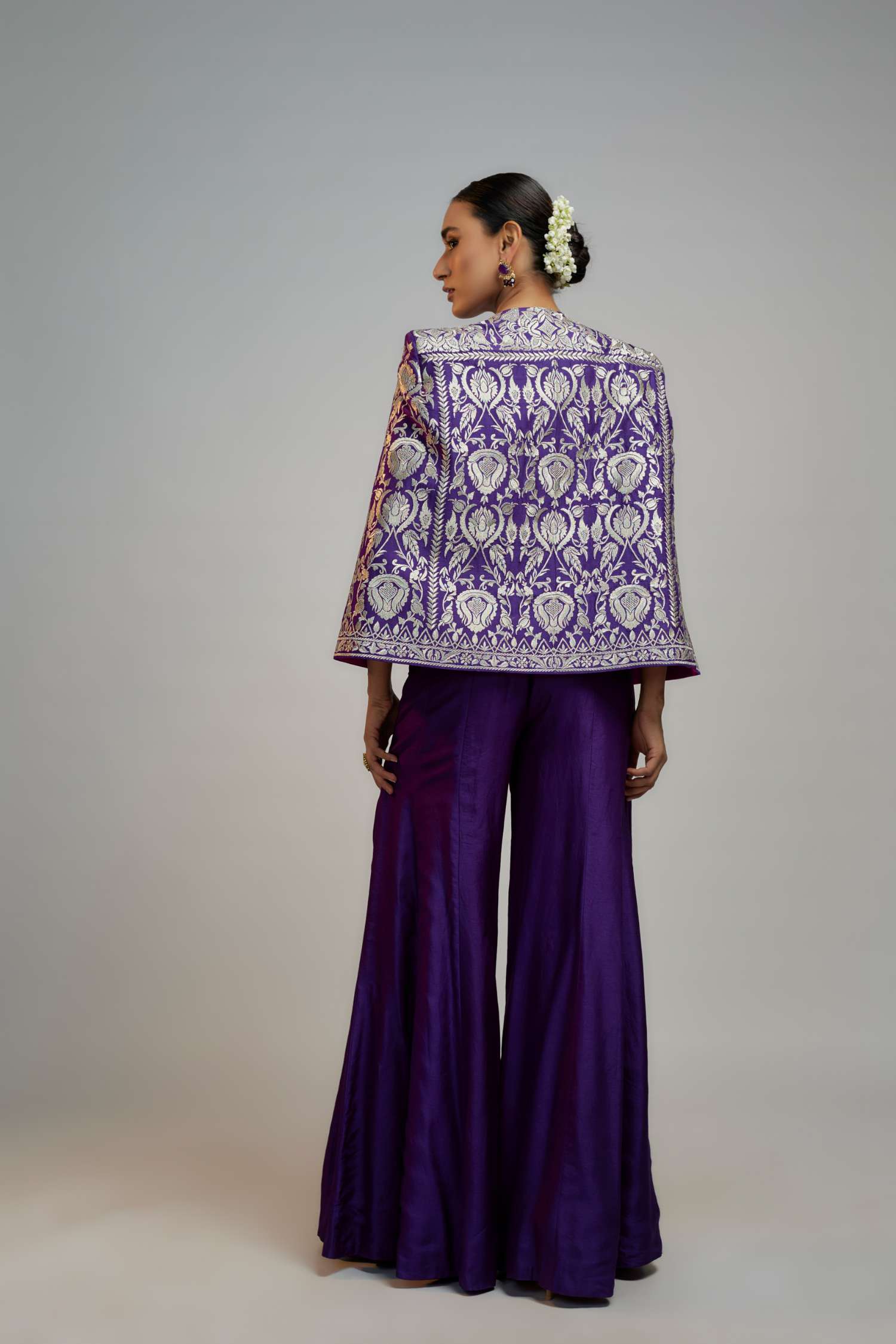 Presenting the magnificent pant set with a blazer—an ensemble seamlessly blending traditional craftsmanship with contemporary design. This exquisite outfit showcases intricate detailing and threadwork, resulting in a mesmerizing tapestry of captivating patterns and designs.