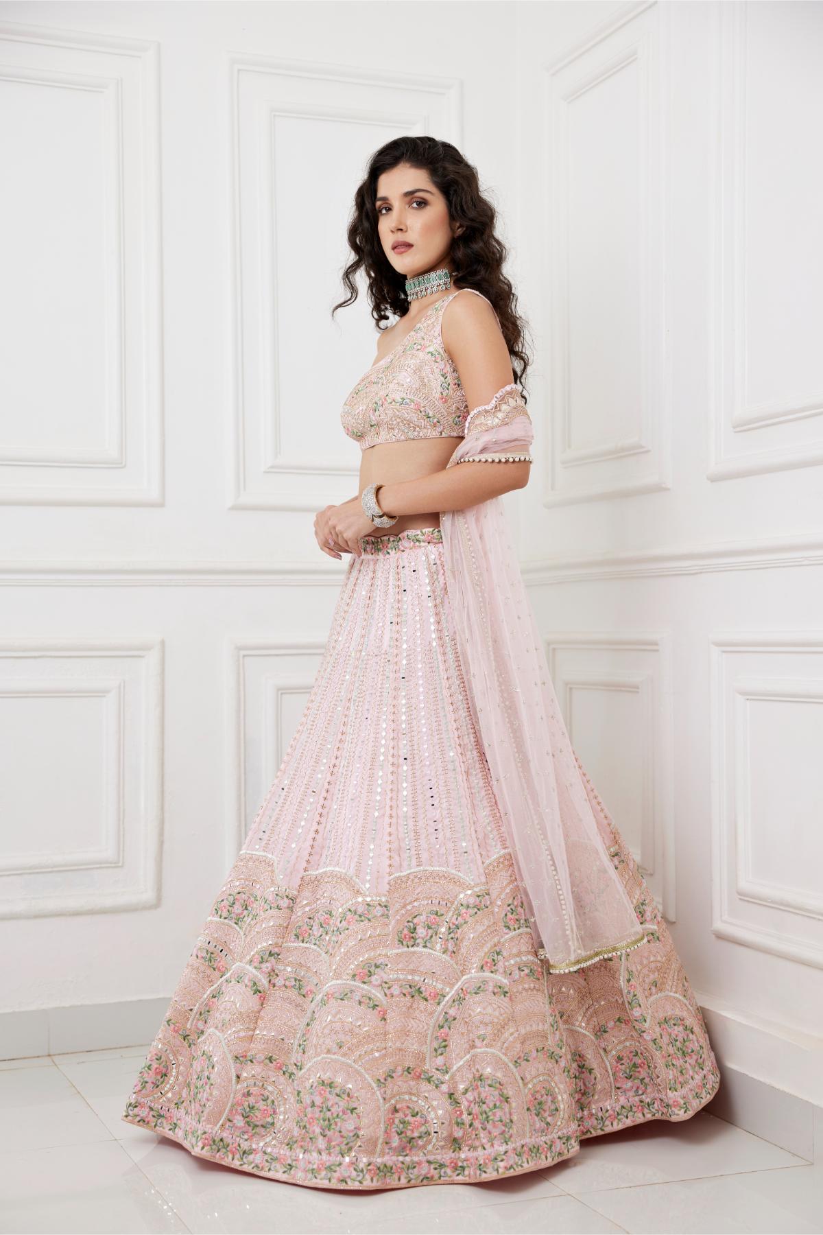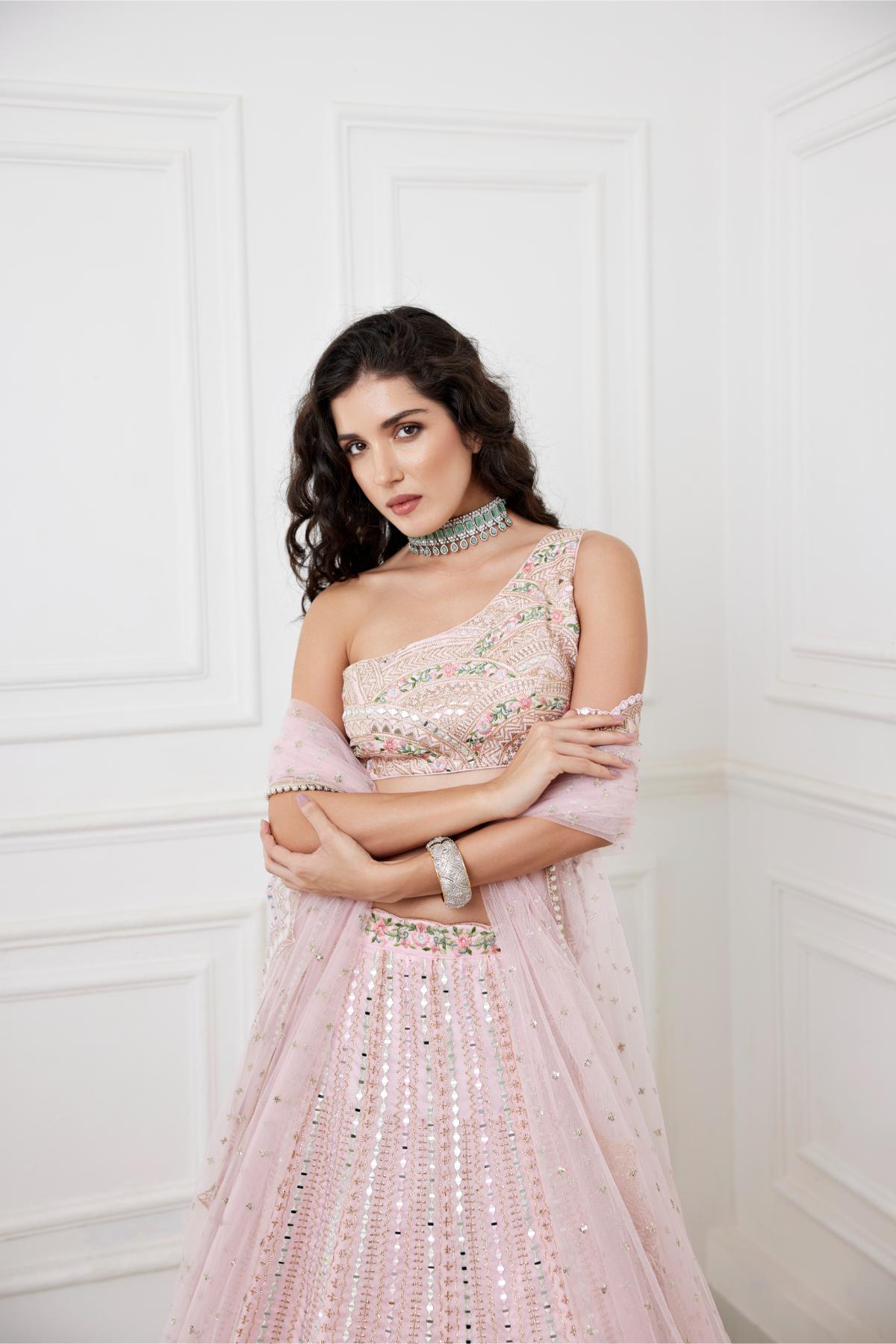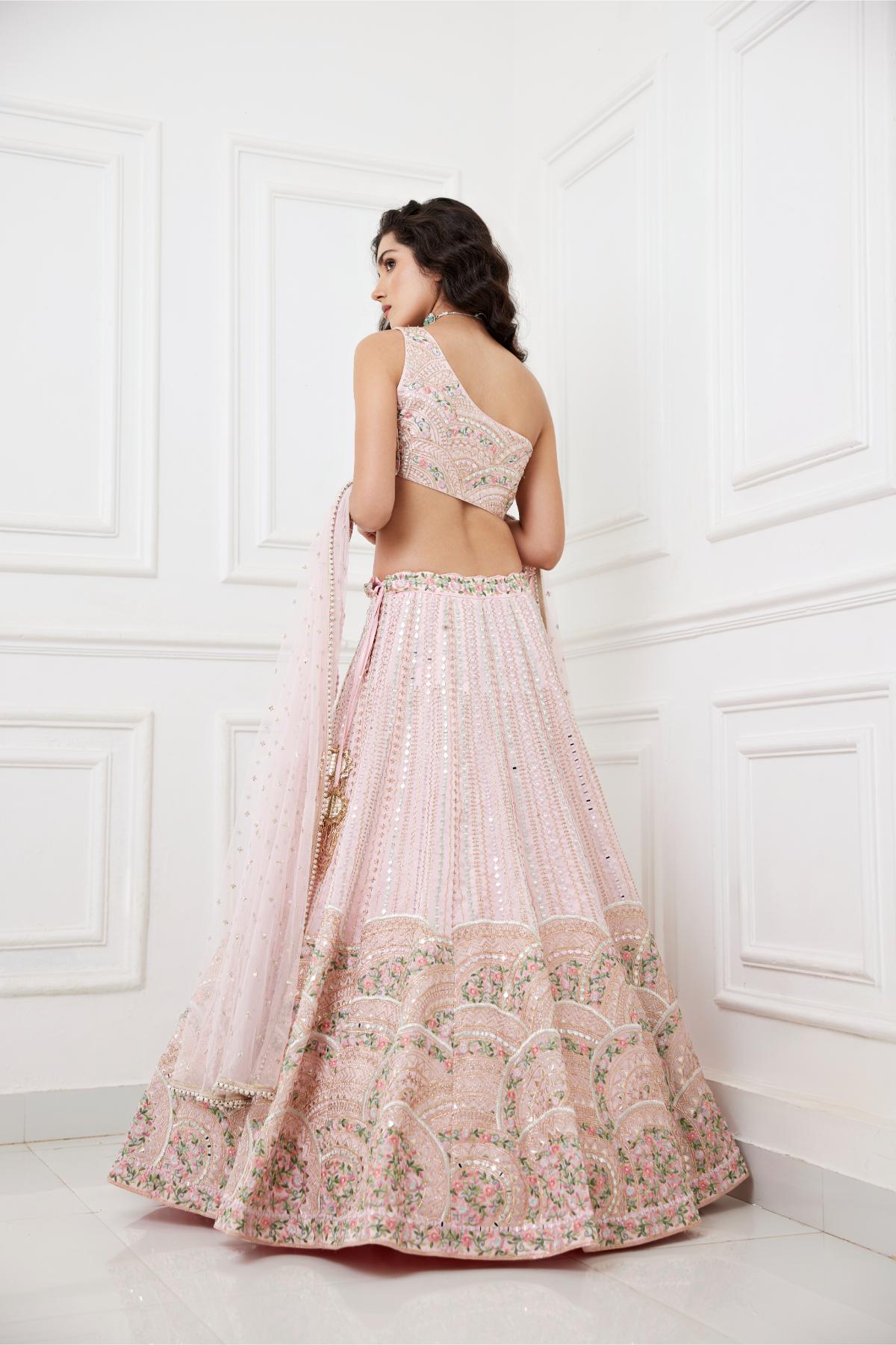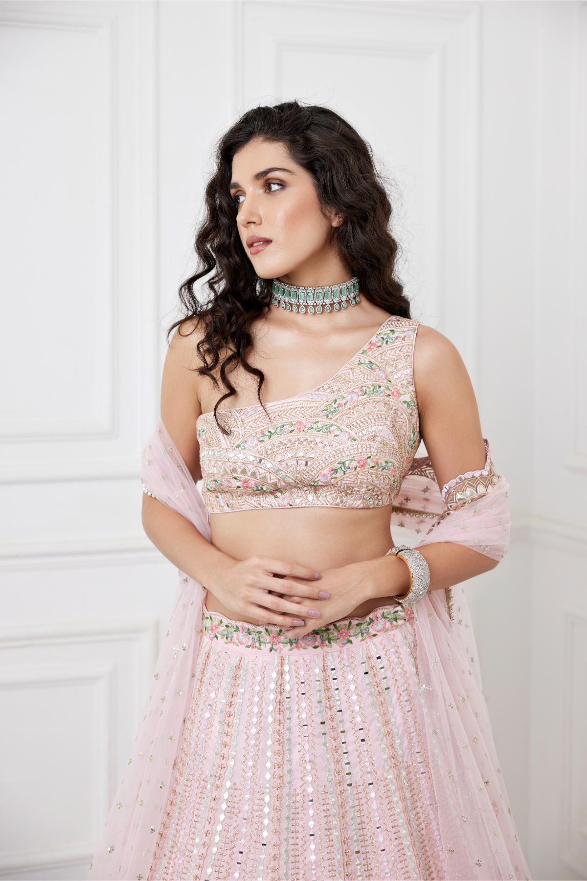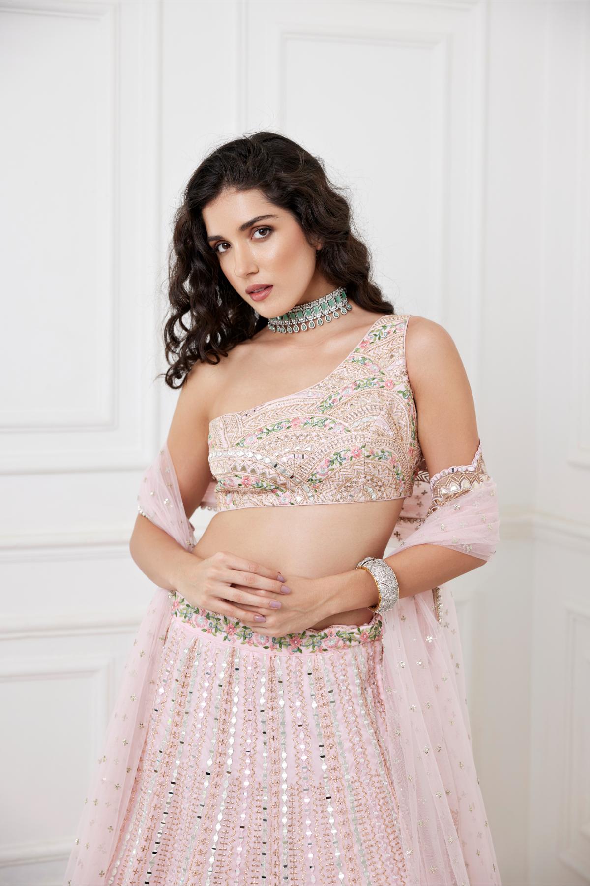 Light Pink Flared Organza Lehenga With Heavily Embroidered Resham, Mirror And Thread Work One Shoulder Blouse And A Tulle Dupatta