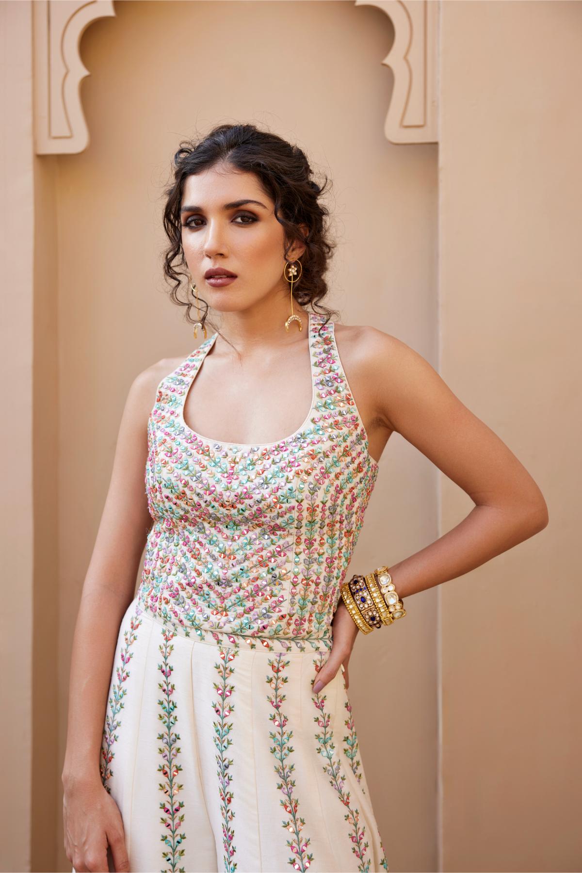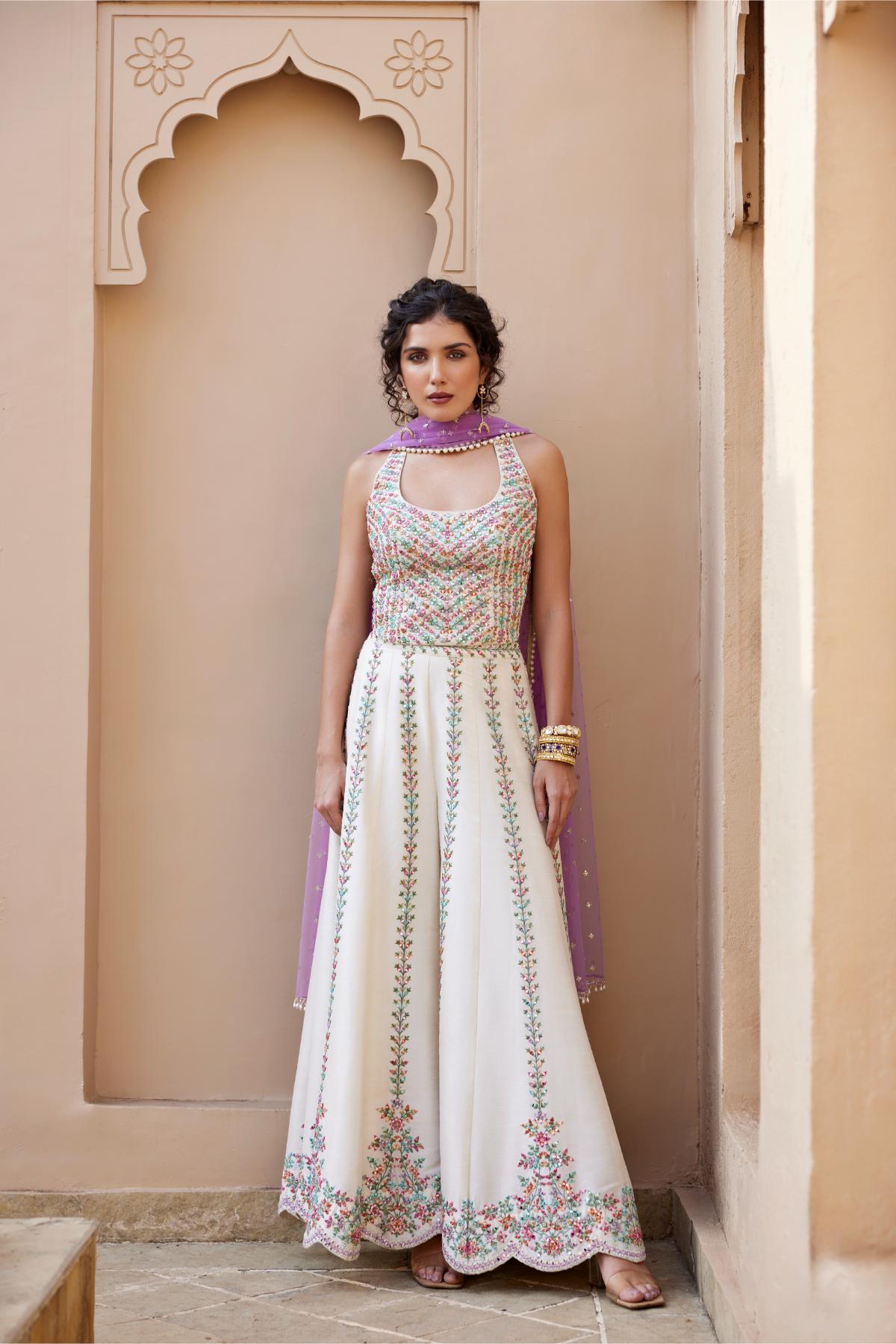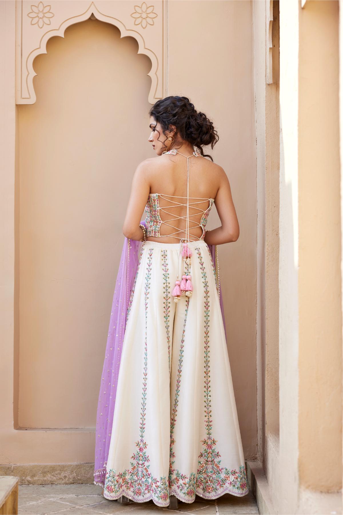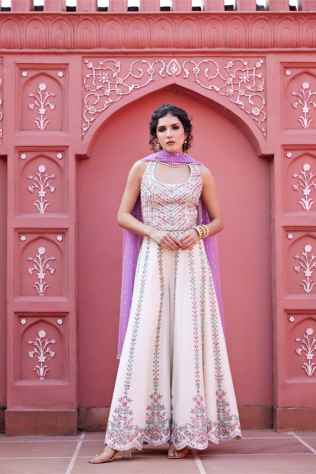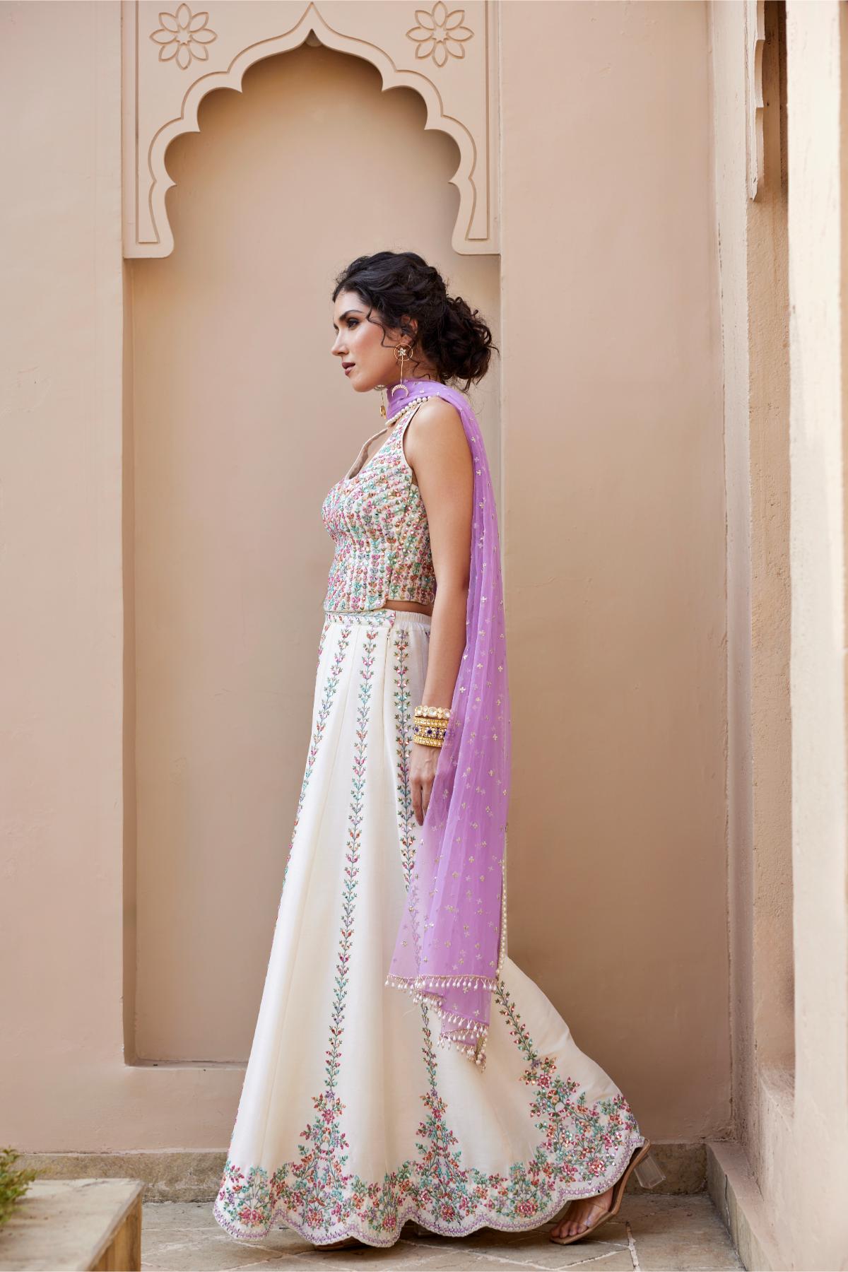 Mirror And Colorful Resham Embroidered Ivory Dupion Silk Top And Flared Pant Paired With Contrast Lavender Tulle Dupatta With Pearl Embroidery Detailing