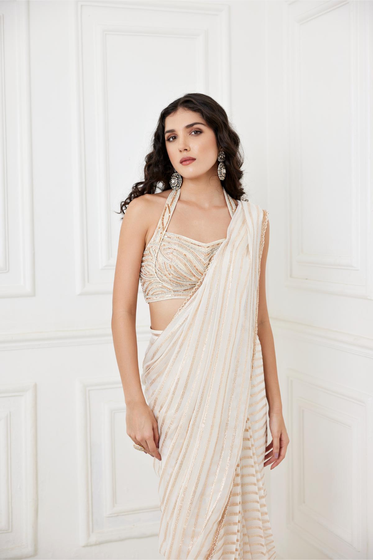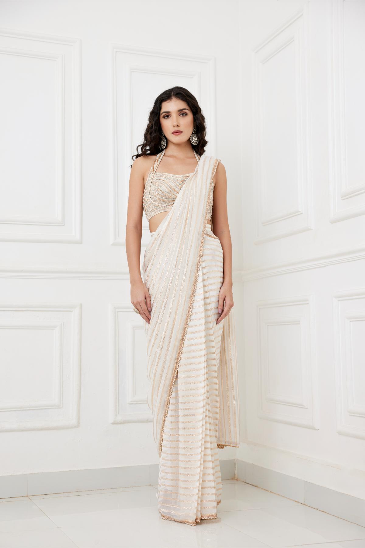Ivory Georgette Saree With Zari Lines Paired With Heavily Embroidered Glass Beads And Sequins Work Halter Neck Blouse