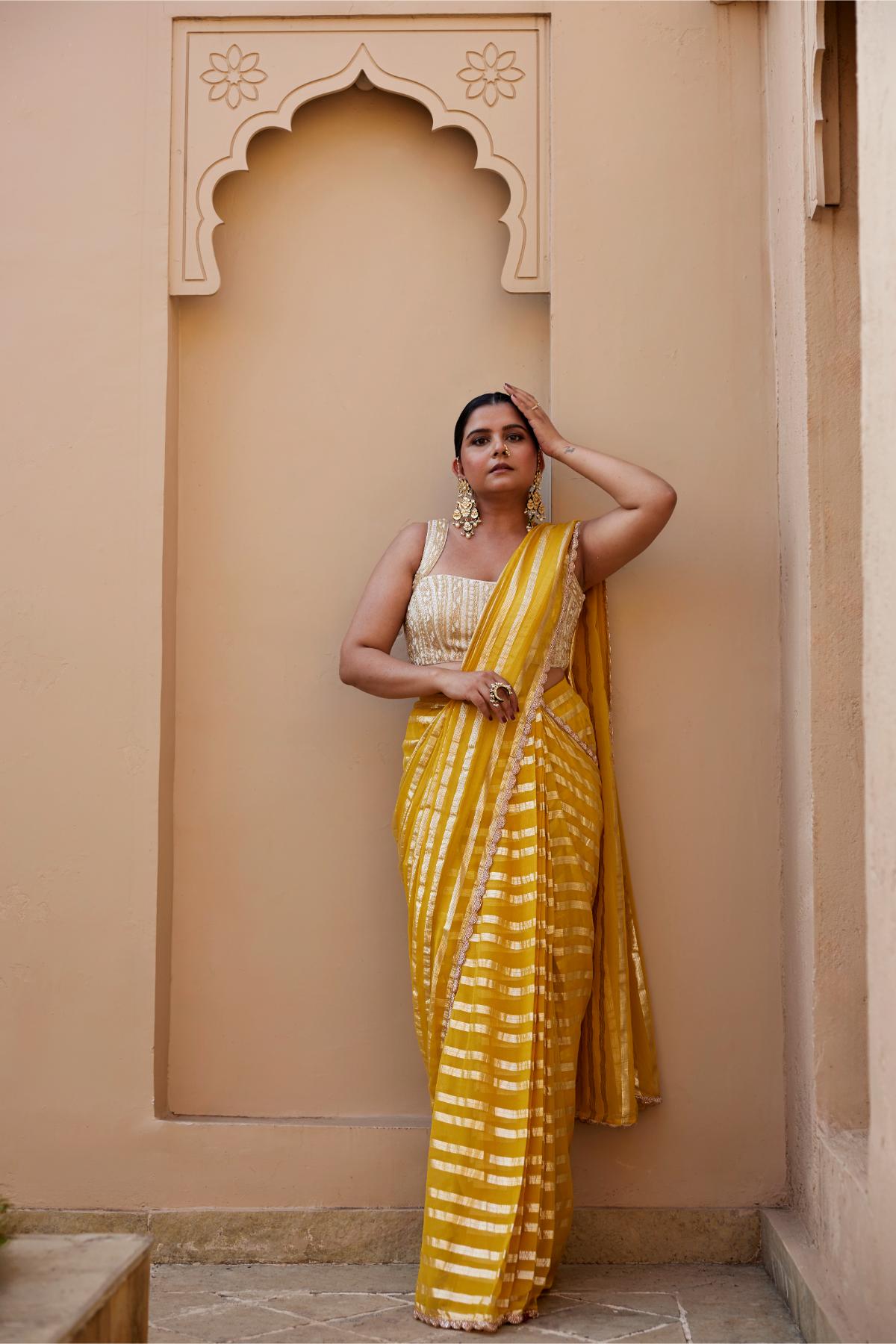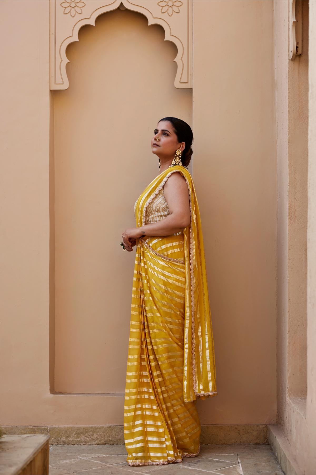 Yellow Georgette Saree With Delicate Embroidered Border Paired With Contrast Ivory Glass Beads And Pearl Work Embroidered Blouse