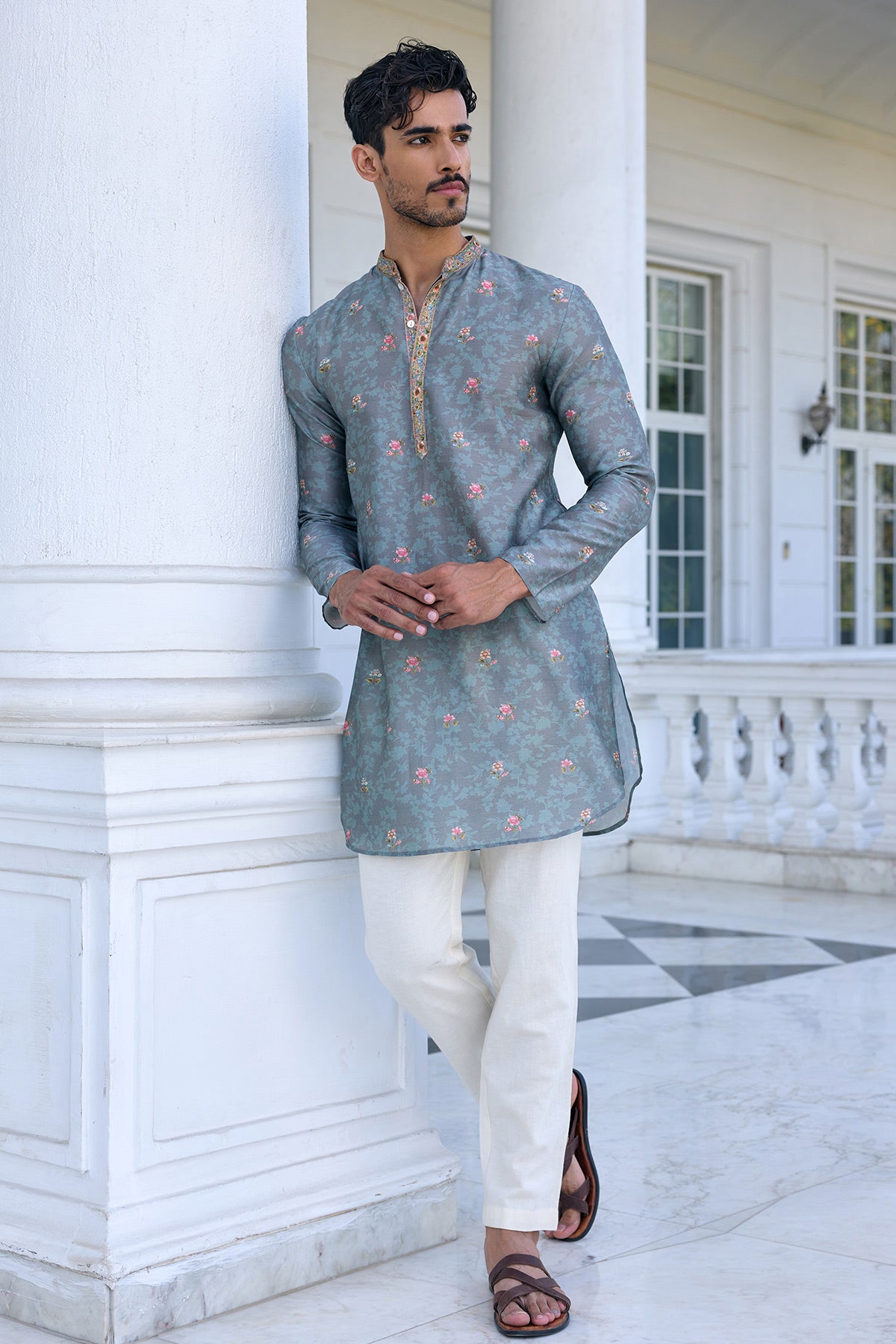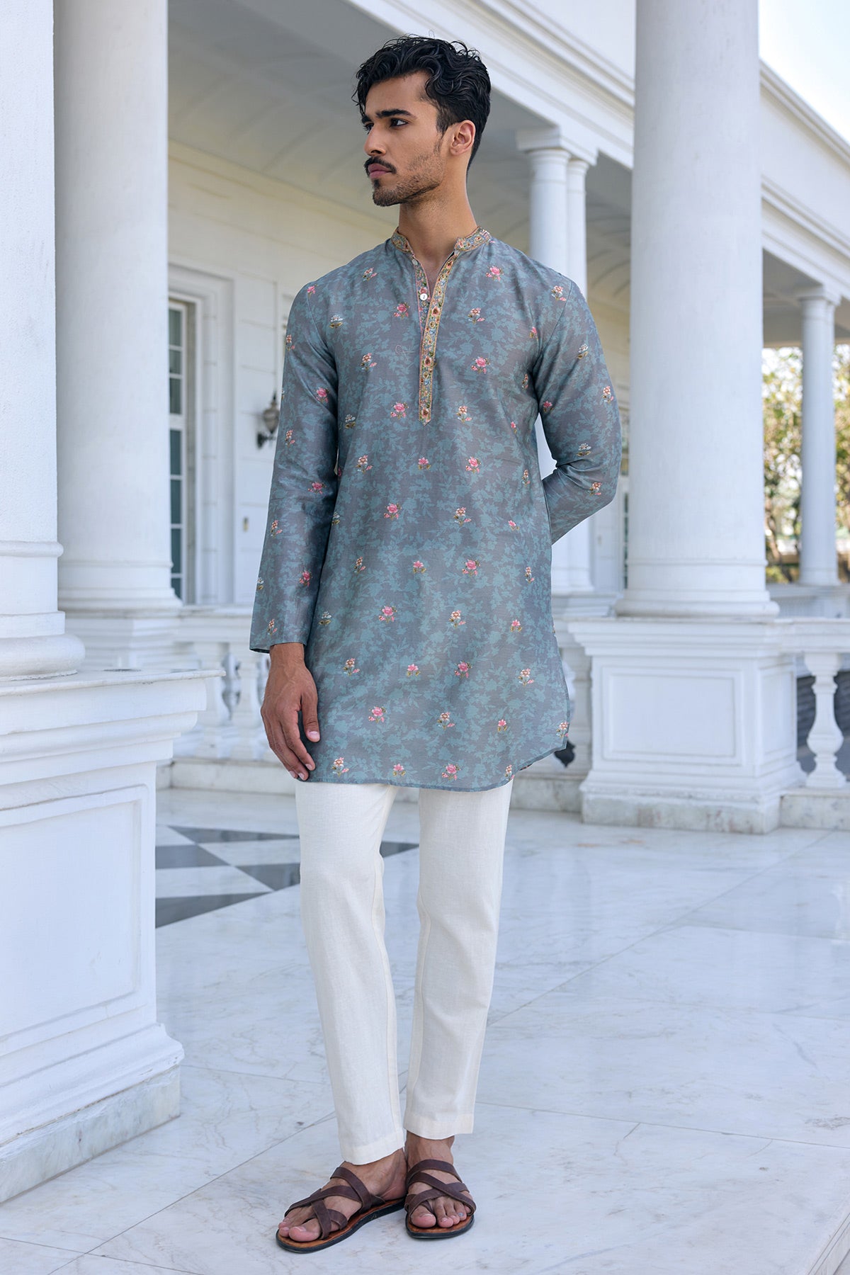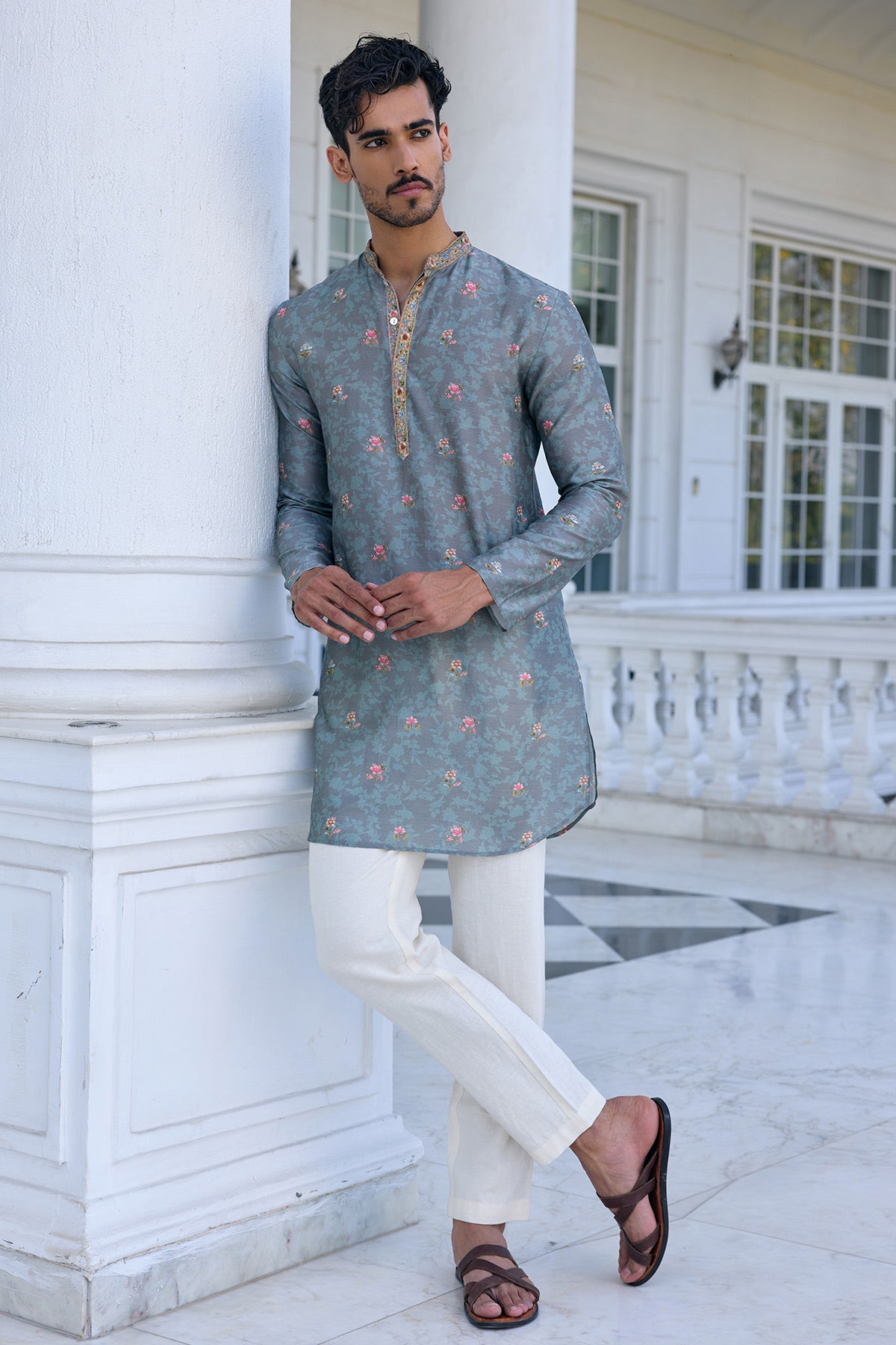 Stand Out In Our Rayan Kurta Set , Highlighted With Classic Miniature Motifs And Embroidered Placket With Mandarin Collar, Adorned With Beads, Sequins, And Threads. It Is Paired With Contrasting Pants, Creating A Perfect Balance Of Elegance And Style.