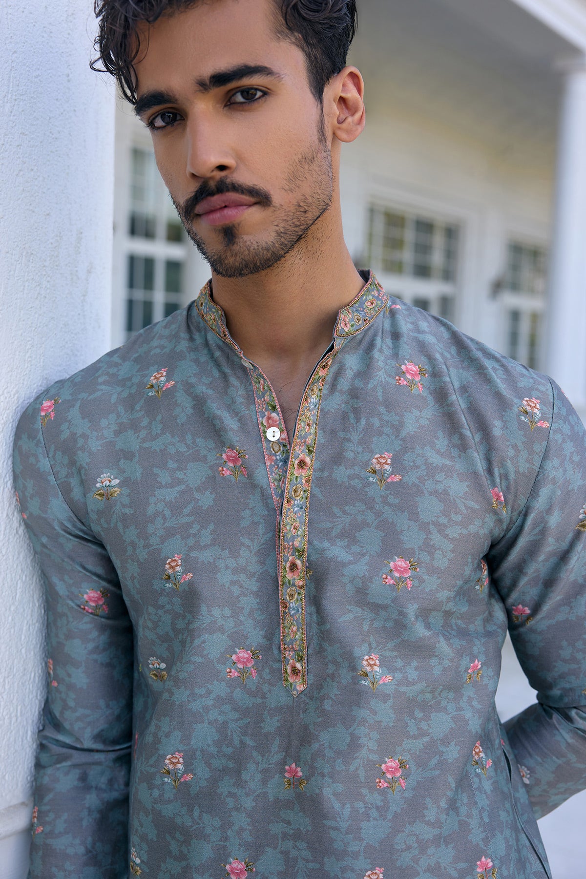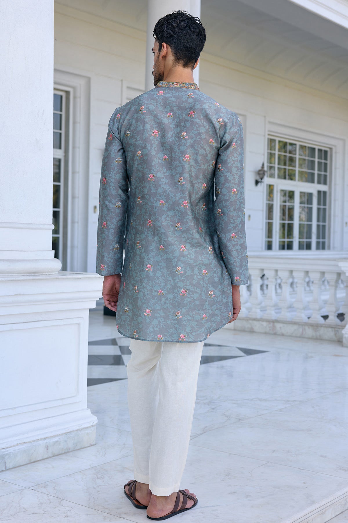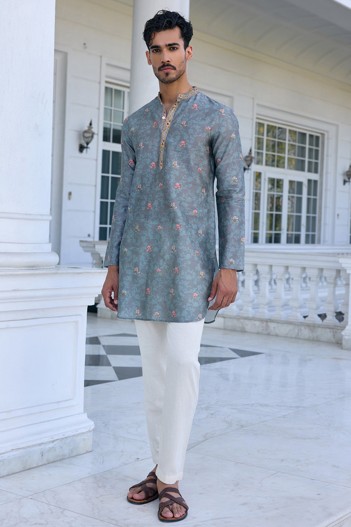 Stand Out In Our Rayan Kurta Set , Highlighted With Classic Miniature Motifs And Embroidered Placket With Mandarin Collar, Adorned With Beads, Sequins, And Threads. It Is Paired With Contrasting Pants, Creating A Perfect Balance Of Elegance And Style.