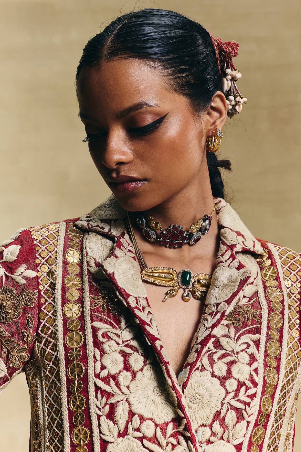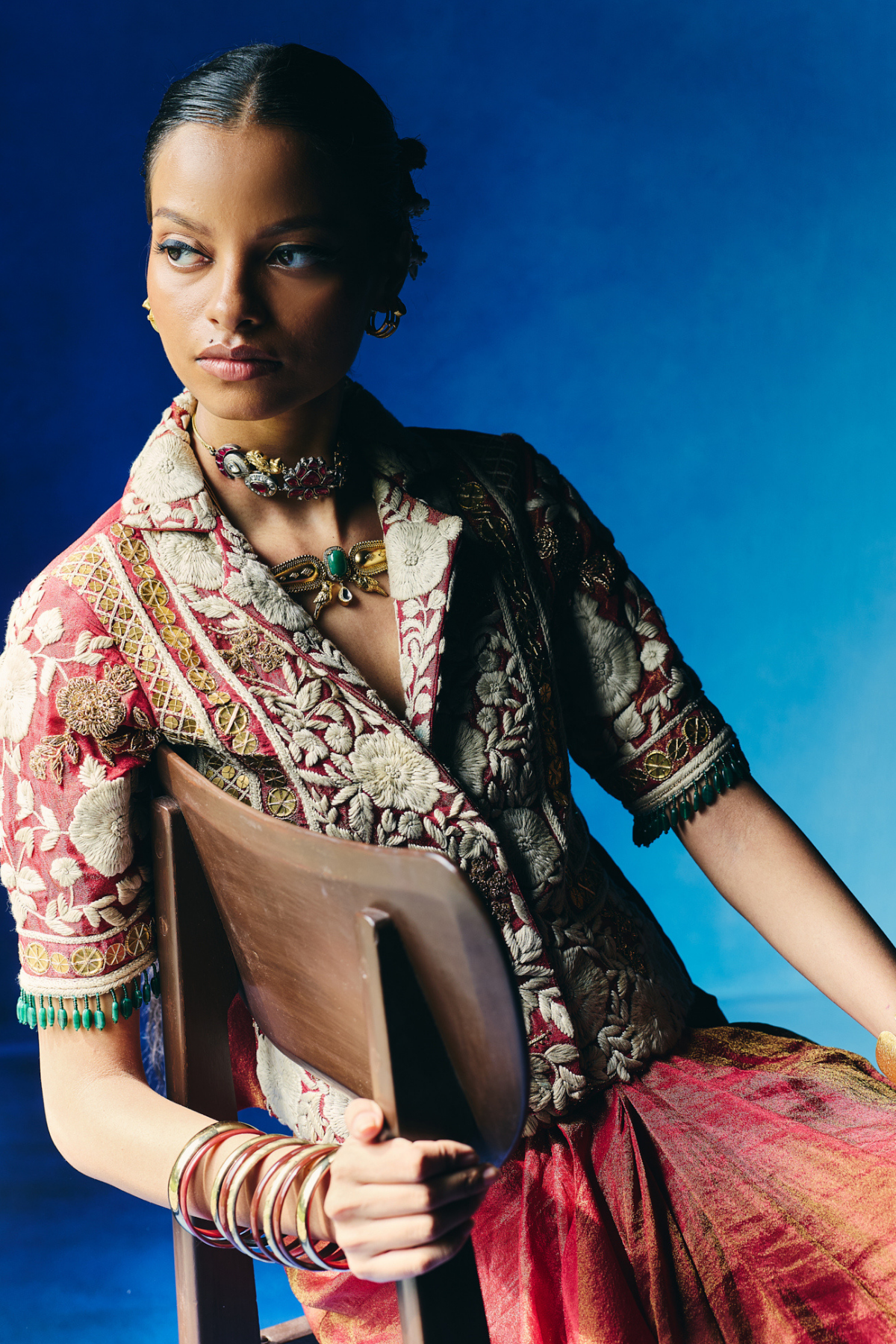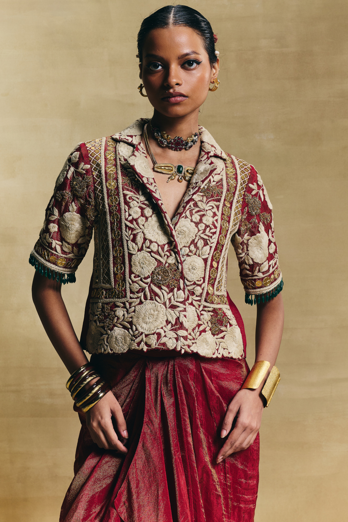Red blazer with draped skirt