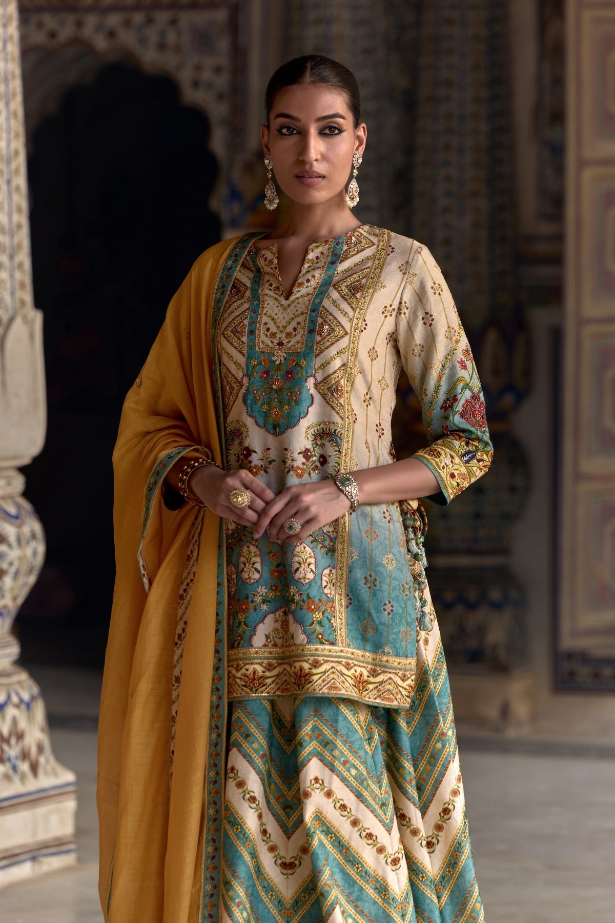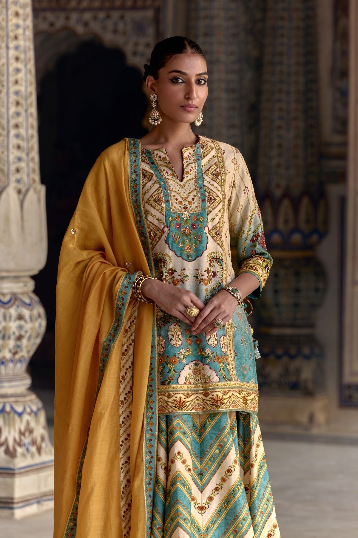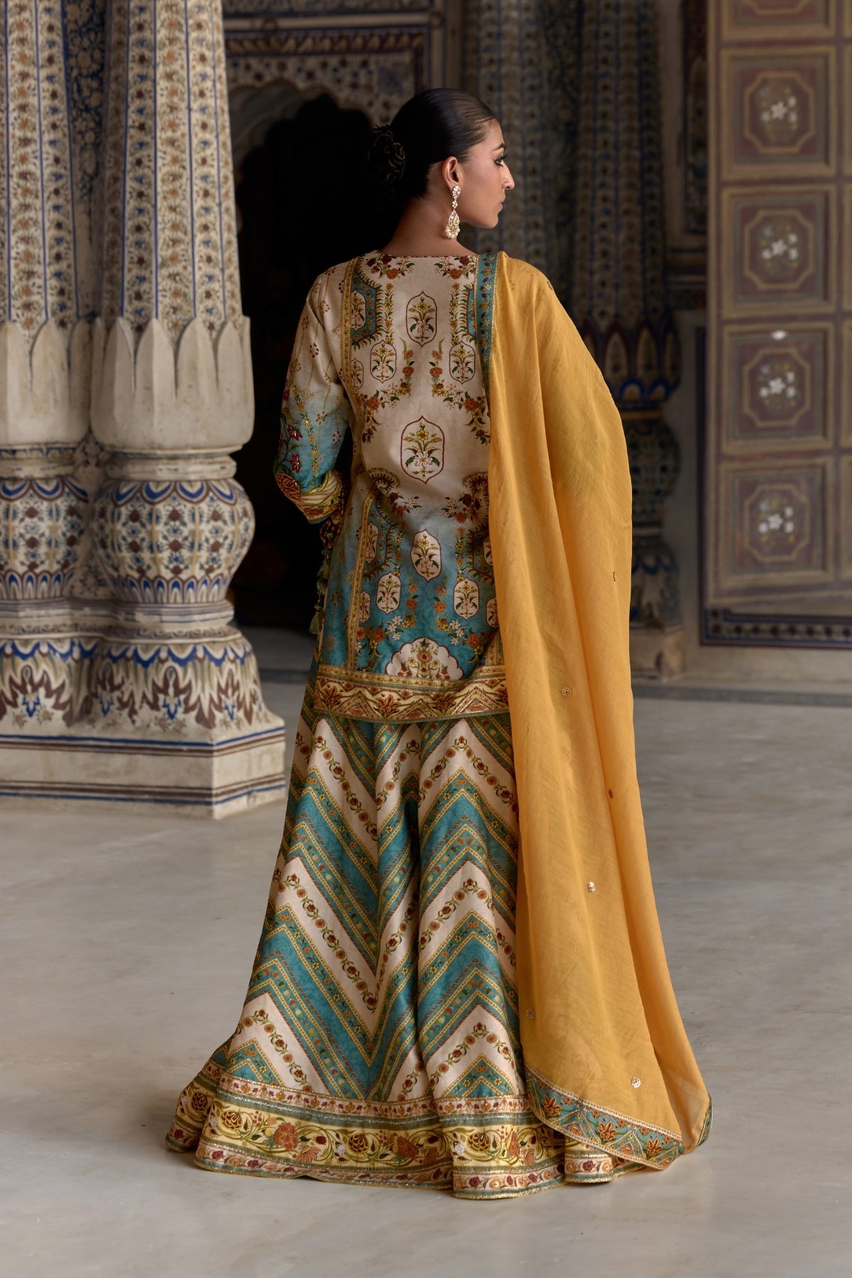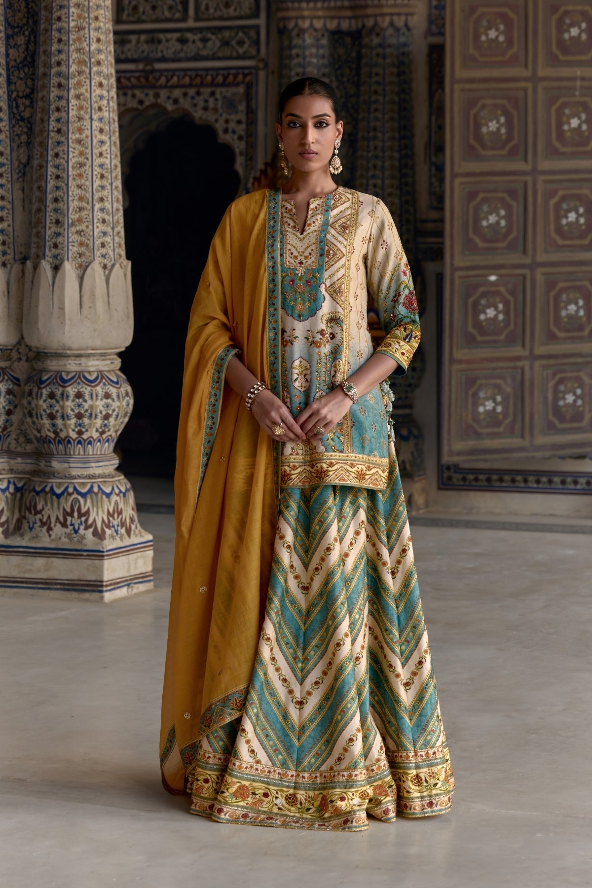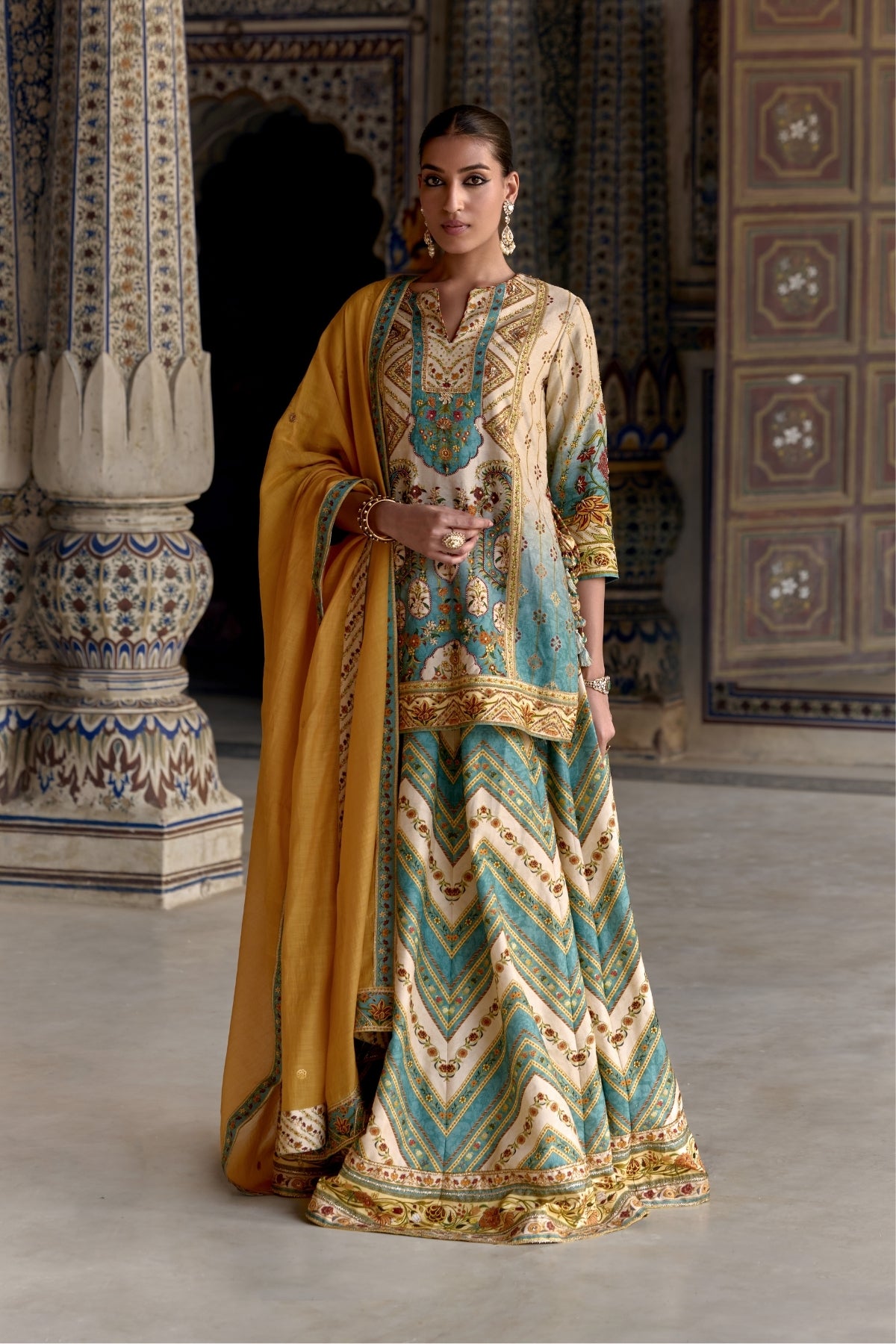 Radiate elegance in our captivating Rehmat Lehenga set.Classic Mughal inspired floral work on kurta and sharara accomplished by hand stitching.Designed with a v -neckline and paired with a contrasting dupatta.Perfect for Haldi and Mehendi Funtions.