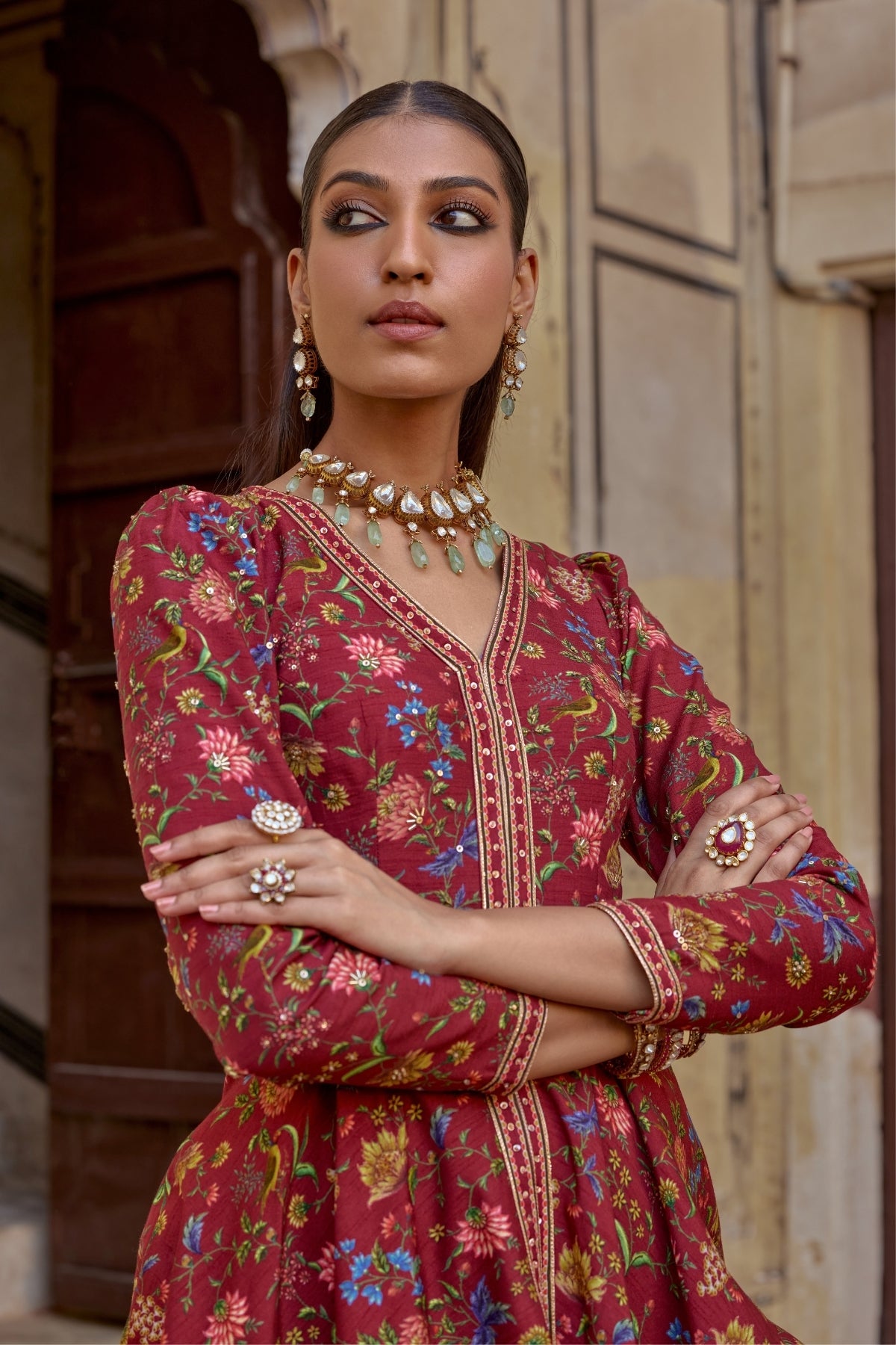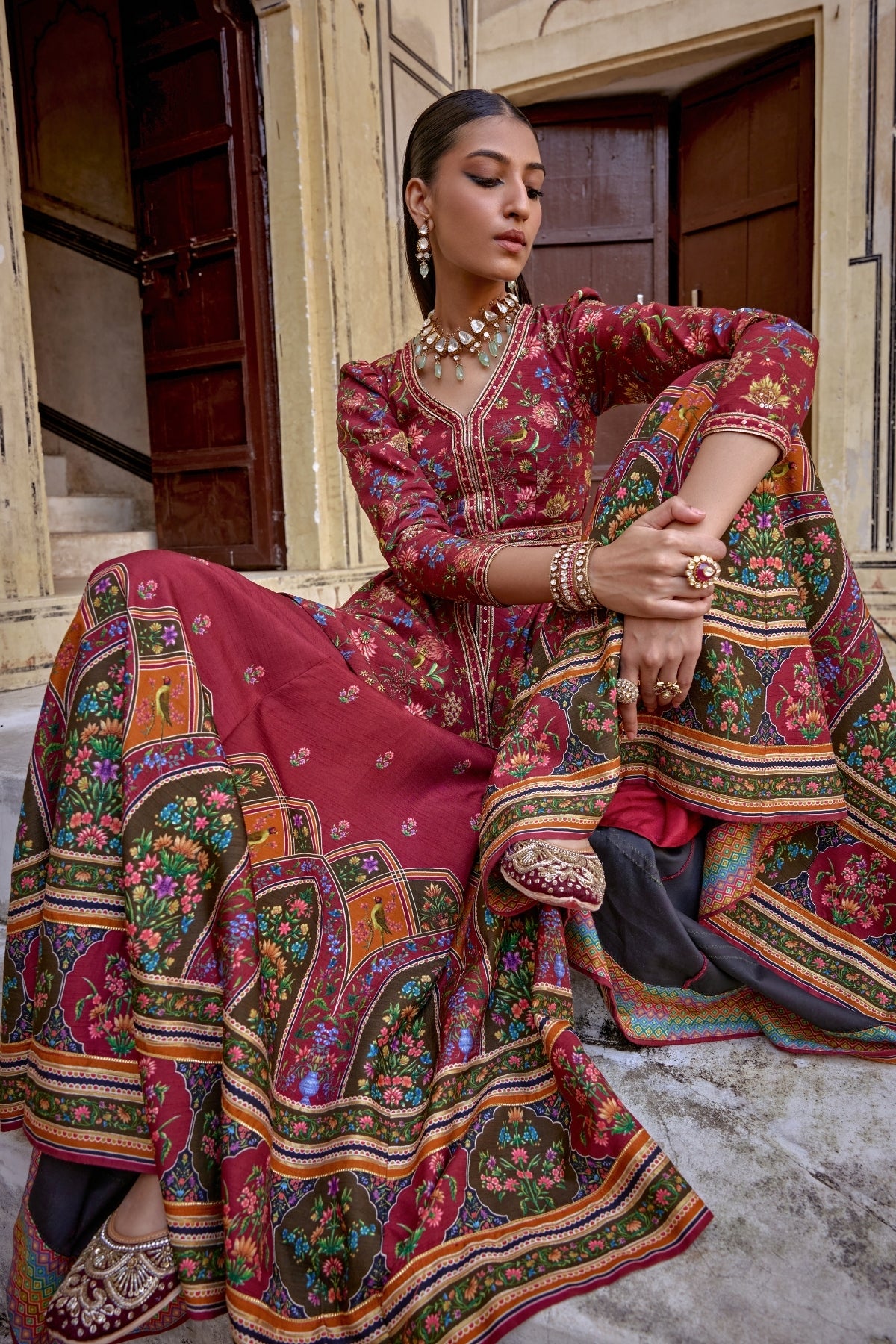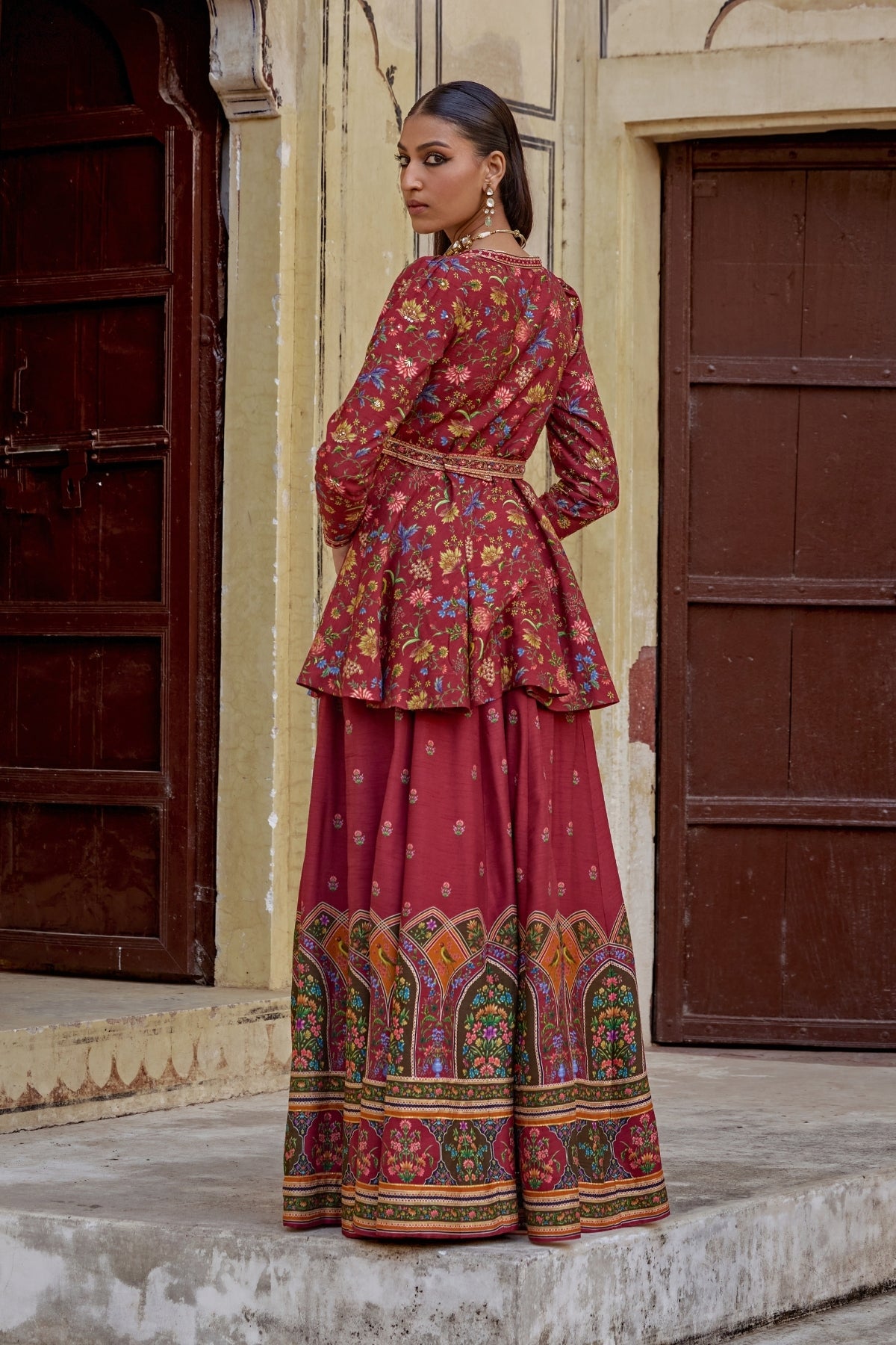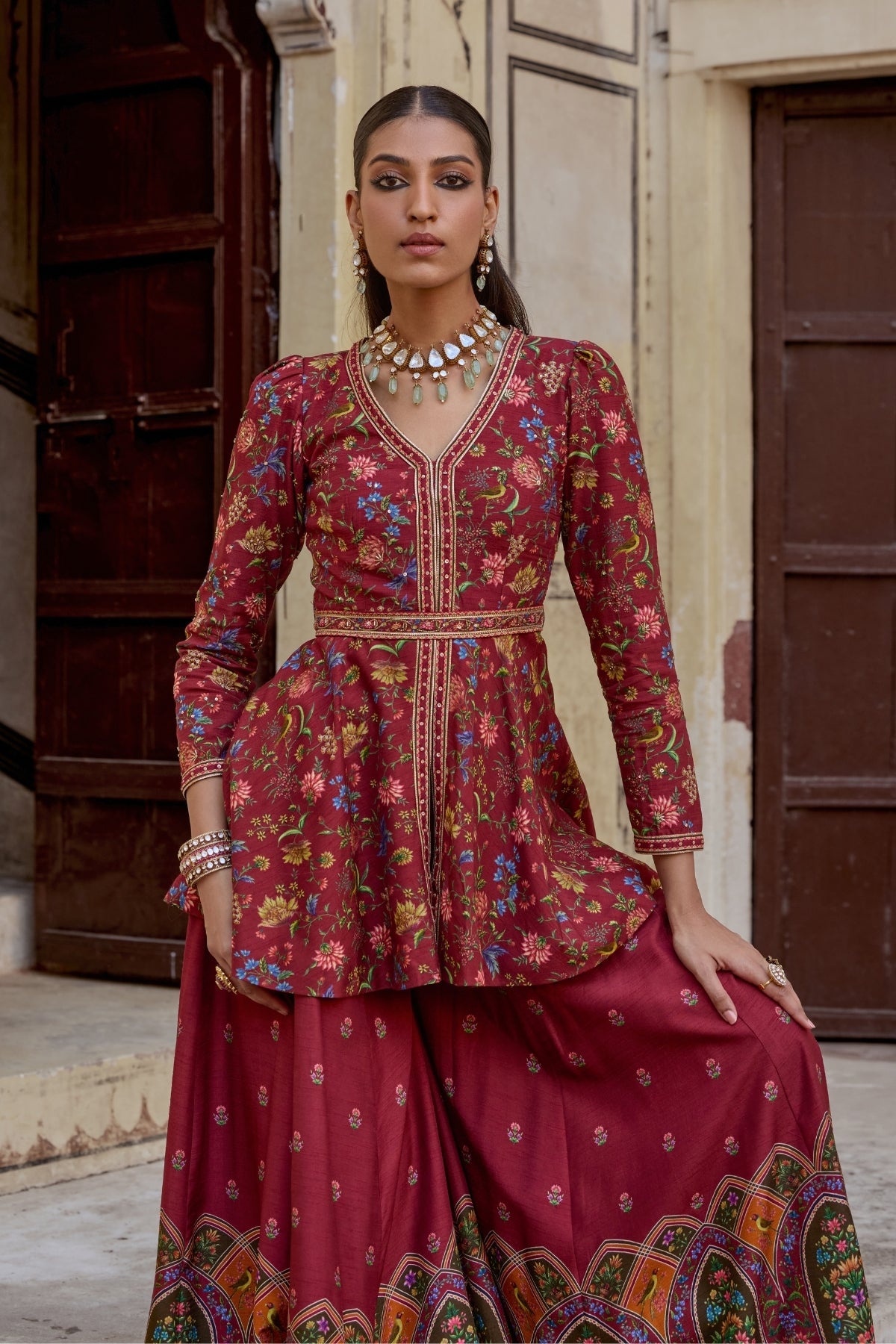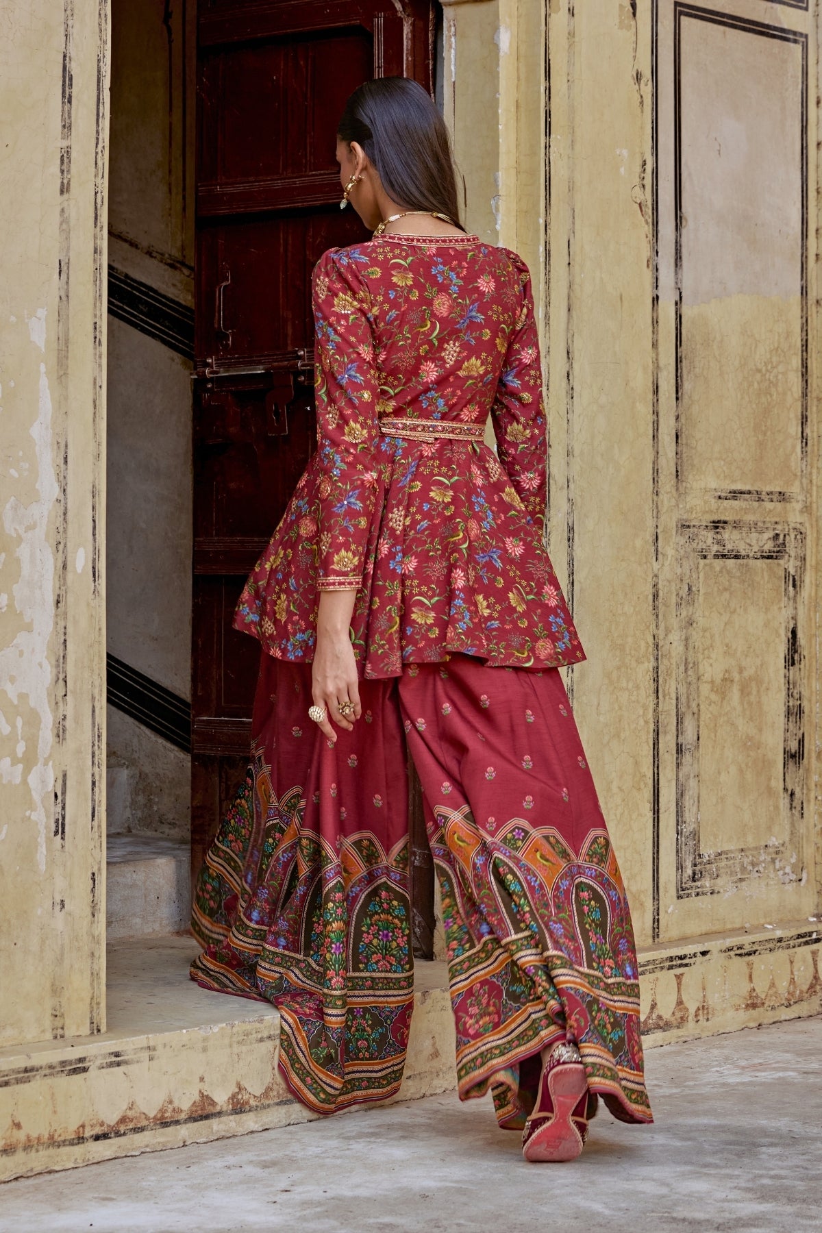 Featuring a short peplum kurta paired voluminous sharara. Perfect for festive fuss free look with an intricate embroidery on neckline.Mughal inspired paisley motifs all over on peplum and bottom of the sharara.Perfect for any Festive or wedding to make a style statement.