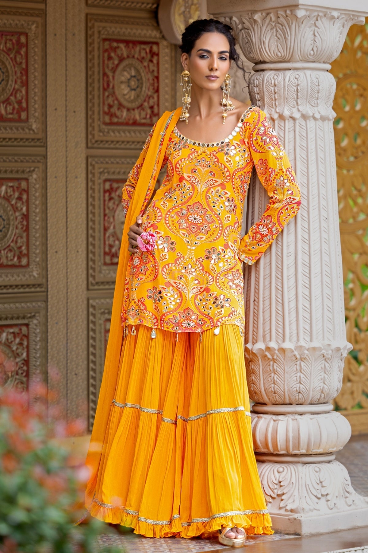 Description: Joy, unapologetically loud and luminous — this haldi yellow kurta set from Sajeda Lehry’s RAANGBAAZ collection captures the spirit of celebration in full bloom. The printed short kurta, designed with full sleeves and a daring deep back, is hand-embroidered with mirrors all over — shimmering with every gesture, every dance move, every moment of joy. It’s paired with flowy yellow georgette sharara pants and a matching dupatta, creating a silhouette that’s equal parts playful and poetic. Made for the bride (or her bold best friend) who doesn’t whisper through her wedding but lives it out loud — this is not a quiet bridal collection. This is RAANGBAAZ.